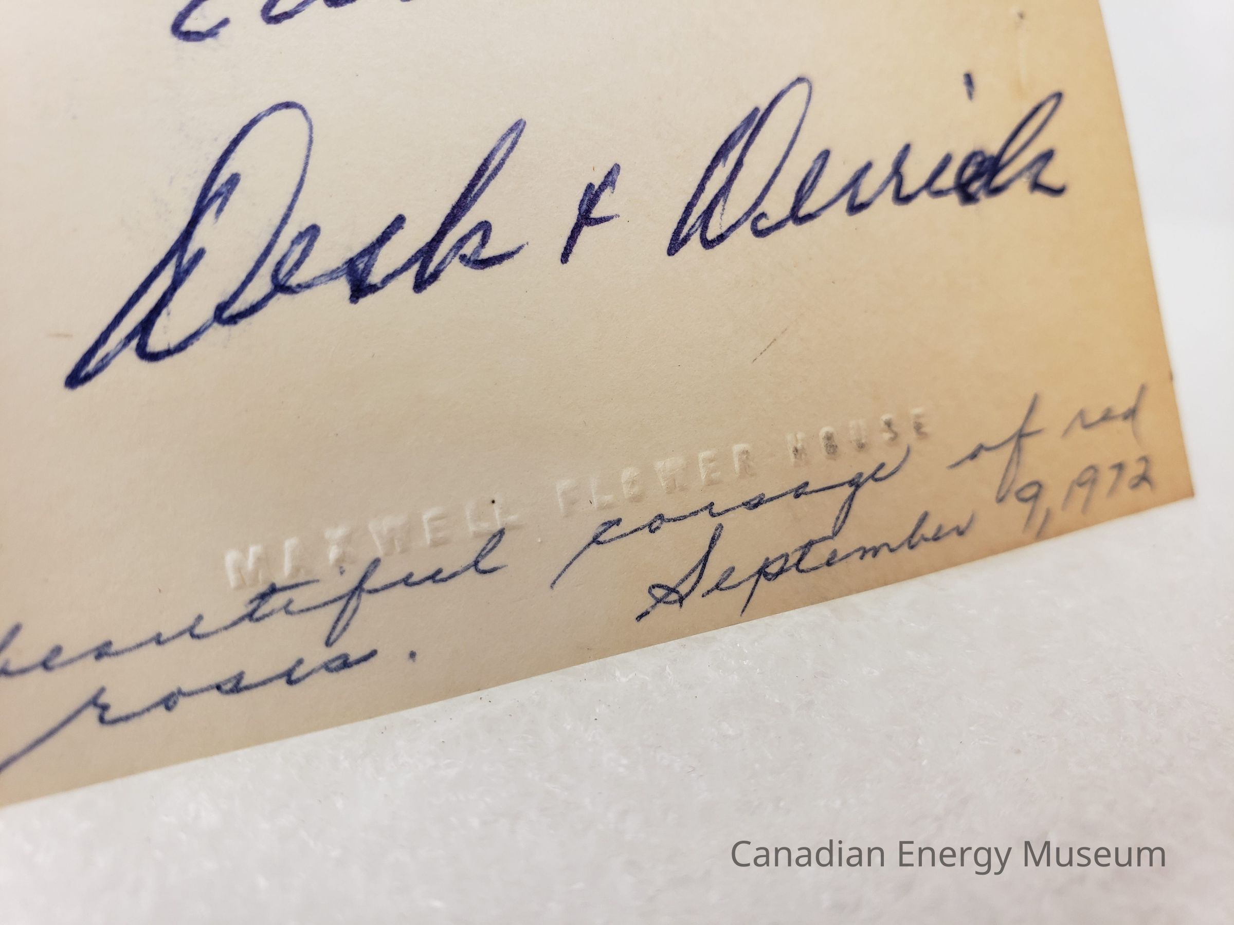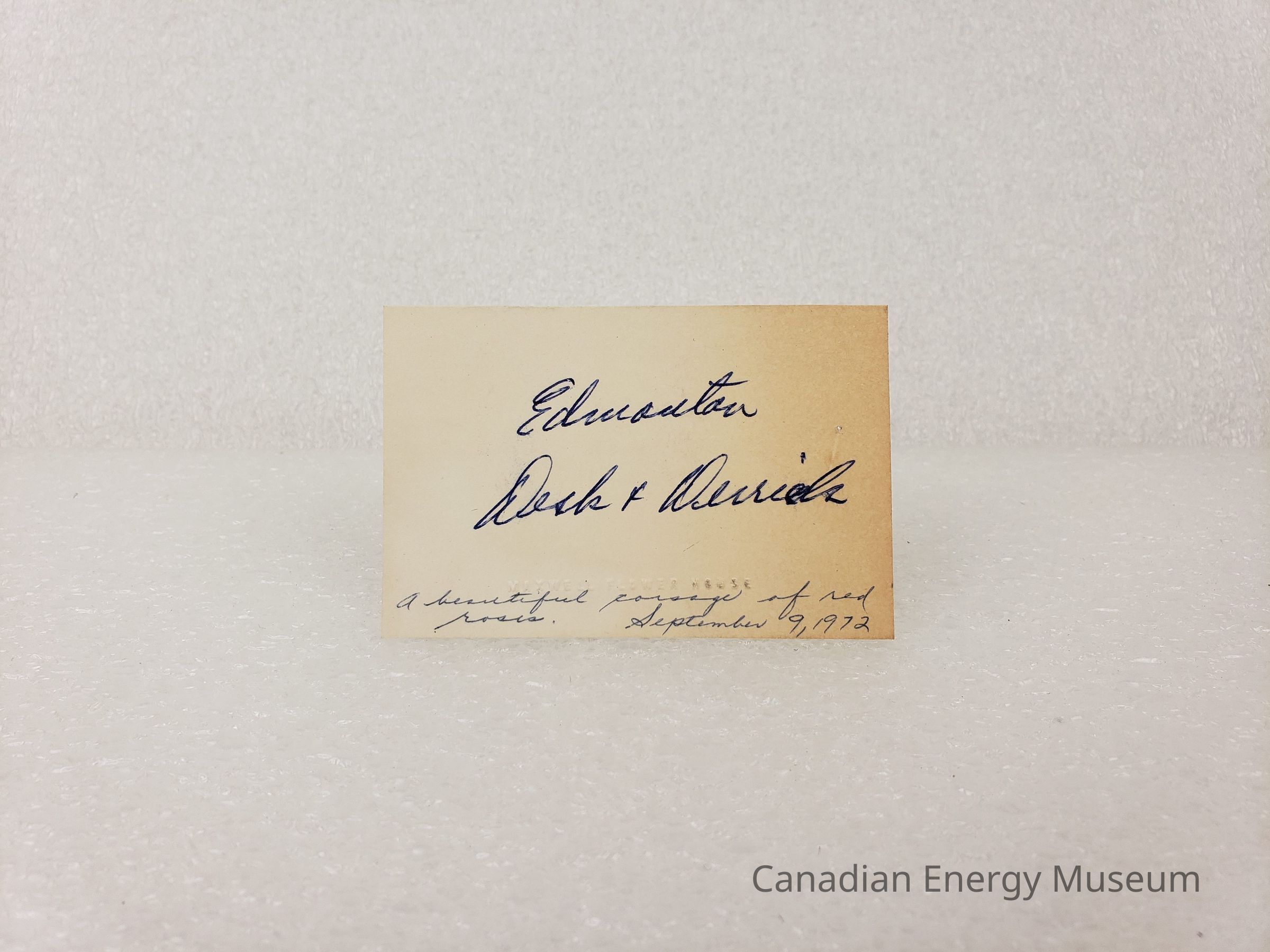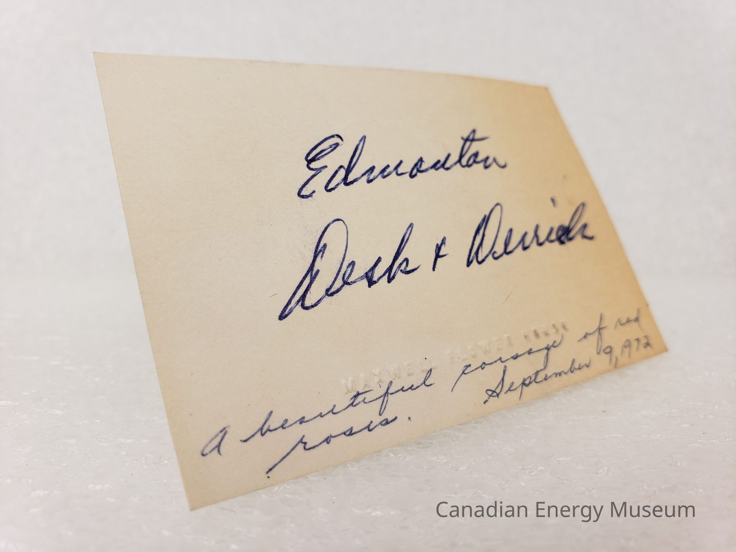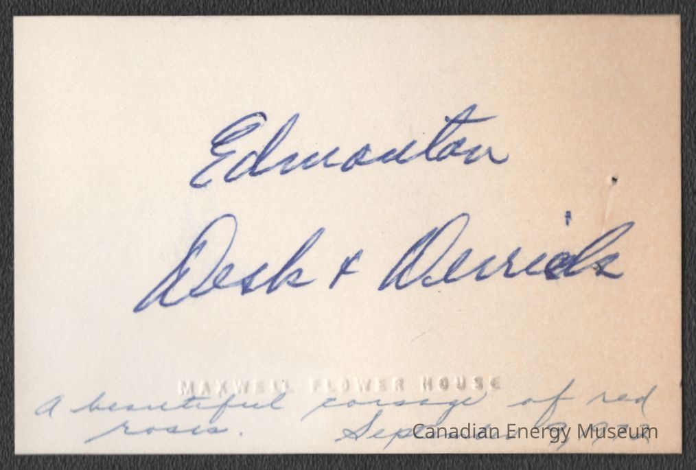 A notecard branded to Maxwell Flower House, with handwritten text on it. The text reads "Edmonton Desk & Derrick" in blue ballpoint in the centre, and "A beautiful corsage of red roses. September 9, 1972" in blue ballpoint along the bottom.