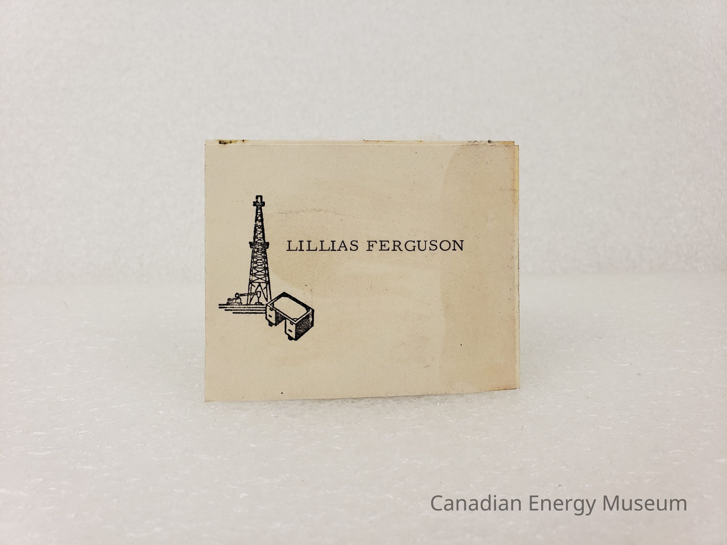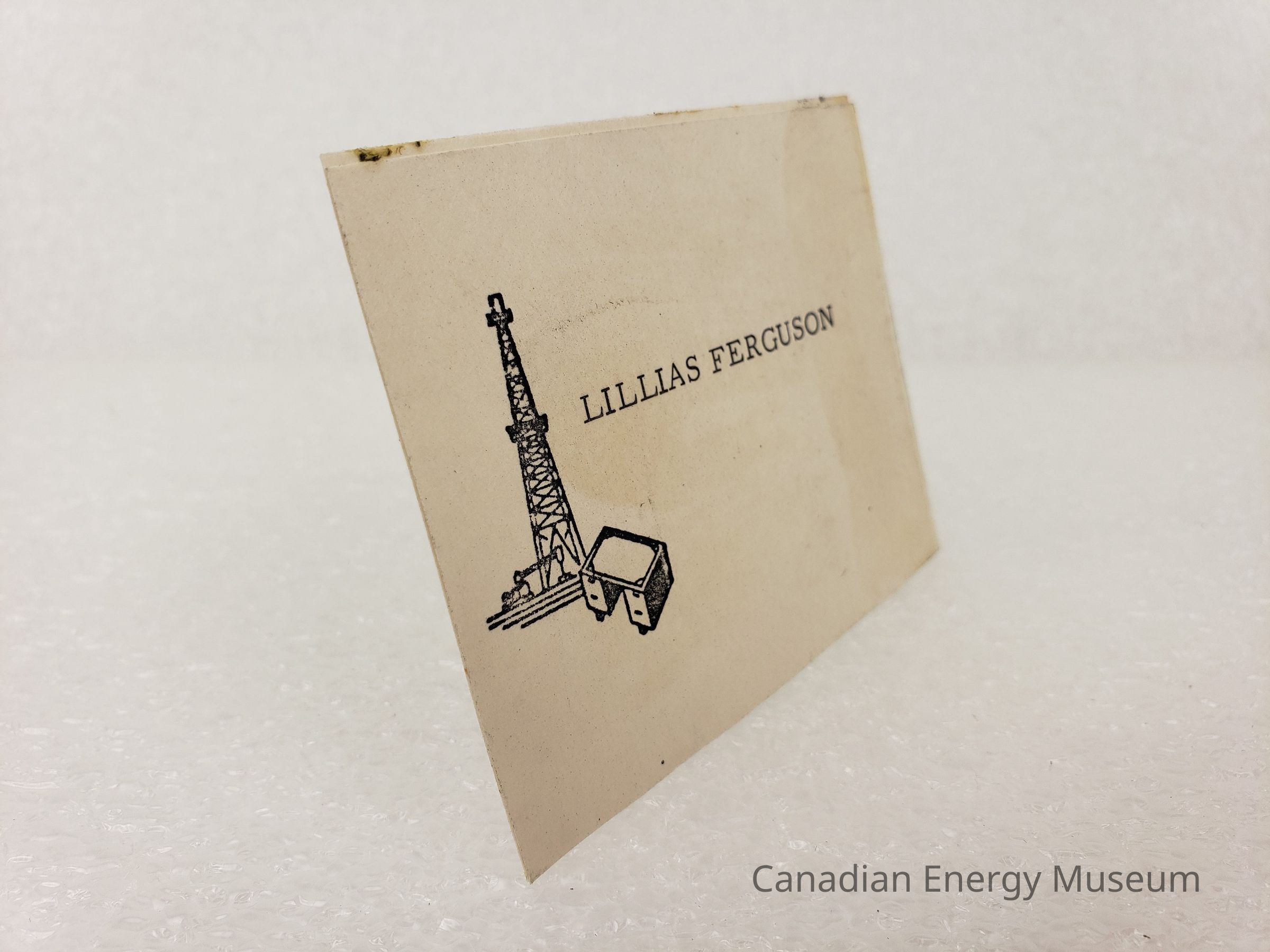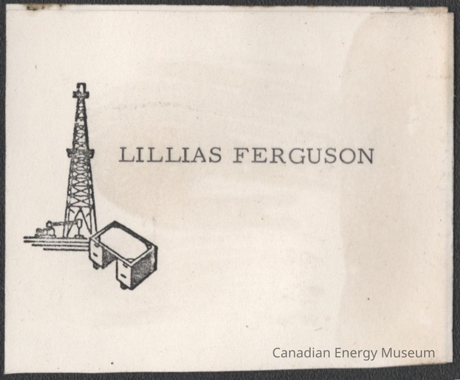 A note card with the Association of Desk and Derrick Clubs logo (illustration of a desk and a derrick) stamped in black ink, with "LILLIAS FERGUSON" typewritten in black ink. Card is roughly cut and adhered to a second piece of white card.