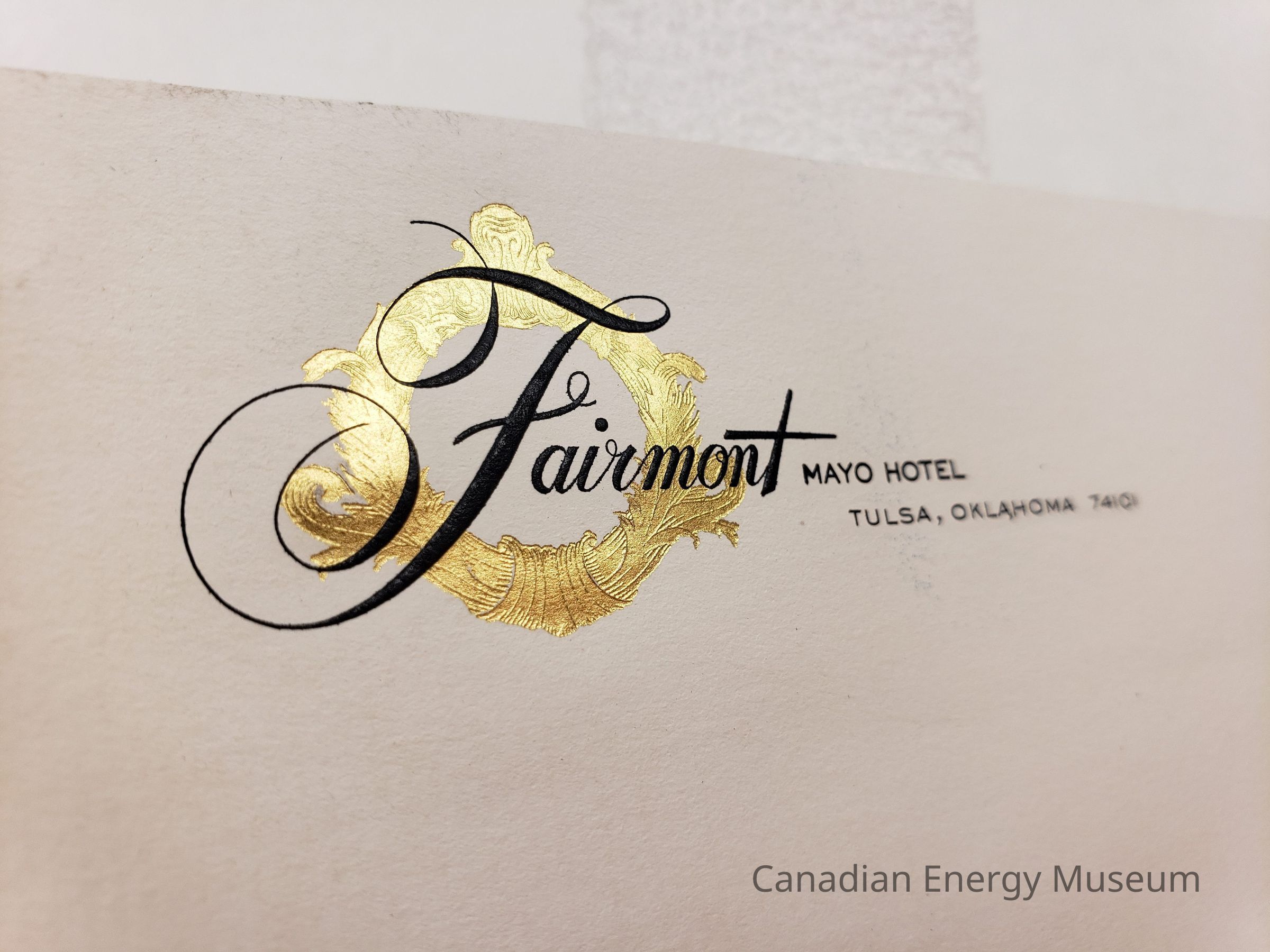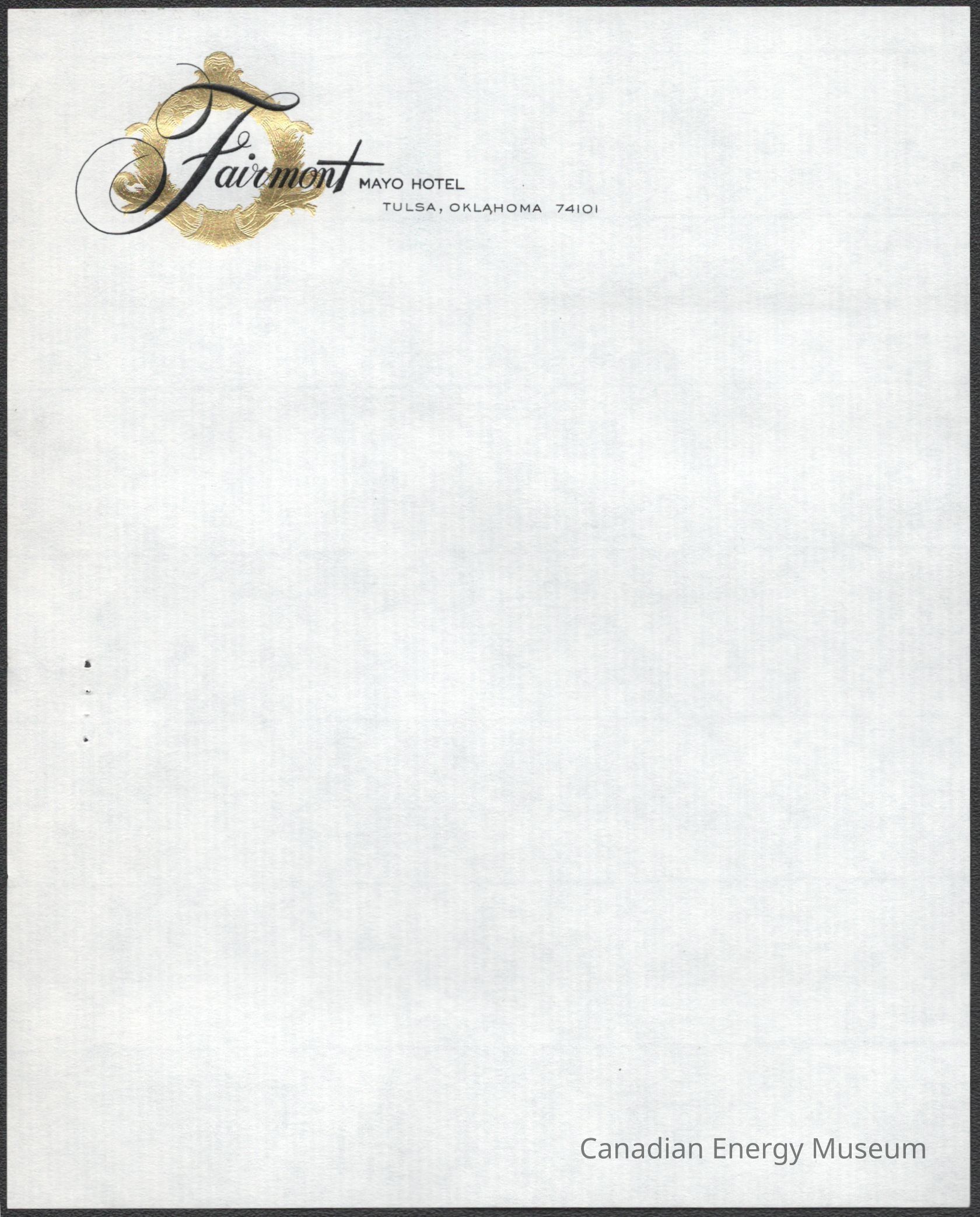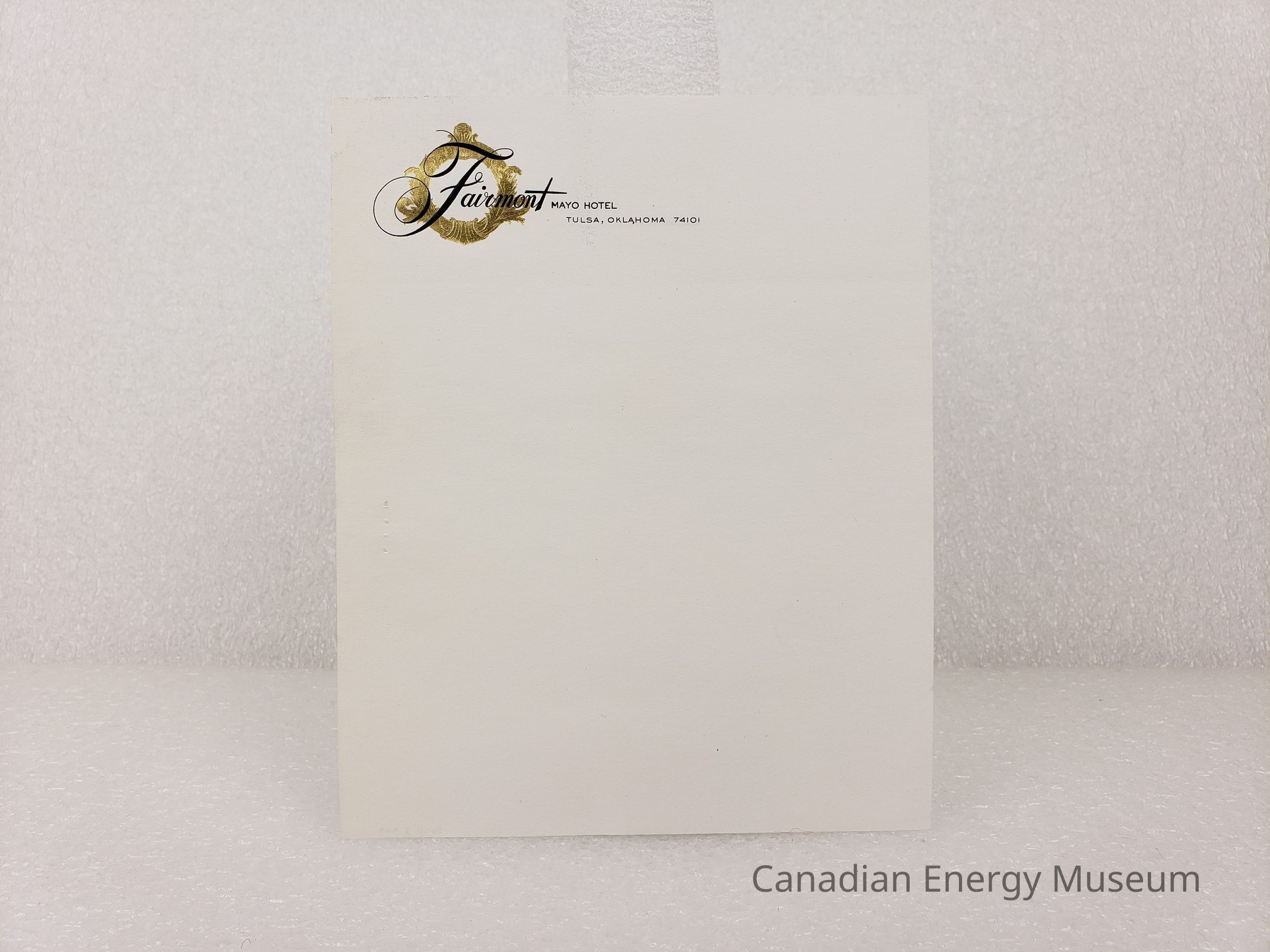 A branded sheet of note paper, from the Fairmont Mayo Hotel, Tulsa Oklahoma. Hotel logo printed in the top-left corner, with black print text and gold-foil decorative wreath design. Unused. Likely originally paired with a matching envelope in the collection (2004.2.347).