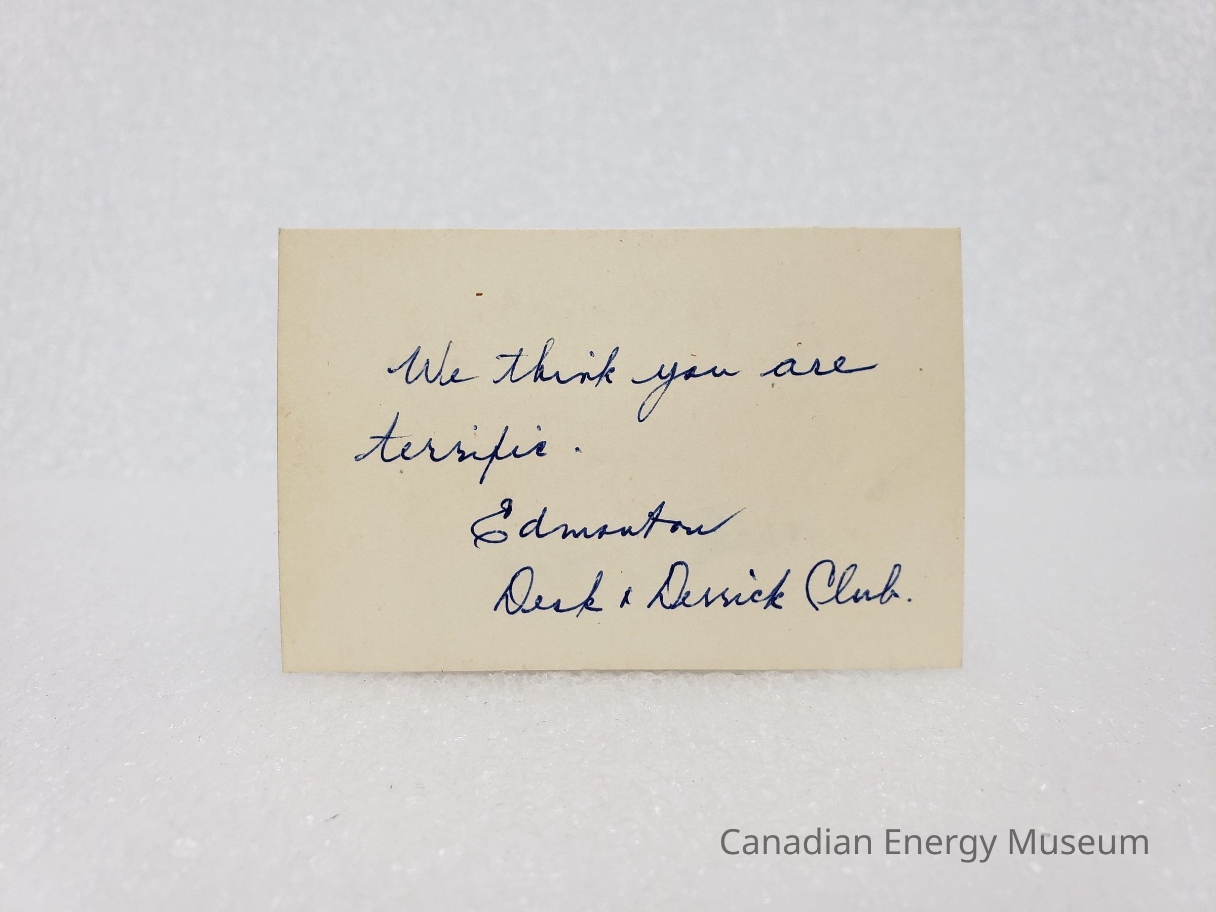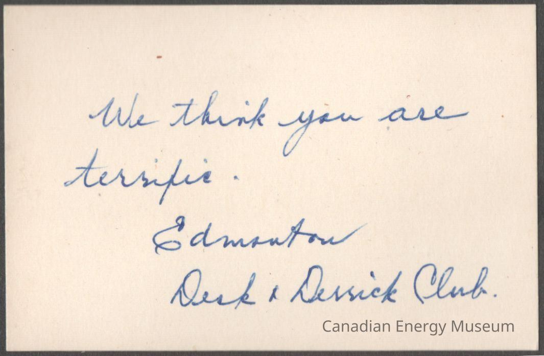A small note card / bouquet card, addressed to Lillias Ferguson. Handwritten in blue ballpoint is "We think you are terrific; Edmonton Desk & Derrick Club". Nothing on Reverse