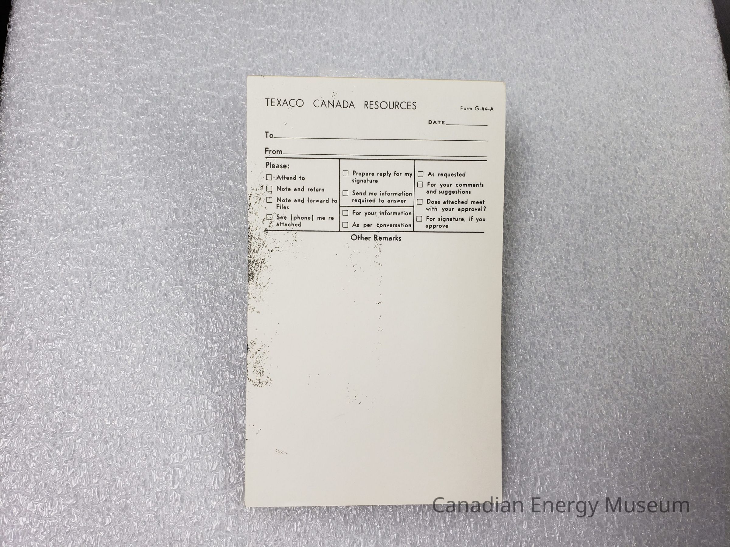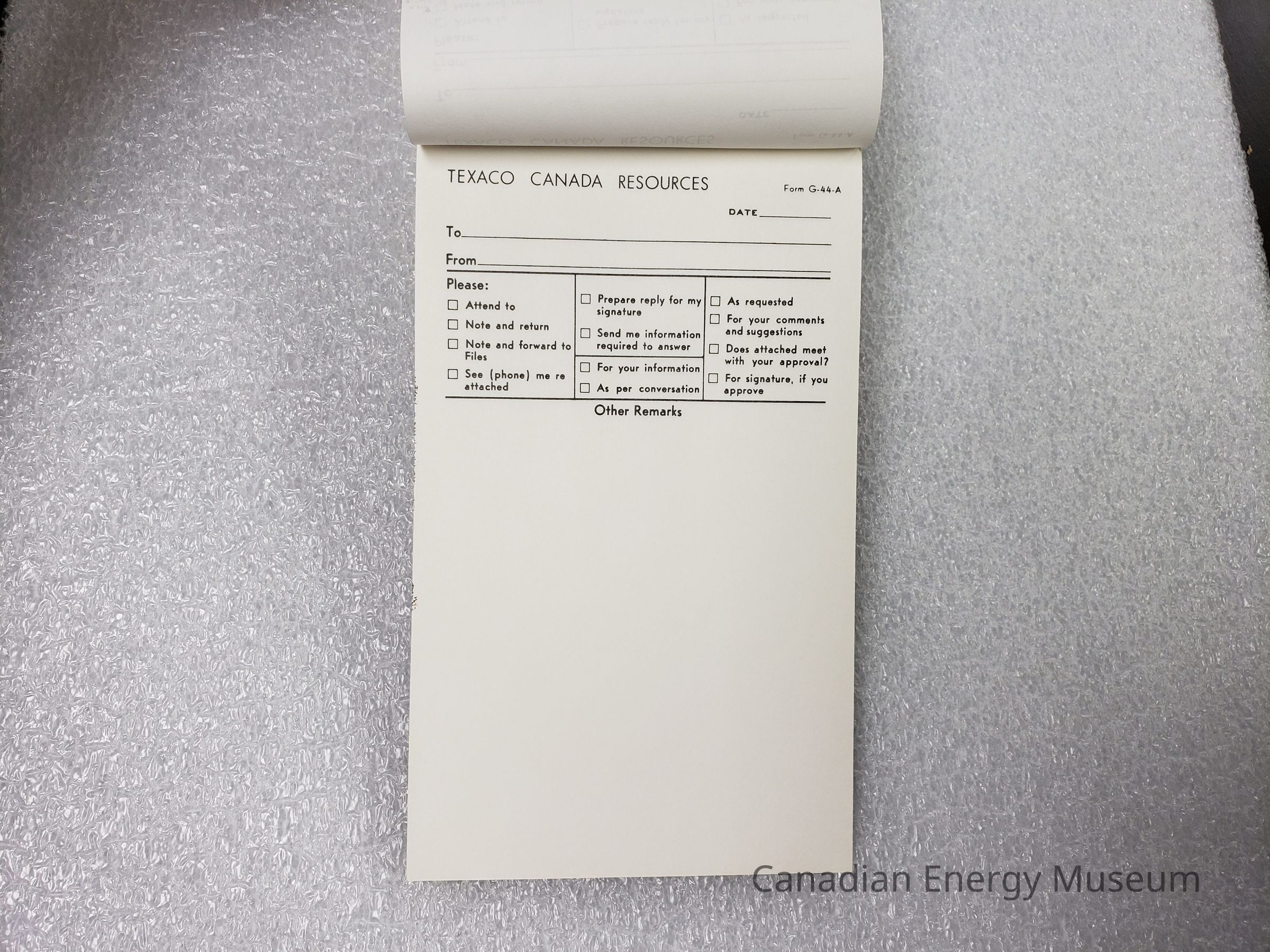 Tear-off notepad (memo pad) with custom printing by Texaco for use in document sharing. Form # G-44-A