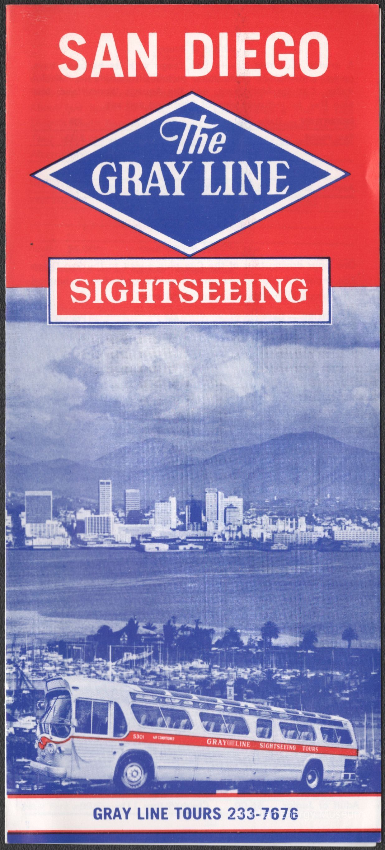 A pamphlet for The Grey Line Sightseeing, San Diego. Includes routes and schedules.