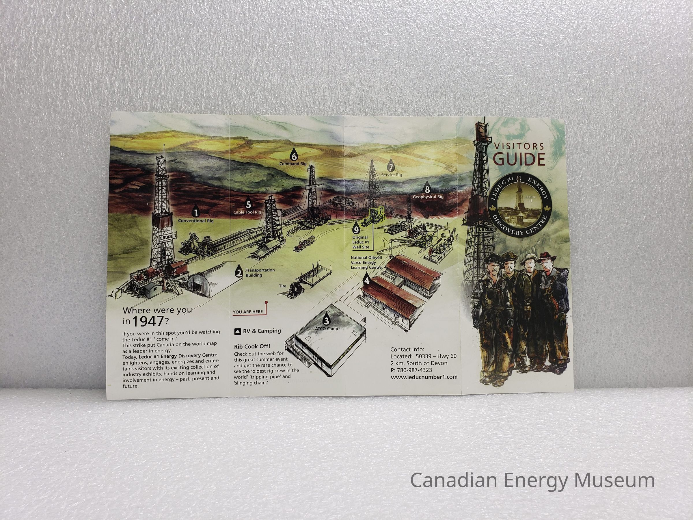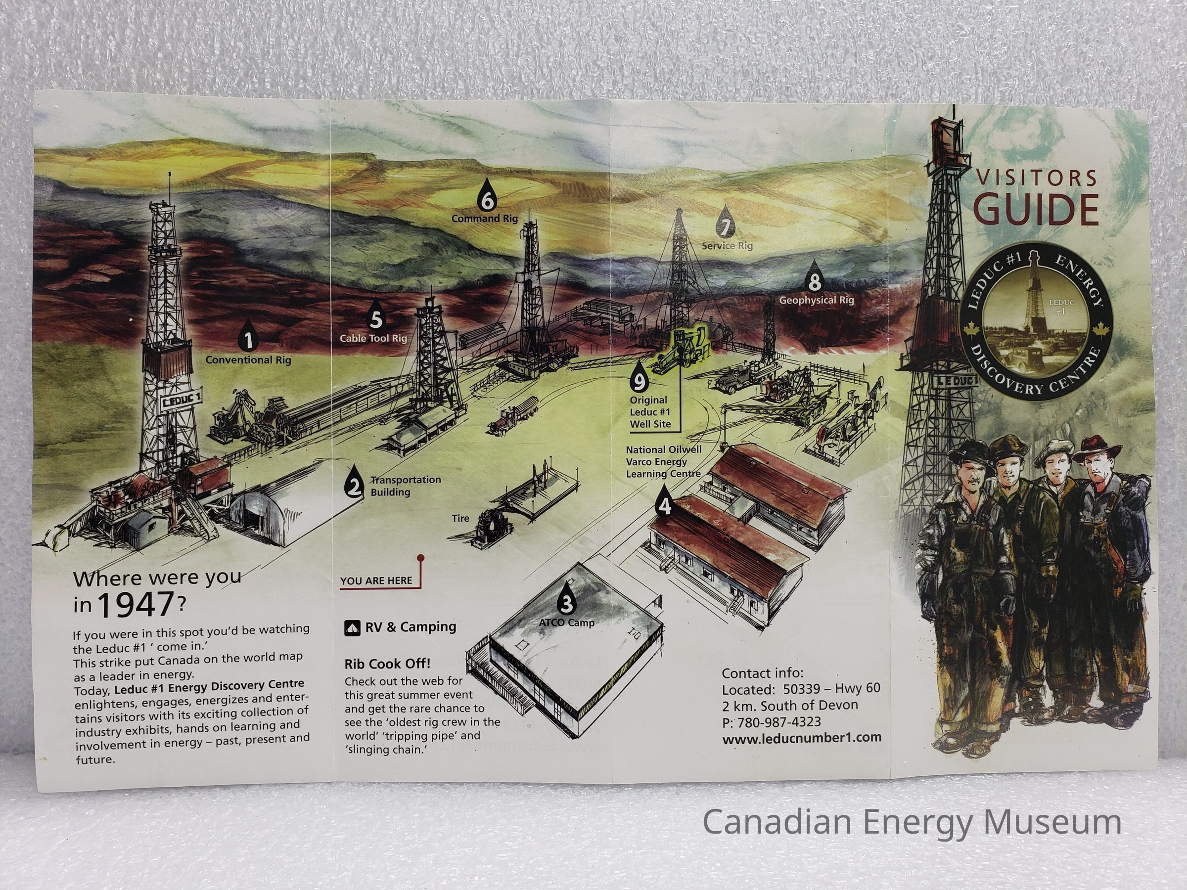 A 4-fold, double-sided colour "Visitor Guide" pamphlet for the Leduc #1 Energy Discovery Centre. Includes maps of the grounds and the museum galleries (sketchy illustrations), and text panels titled "Where were you in 1947?" and "Rib Cook Off!".Collection