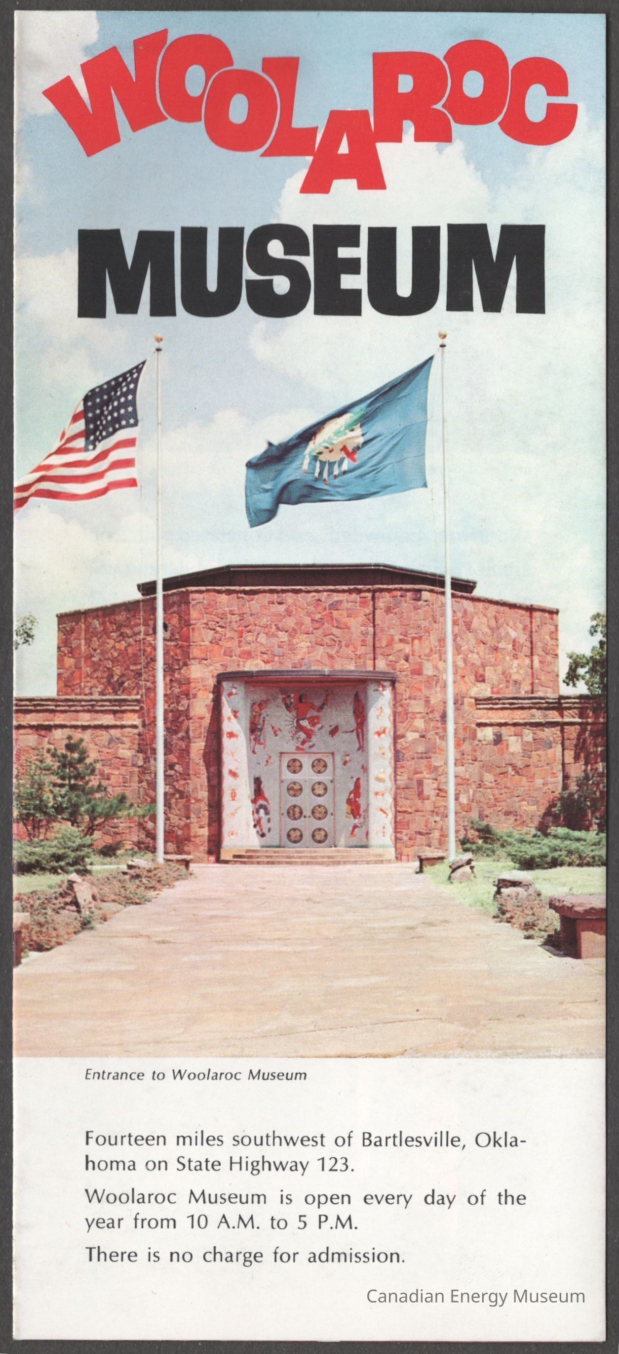 A pamphlet for the Woolaroc Museum, Bartlesville, Oklahoma. Features a history of the museum and admission information.