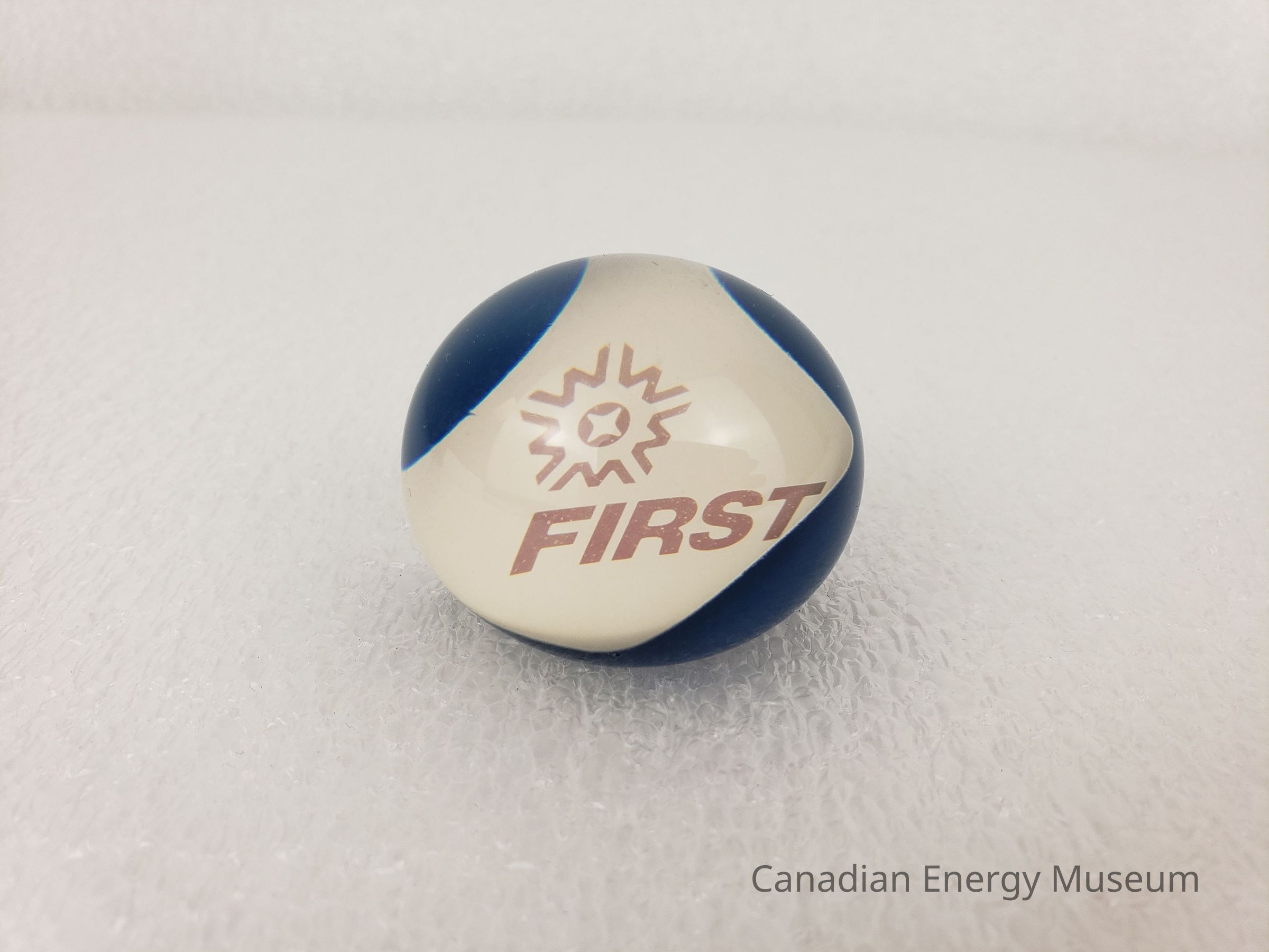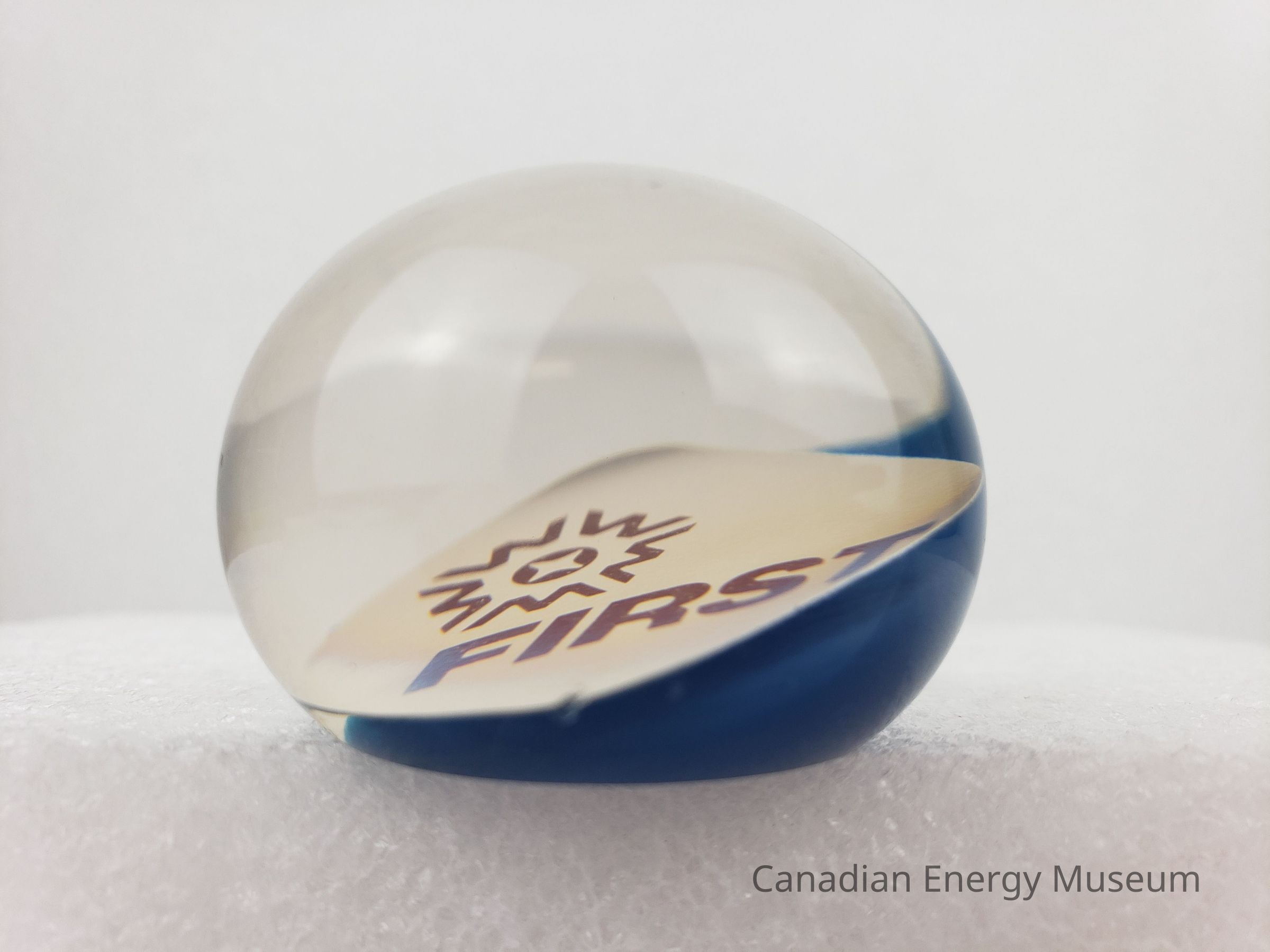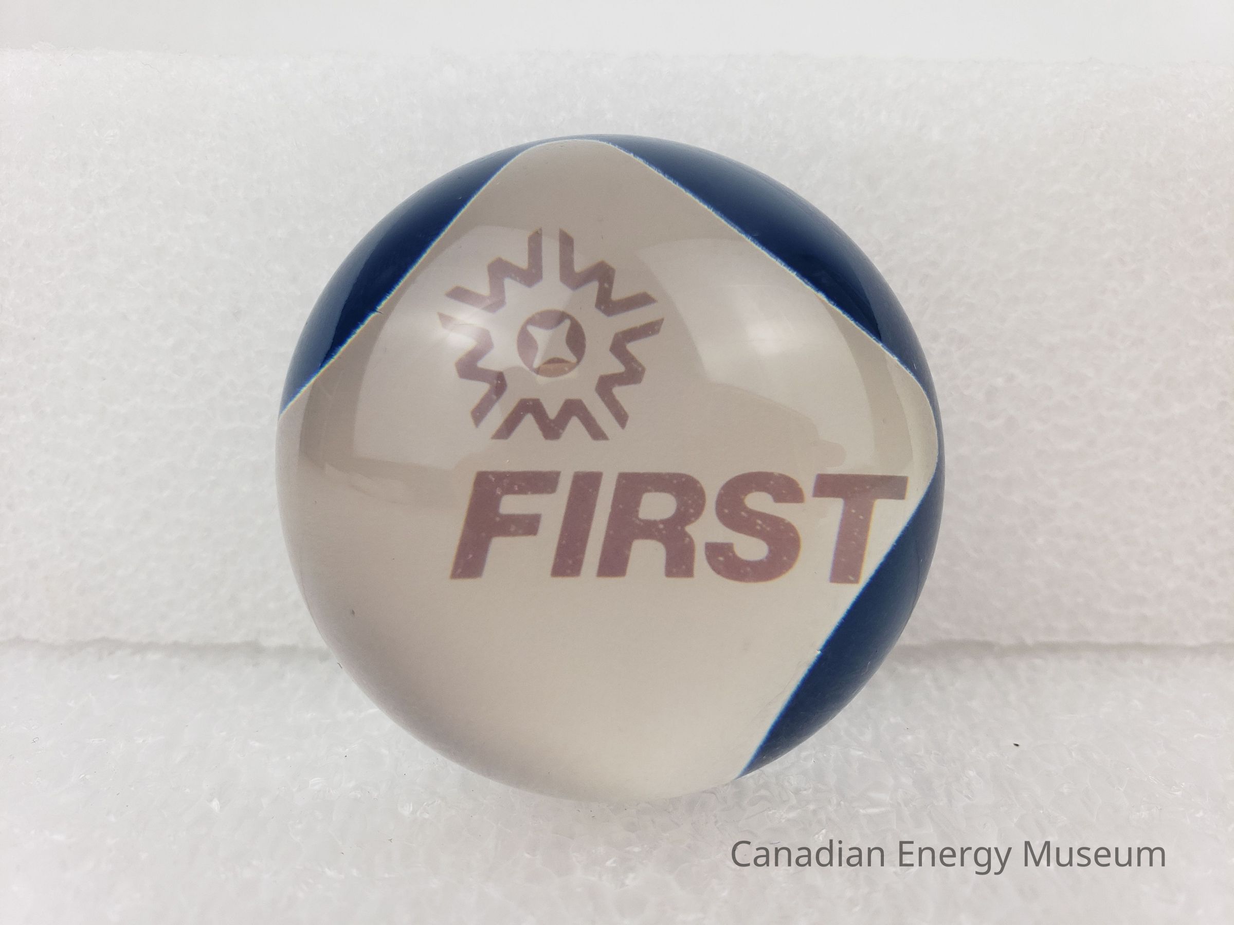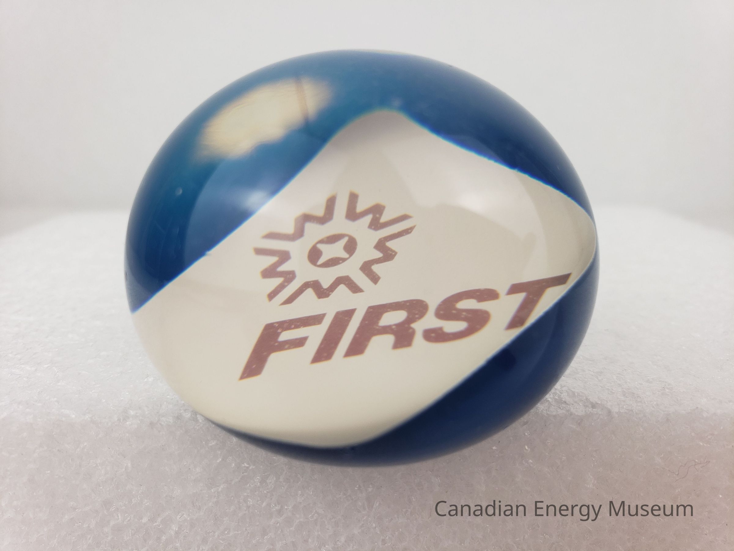 Design: A small, round resin paperweight, containing a square of printed paper. The paper is white with rounded corners, and the red rext "FIRST" with the brand star logo above to the left. The paper is towards the bottom of the paperweight, placed at an angle, and with blue-coloured resin just below. The shape is slightly squished, with a flat bottom.Collection
