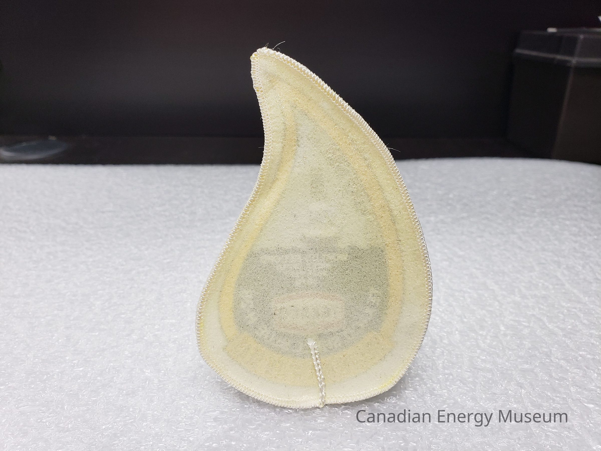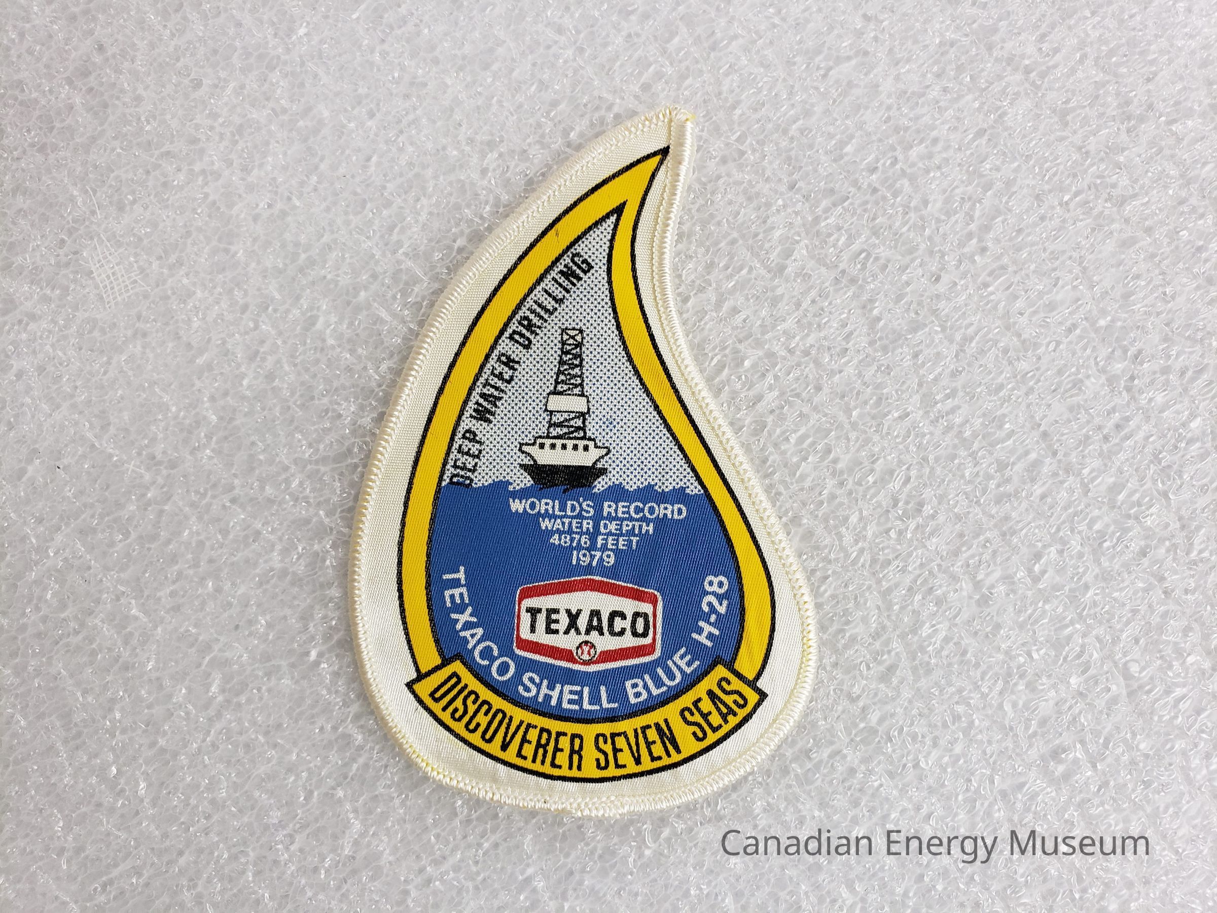 Features: The patch is shaped like a drop, with a right-curving tail. The border is embroidered with white thread, and base is a white-coloured fabric. Printed inside the embroidered border is a printed design of the same shape. Around the outside of the print is a double black line, filled with yellow. At the base of which is a curved ribbon with the black text: "DISCOVERER SEVEN SEAS". Inside the printed border is a fill of blue designed like the see and sky (solid blue bottom half and lighter dot-shaded blue top, divided by a wave shape). In the top half is a black line illustration of a deep sea rig, to the left-centre. Black text shaped to the curve of the print border, upper-left, reads: "DEEP WATER DRILLING." In white text in the centre reads: "WORLD'S RECORD WATER DEPTH 4876 FEET 1979". The elongated hexagonal Texaco logo is in the lower-centre, below which in curved white text reads: "TEXACO SHELL BLUE H-28".Collection
