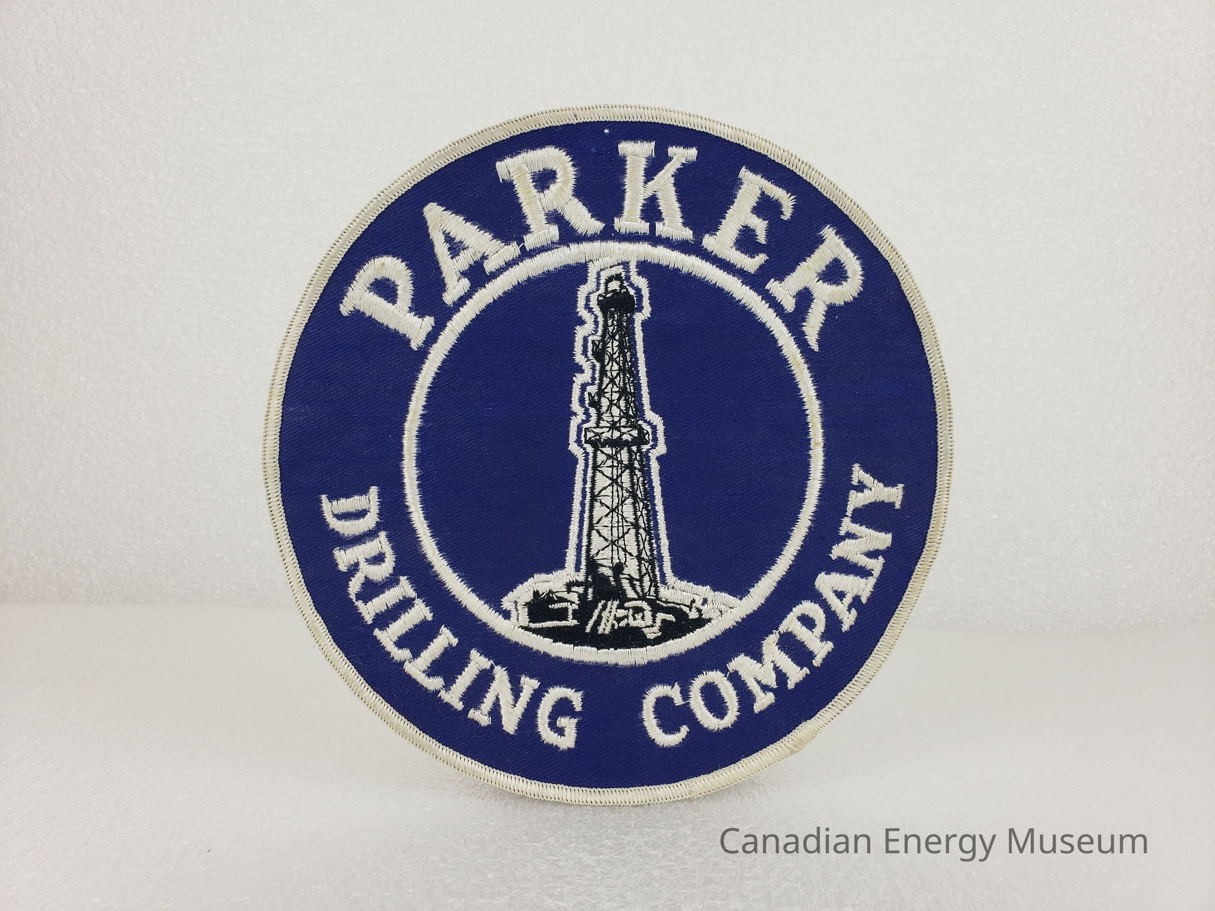 Design: A large, round patch with embroidered details. Design elements include: A deep-blue base; embroidered white edge; an inner white ring; the text "PARKER" curved at the top between the border and inner ring; the text "DRILLING COMPANY" curved at the bottom between the border and inner ring; an illustration of an oil derrick inside the inner ring with black details and a white outline.