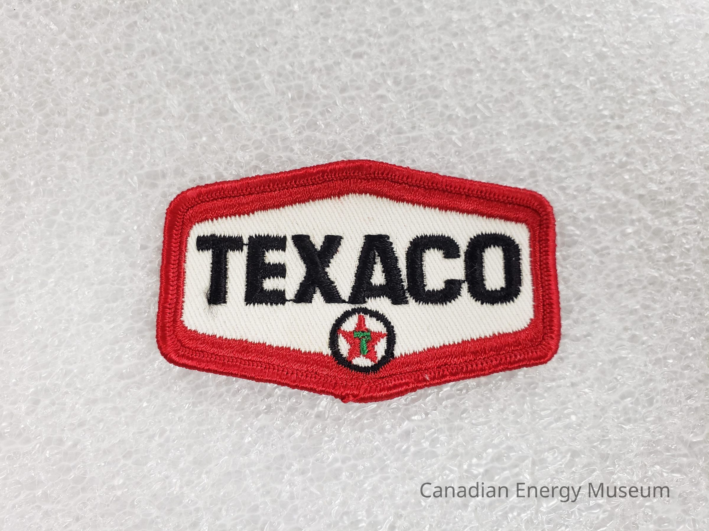 Features: Elongated hexagon shape, 3D embroidered border (red) with white interior. Flat embroidery inside: Inner border (red), text: TEXACO" (black), round Texaco logo on inside of bottom point.Collection