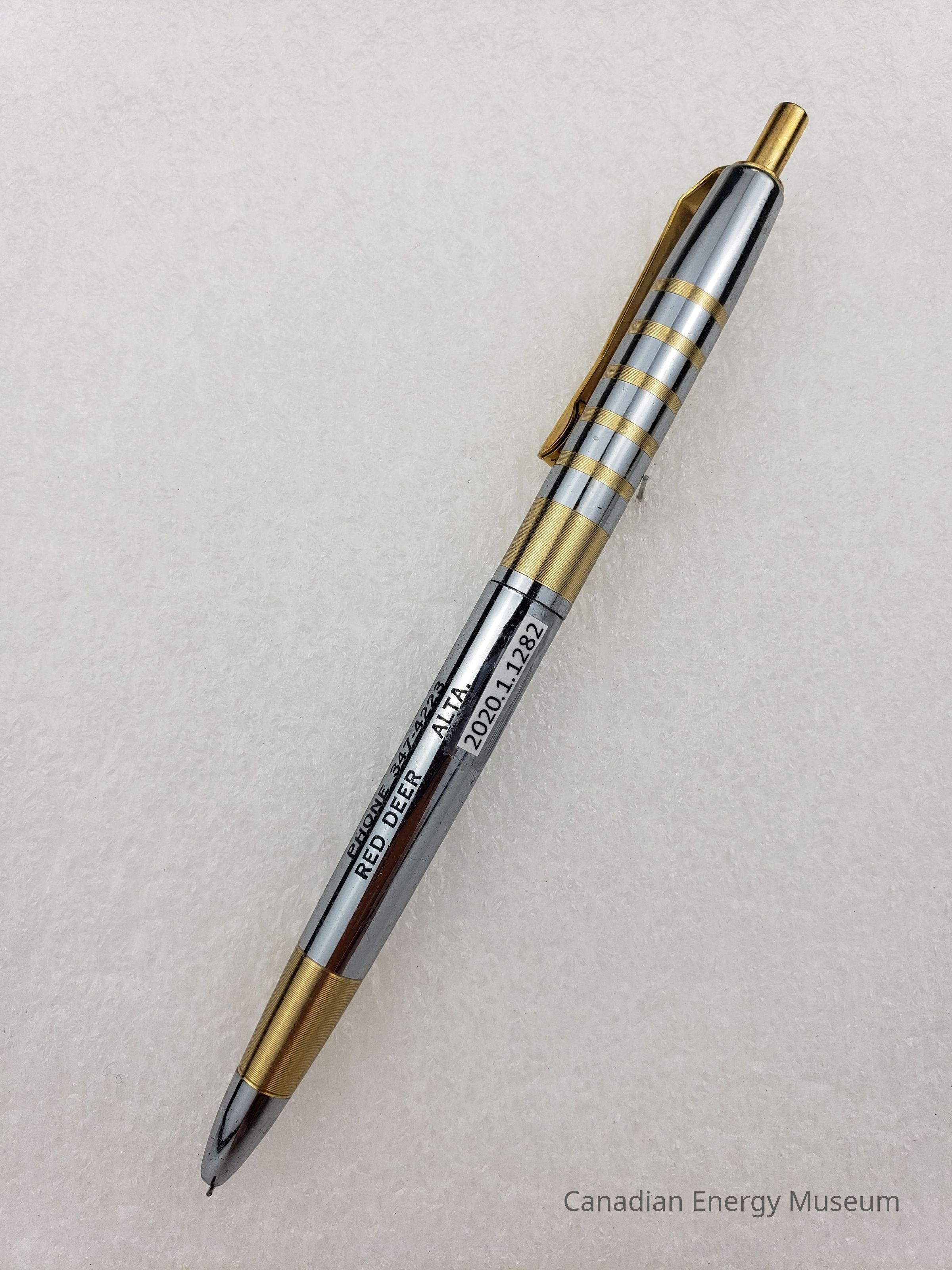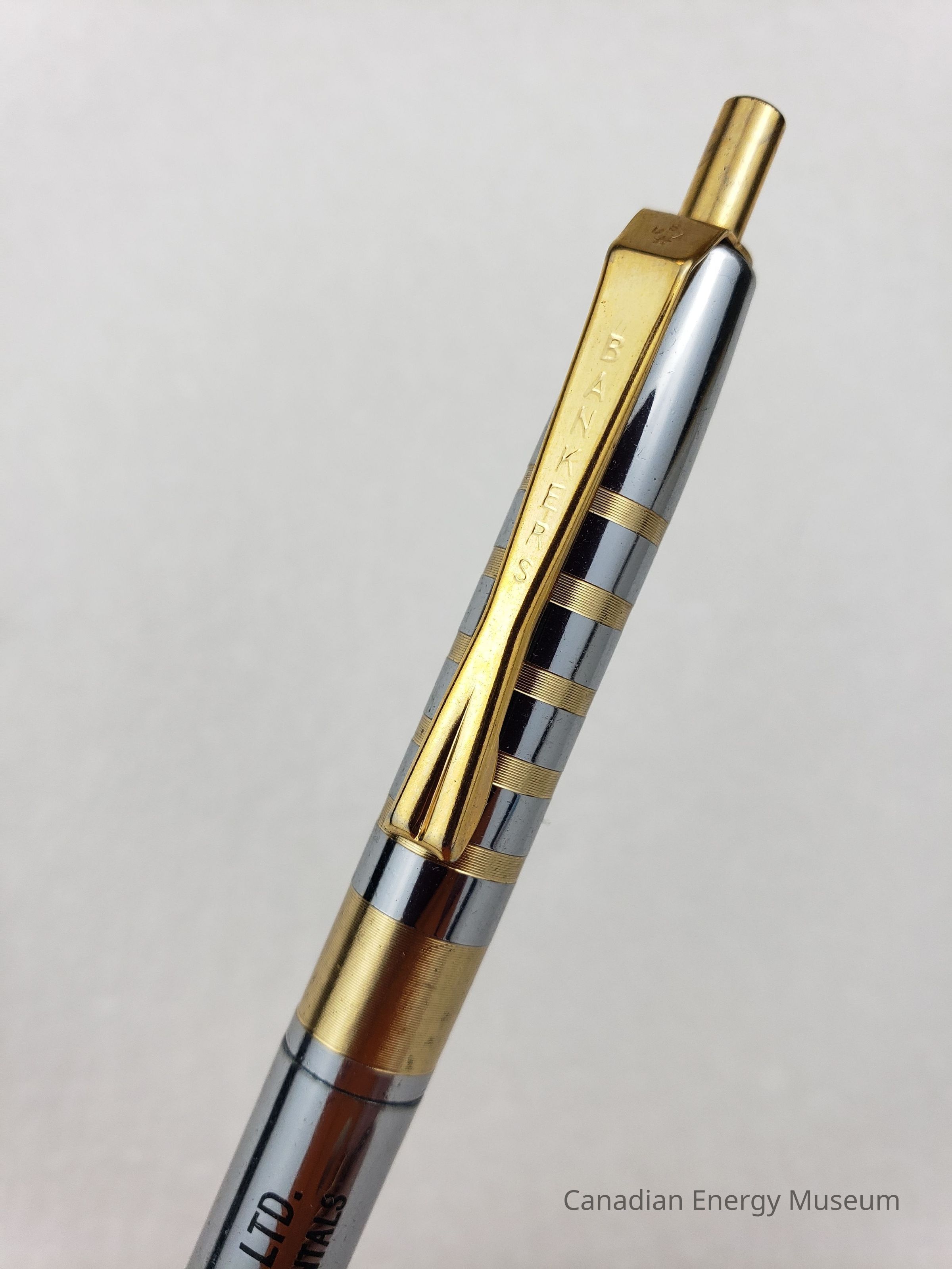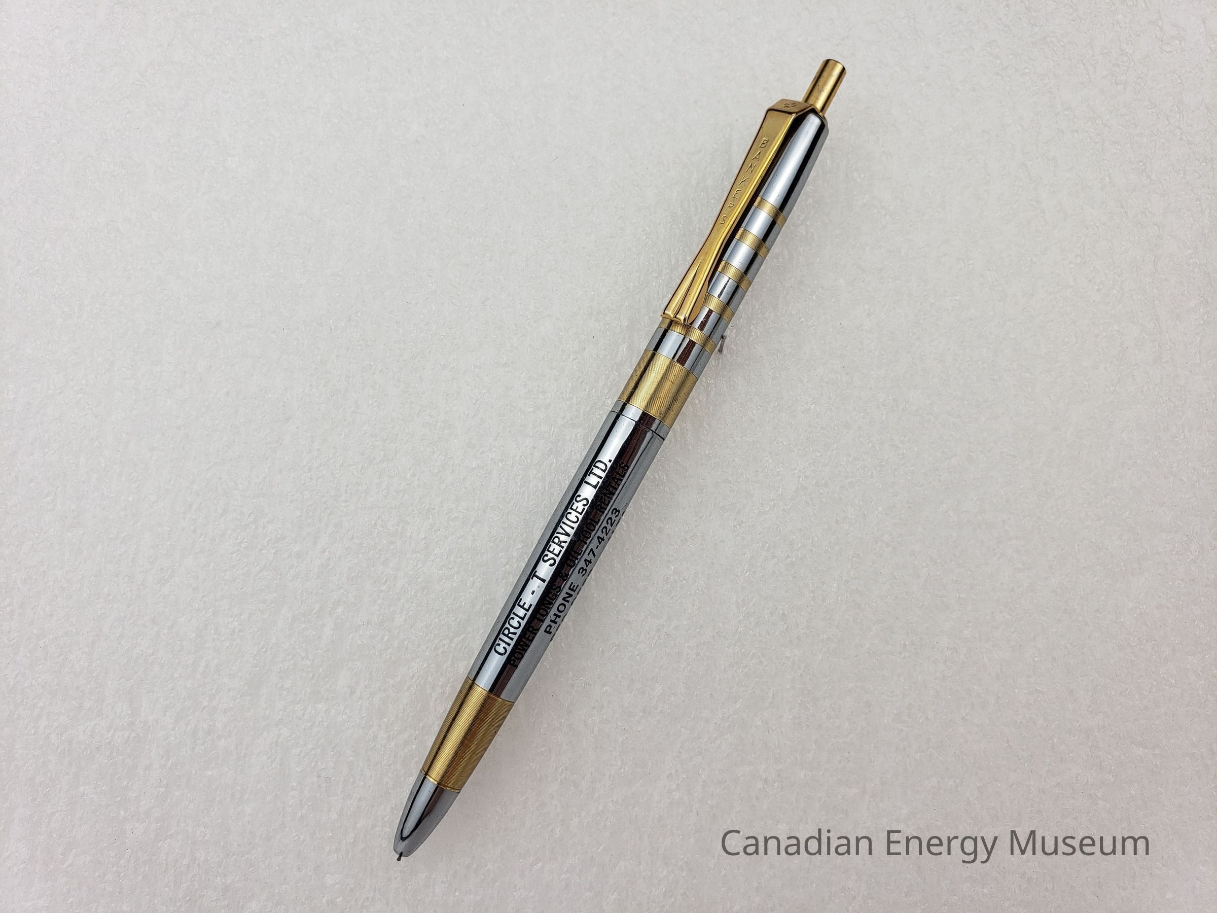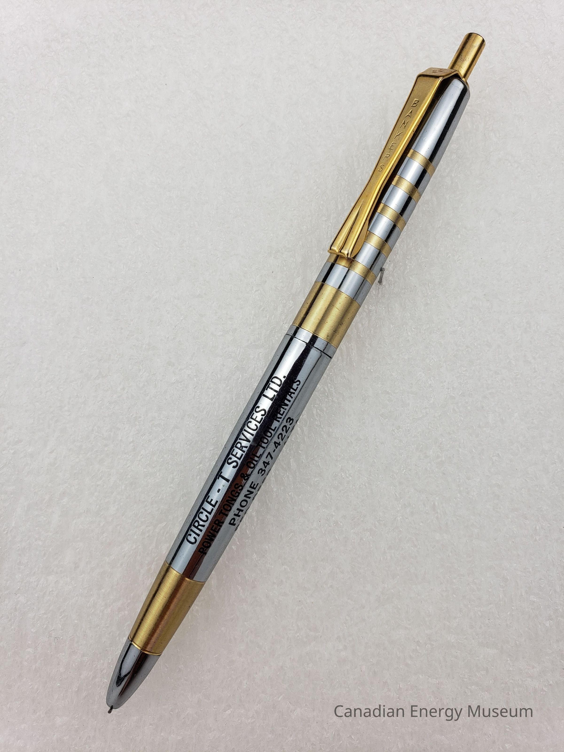 Pen: A retractable ballpoint pen, with a metal body, clip, and a retracting mechanisma at the end. The base colour of the body is a silver metal, with gold-coloured bands of varying thickness. The bottom section of the pen has on broad gold bands near the pen top, and the black text "CIRCLE-T SERVICE LTD.; POWER TONGS & OIL TOOL RENTALS; PHONE 347-4223; RED DEER ALTA". The top section has a broader band at the base with five thinner bands in the centre. The clip is gold-coloured and reads "BANKERS". The retractions mechanisma is a gold-coloured button on the end of the pen.
