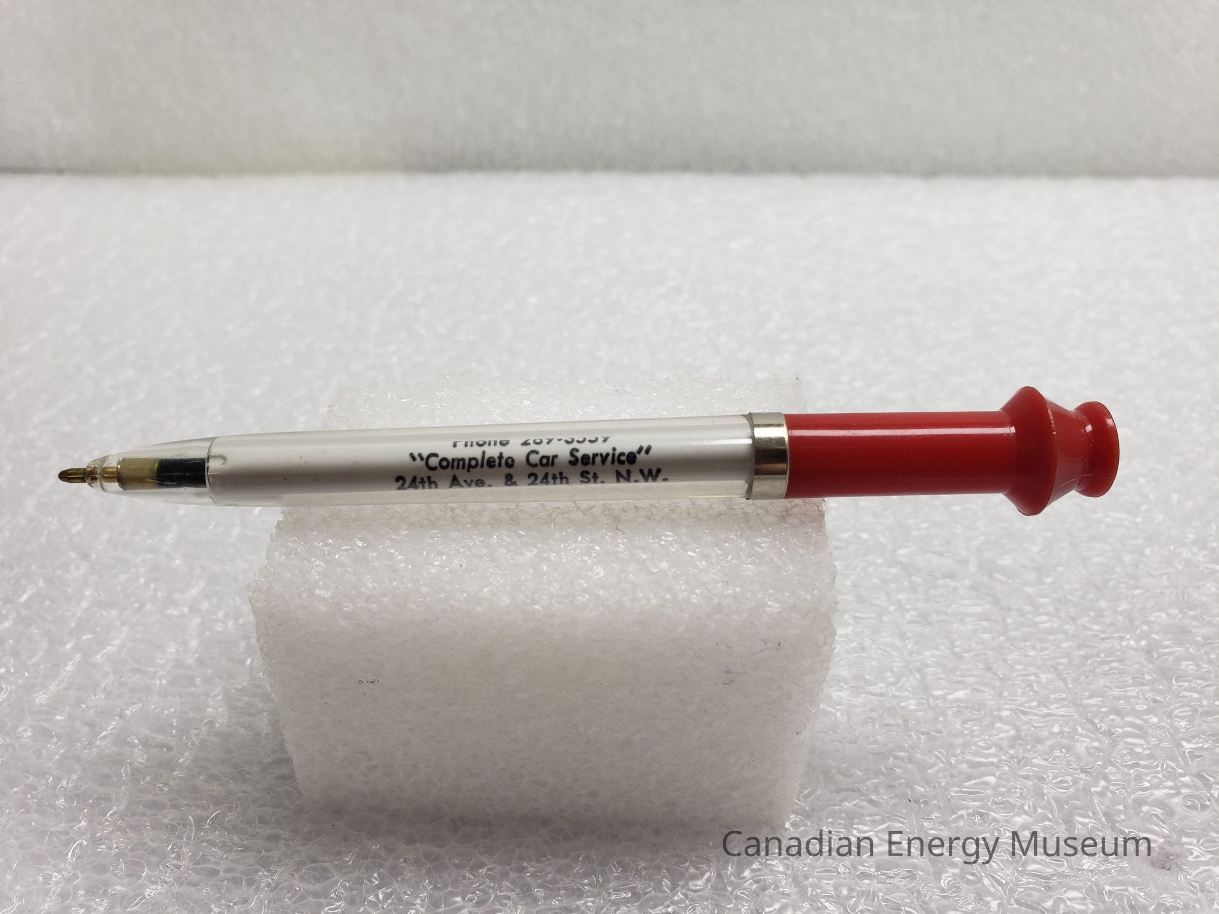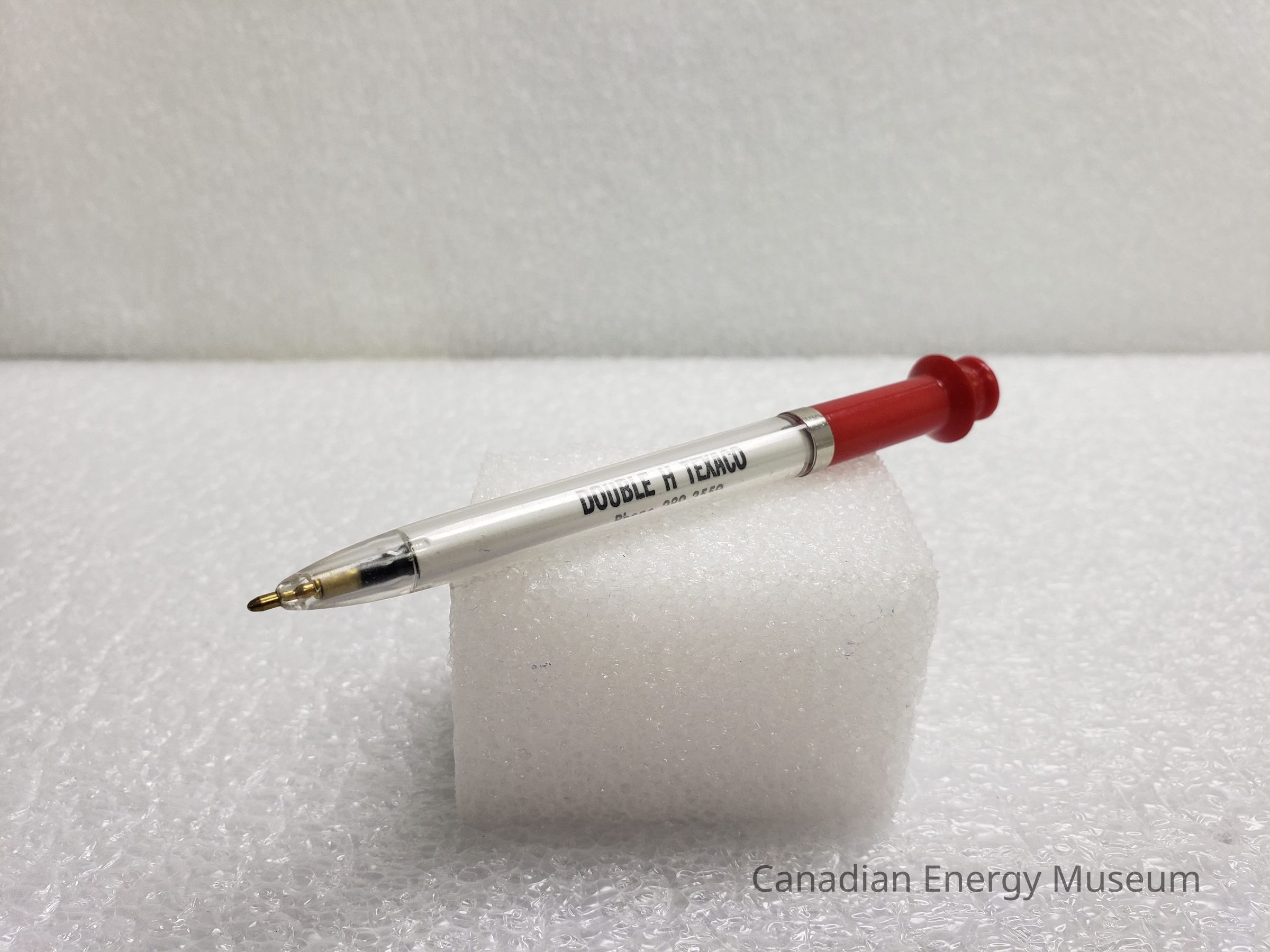 A ballpoint pen, branded to DOUBLE H TEXACO, with text "DOUBLE H TEXACO; Phone 289-3559; "Complete Car Service"; 24th Ave. & 24th St. N.W.; Calgary 44, Alberta". Text on white plastic, within clear plastic front section; silver-coloured middle band; and red plastic end with a flared-style end.Collection