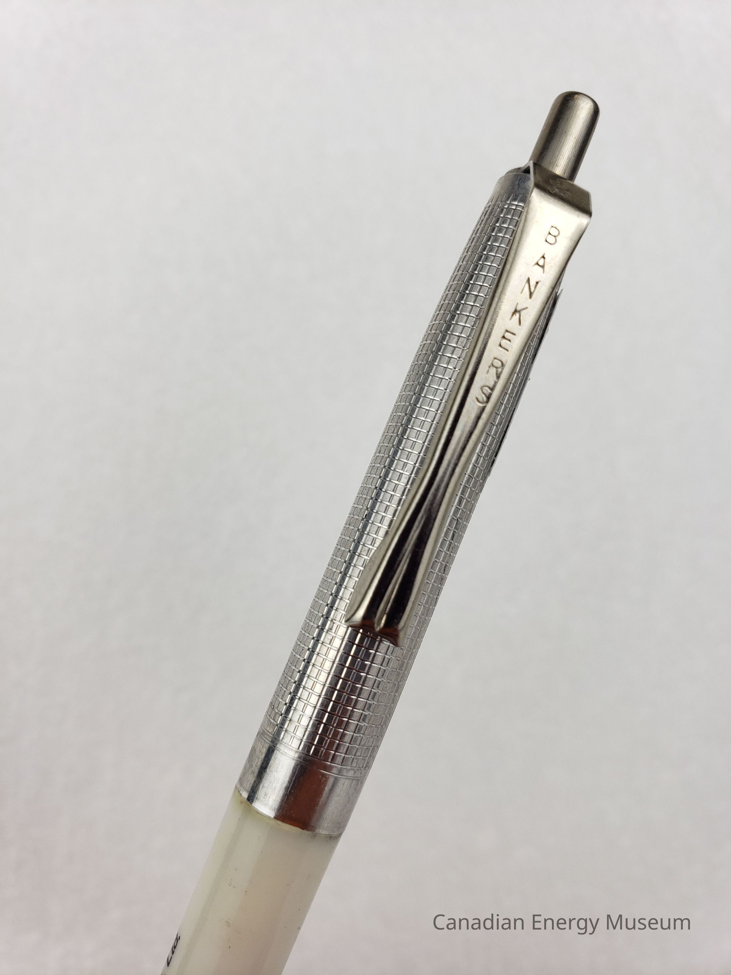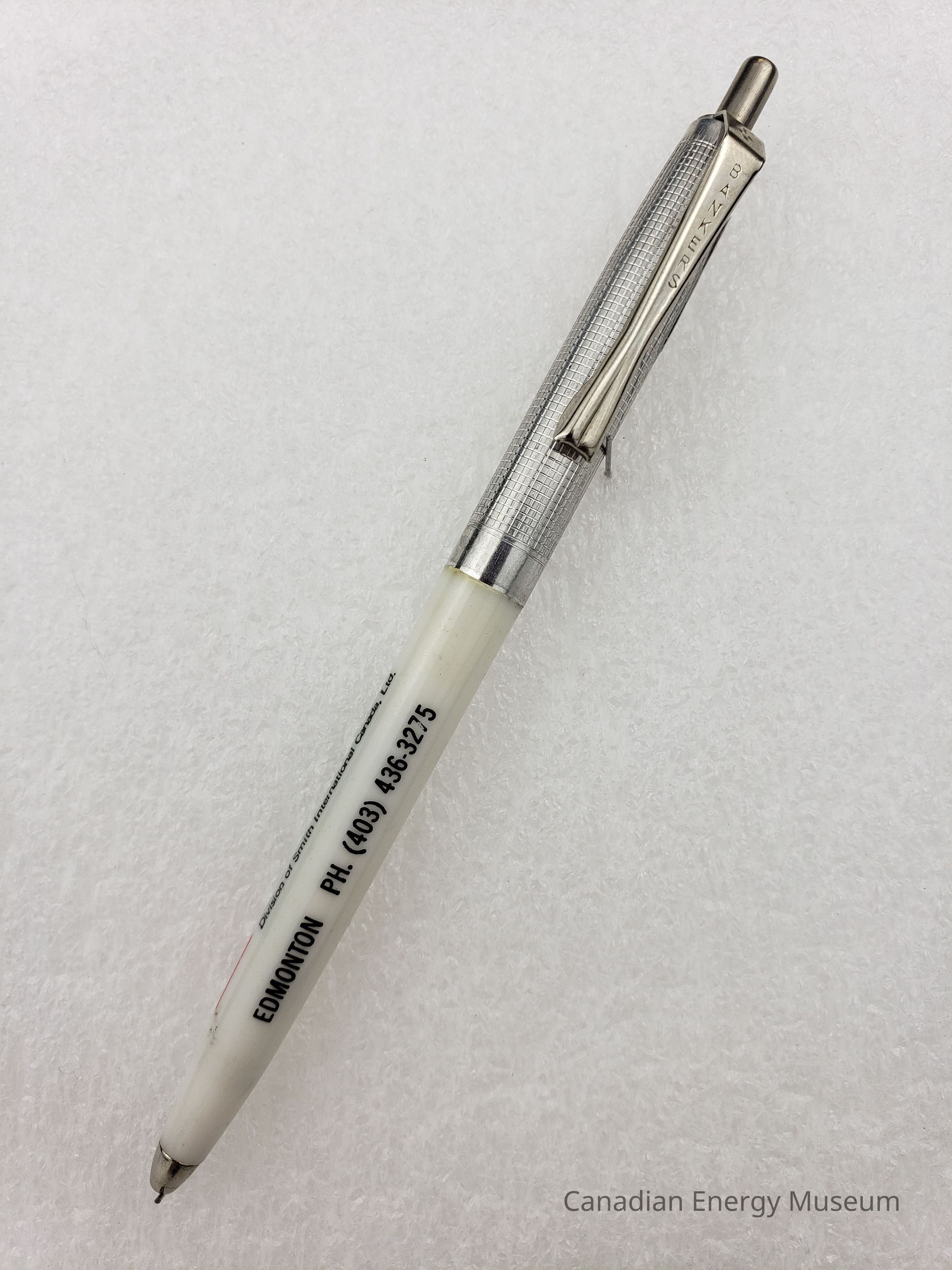 Pen: A retractable ballpoint pen, with a plastic body section towards the front, and metal body section towards the back, with clip. The plastic body section is white with black print, reading "DYNA-DRILL; Division of Smith International Canada, Ltd.; EDMONTON PH. (403) 436-3275" with the Smith International logo to the right in red and black. The metal section has a fine grid engraved texture, a clip branded with "BANKERS", and push button on the end to react the pen tip.