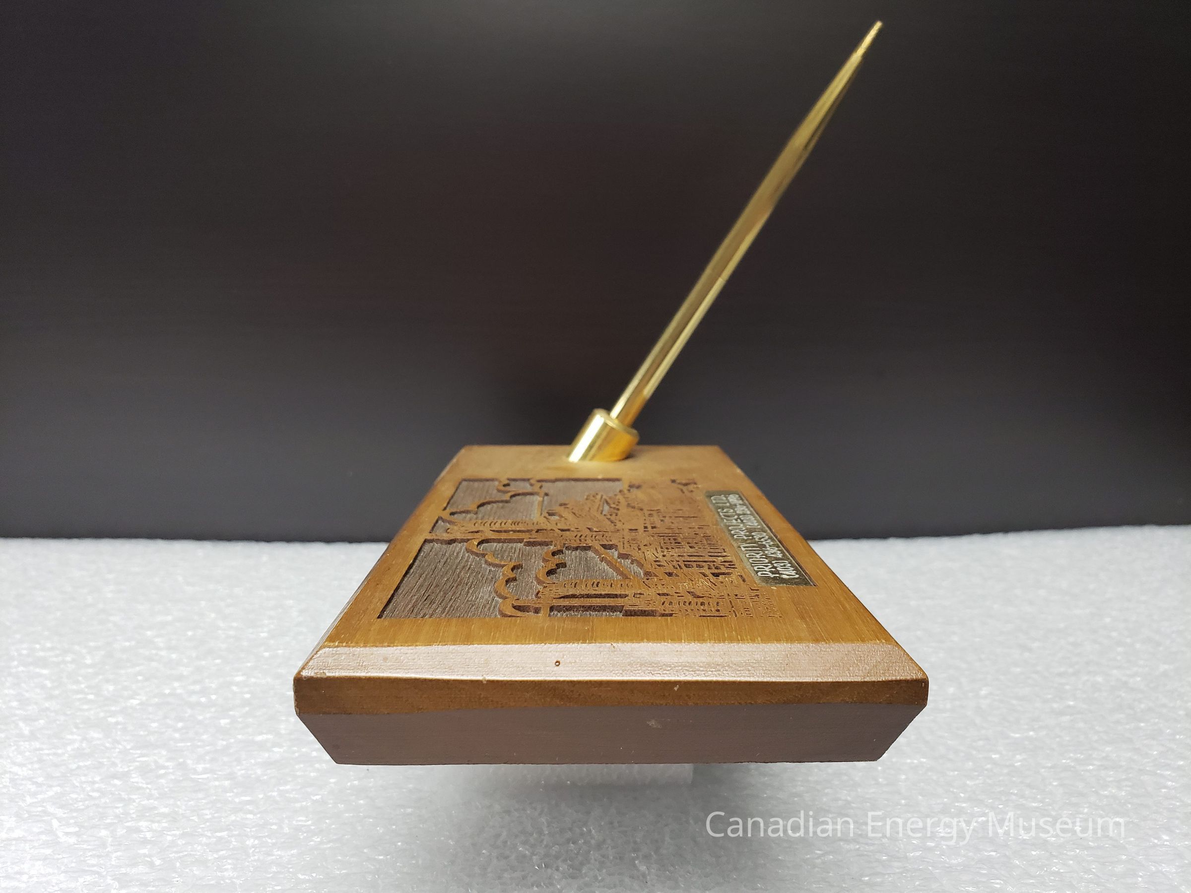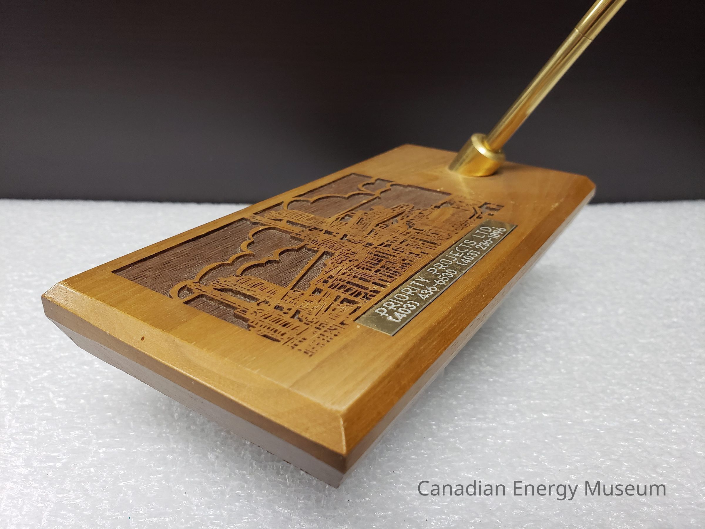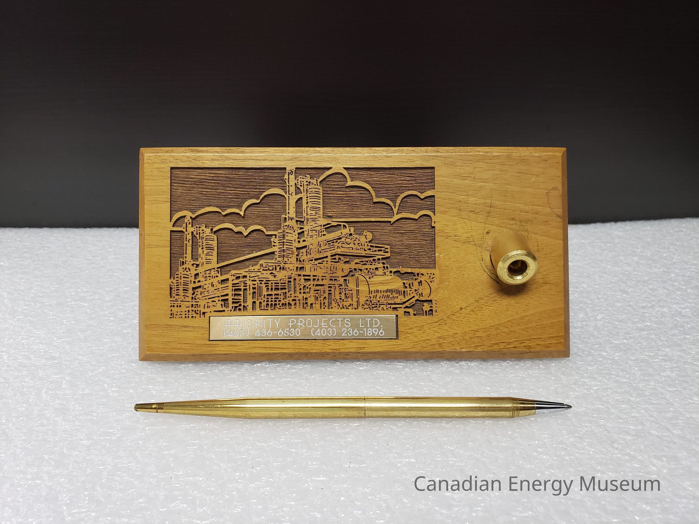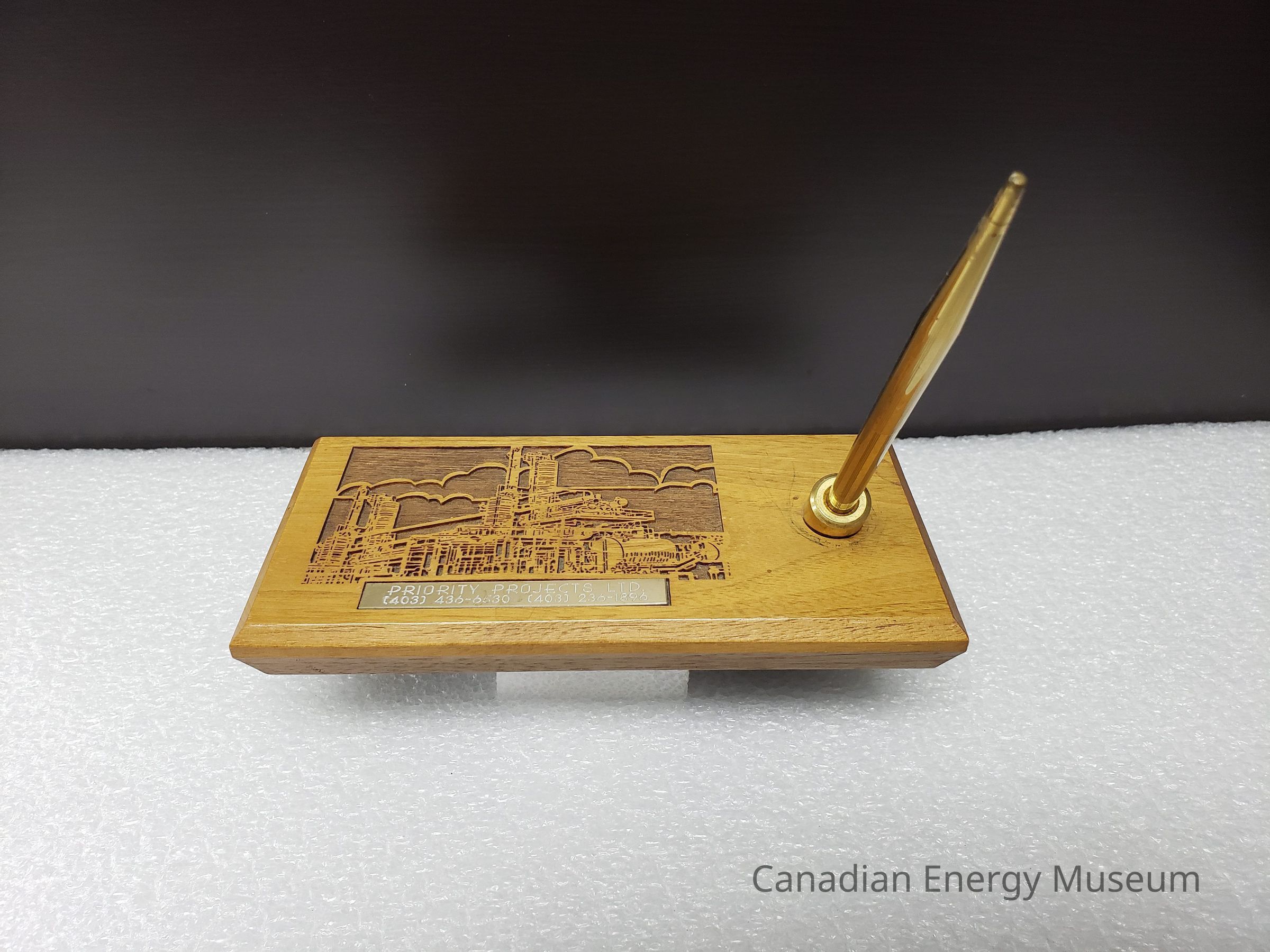 Features: A single block of wood (unidentified) with a laser-cut design and engraved metal plaque on the top, along with a shallow, stationary, angled, cylindrical metal setting in which the matching pen can be placed. The body of the stand is a flat rectangular block of wood, with angled edges (with the deepest angle on the underside). The laser-cut design is to the left of the top surface and is of an industrial structure, with stylised clouds in the background. Below the laser-cut design is a metal plaque engraved with "PRIORITY PROJECT LTD.; (403) 436-6530 (403) 236-1896". The pen holder to the right of these elements is gold in colours, and is cylinder-shaped. It is angled forward (the front when resting flat). The accompanying blue-ink rollerball pen is a matching gold-coloured metal, with a narrow, tapered shape, with a shallow texture of lengthwise grooves. The pen has a center join, assumedly for dismantling and refilling the ink. The base of the stand is padded with a sheet of black foam.Collection