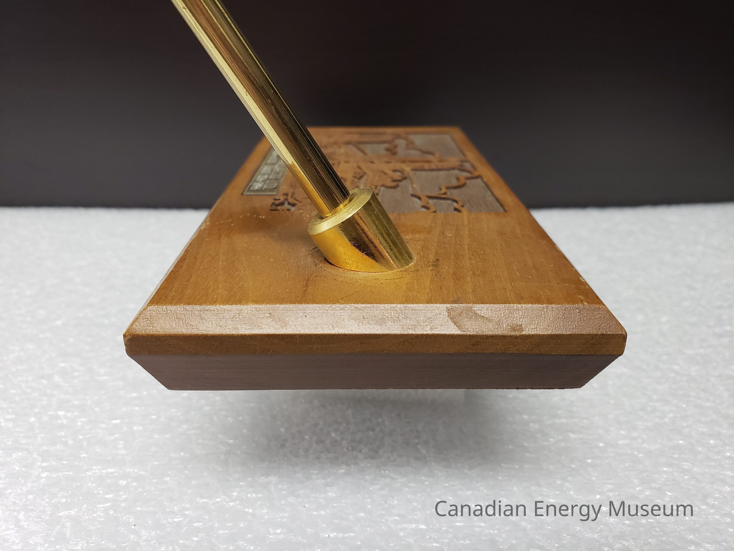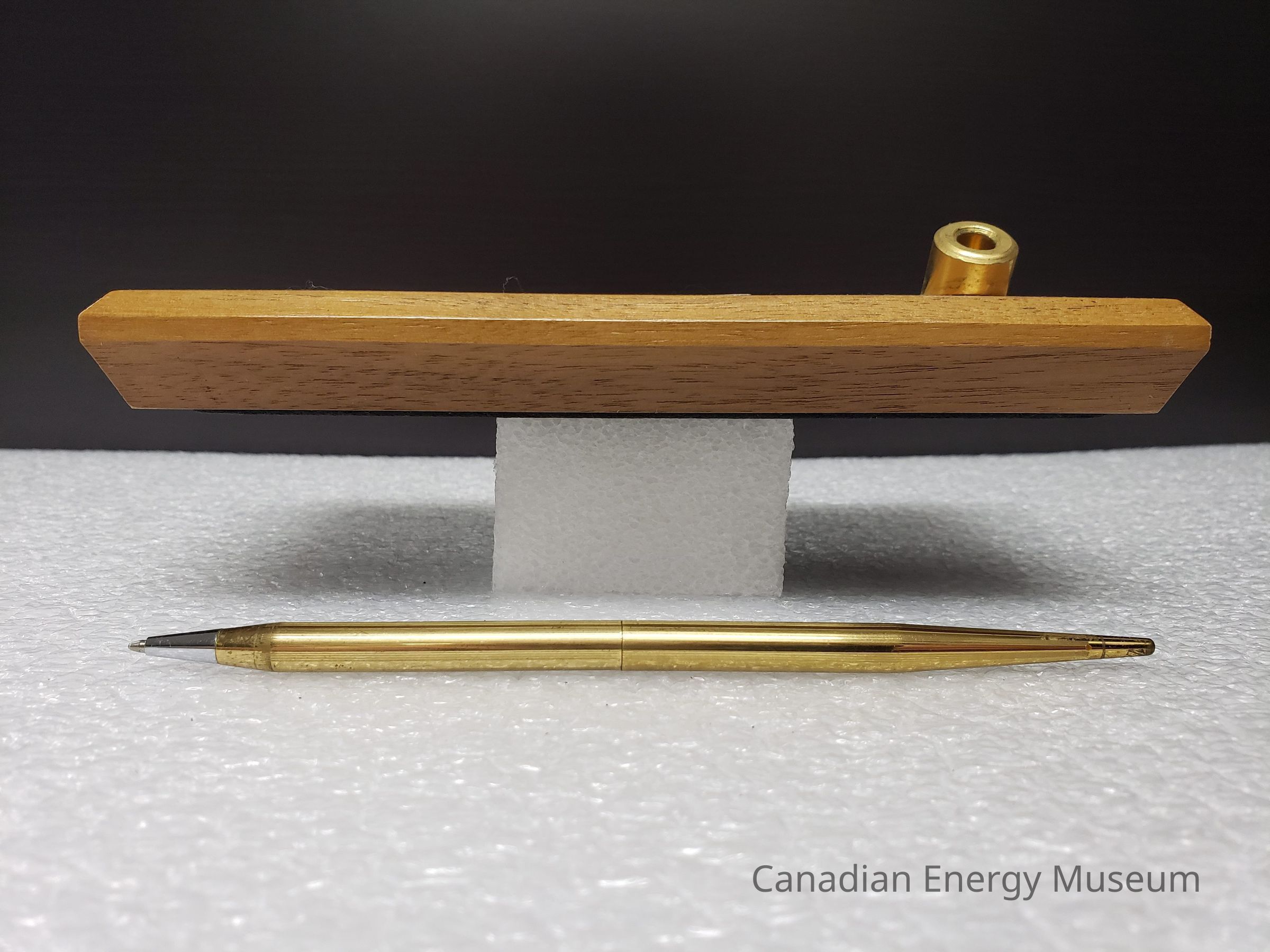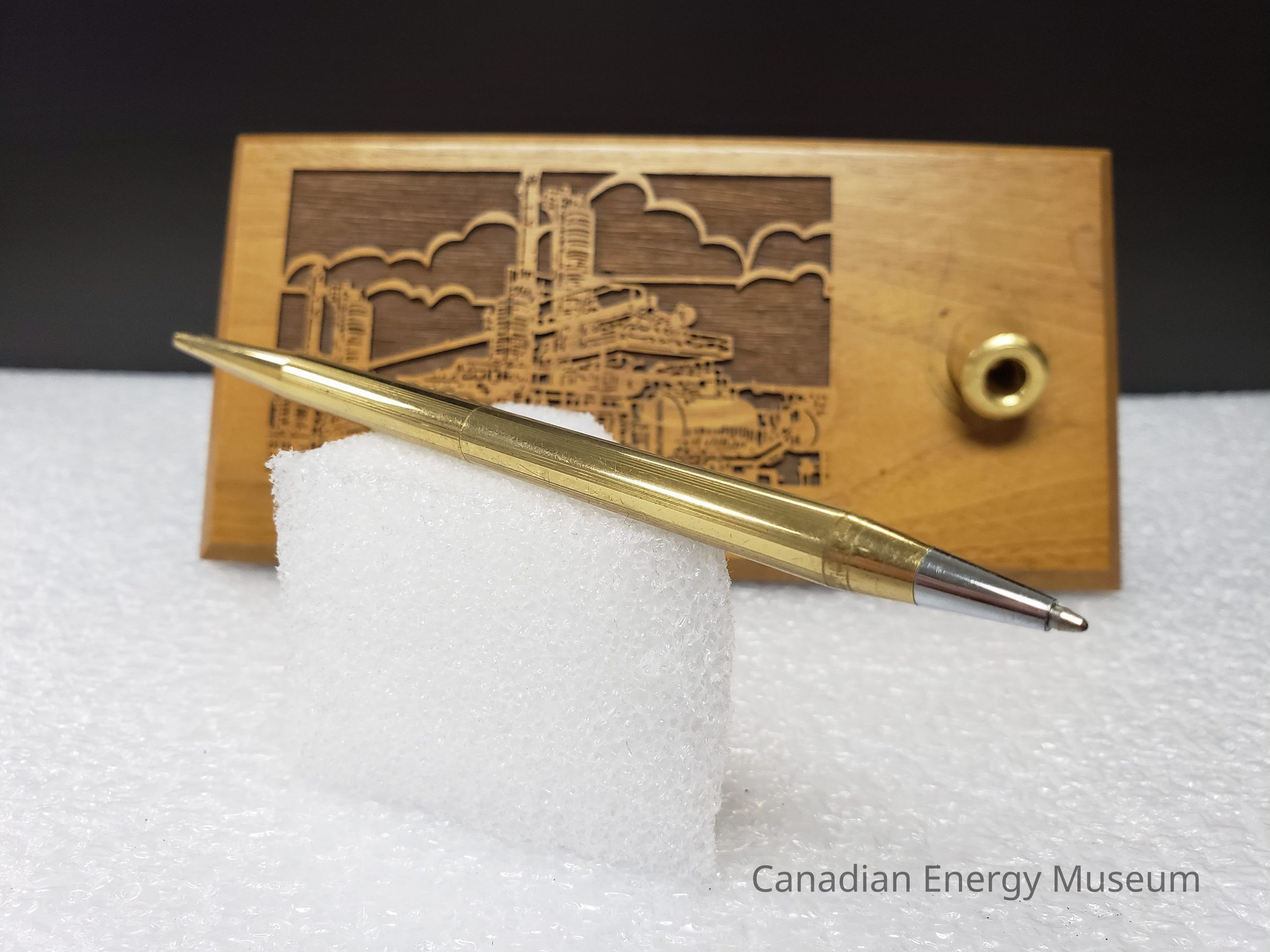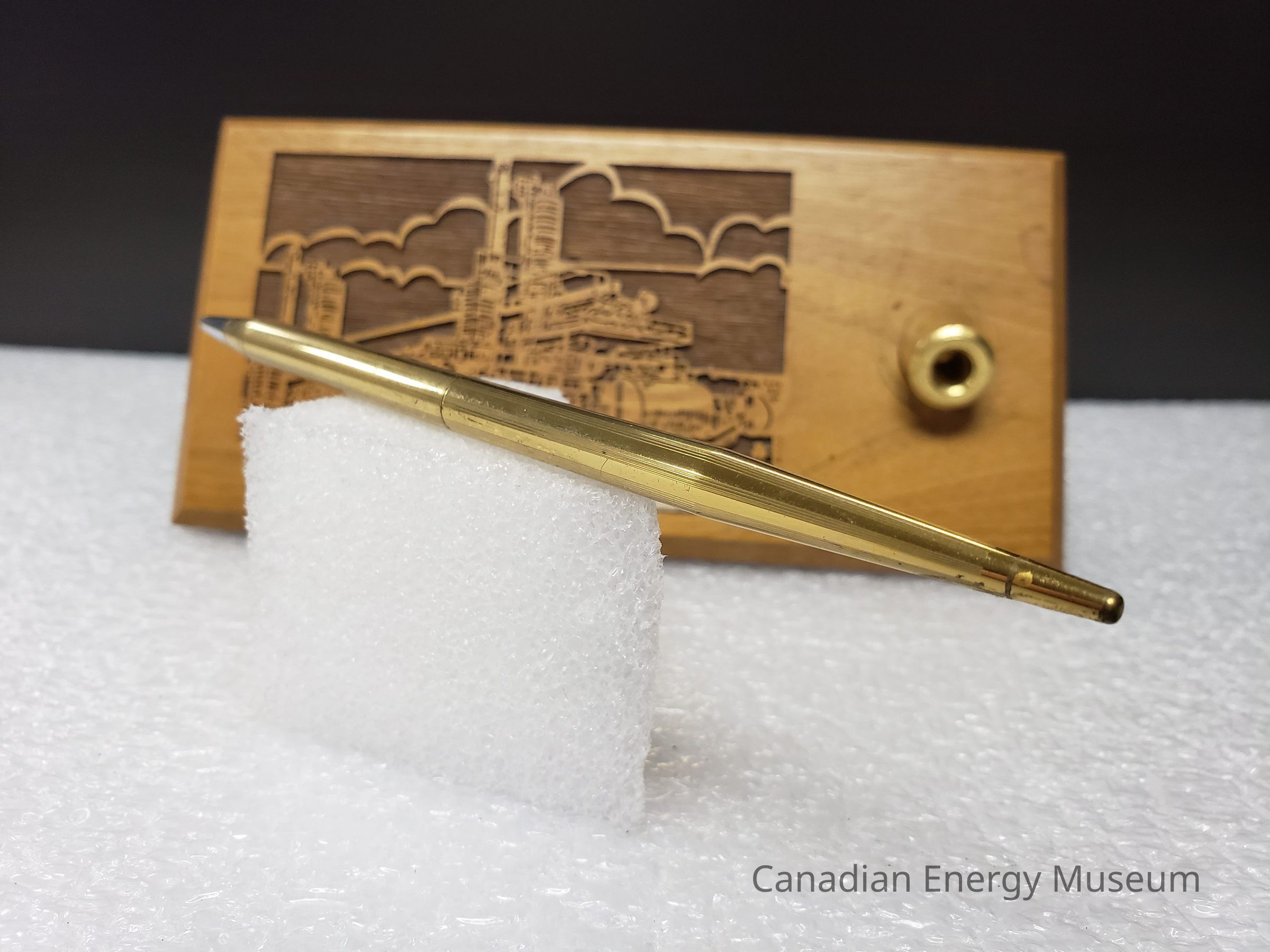 Features: A single block of wood (unidentified) with a laser-cut design and engraved metal plaque on the top, along with a shallow, stationary, angled, cylindrical metal setting in which the matching pen can be placed. The body of the stand is a flat rectangular block of wood, with angled edges (with the deepest angle on the underside). The laser-cut design is to the left of the top surface and is of an industrial structure, with stylised clouds in the background. Below the laser-cut design is a metal plaque engraved with "PRIORITY PROJECT LTD.; (403) 436-6530 (403) 236-1896". The pen holder to the right of these elements is gold in colours, and is cylinder-shaped. It is angled forward (the front when resting flat). The accompanying blue-ink rollerball pen is a matching gold-coloured metal, with a narrow, tapered shape, with a shallow texture of lengthwise grooves. The pen has a center join, assumedly for dismantling and refilling the ink. The base of the stand is padded with a sheet of black foam.Collection