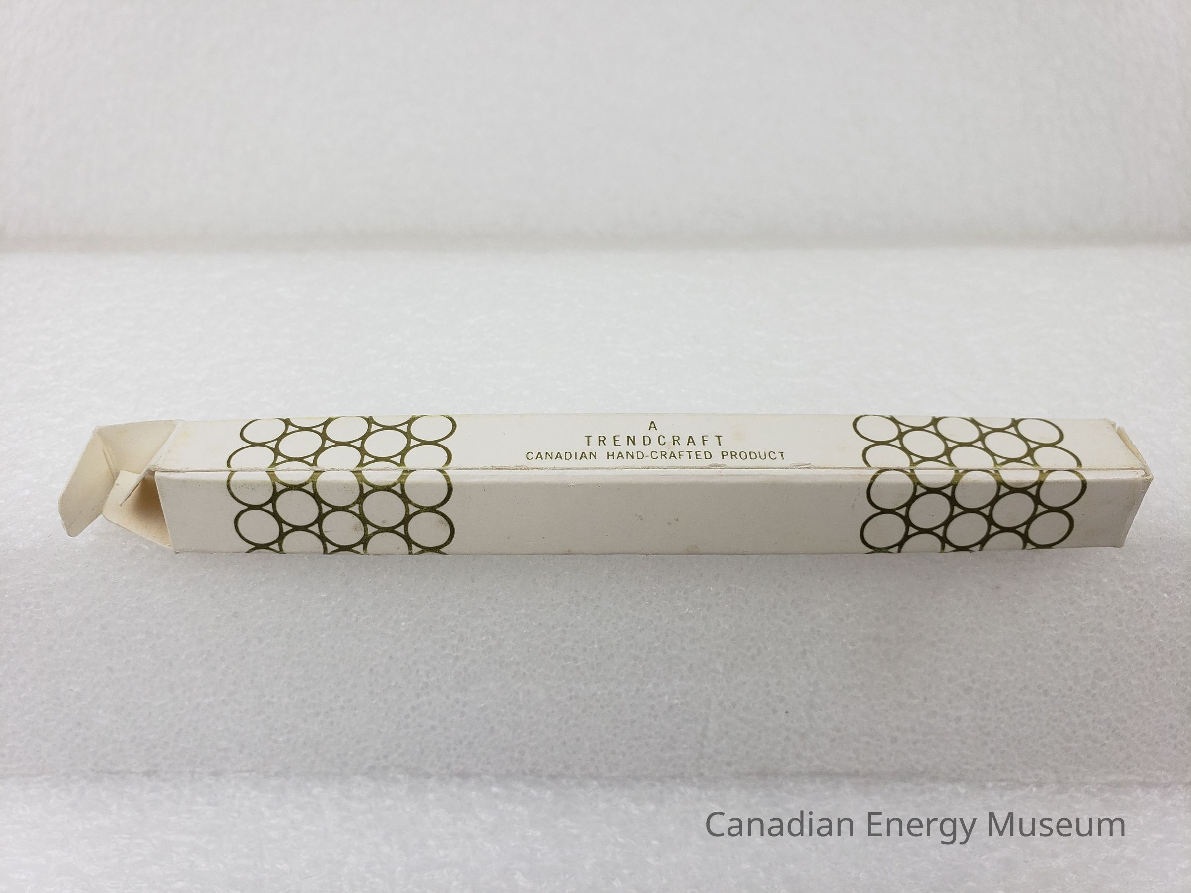 Box: A long square cardboard box, with a white base and gold printed circle-pattern band to either end. Between the band on one side is the text "A TRENDCRAFT; CANADIAN HAND-CRAFTED PRODUCT", also in gold print.