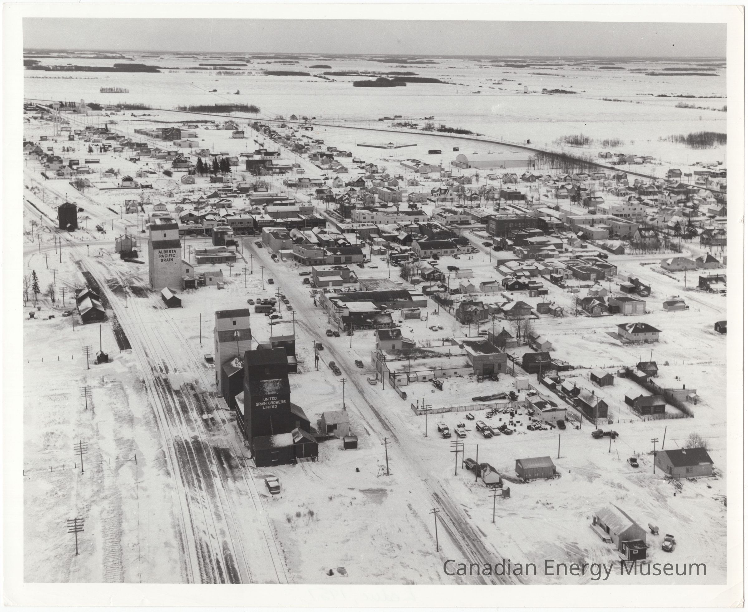 [Photo] Aerial View of Leduc, Grain Elevators, Large, BW, 1957Entry/Object ID