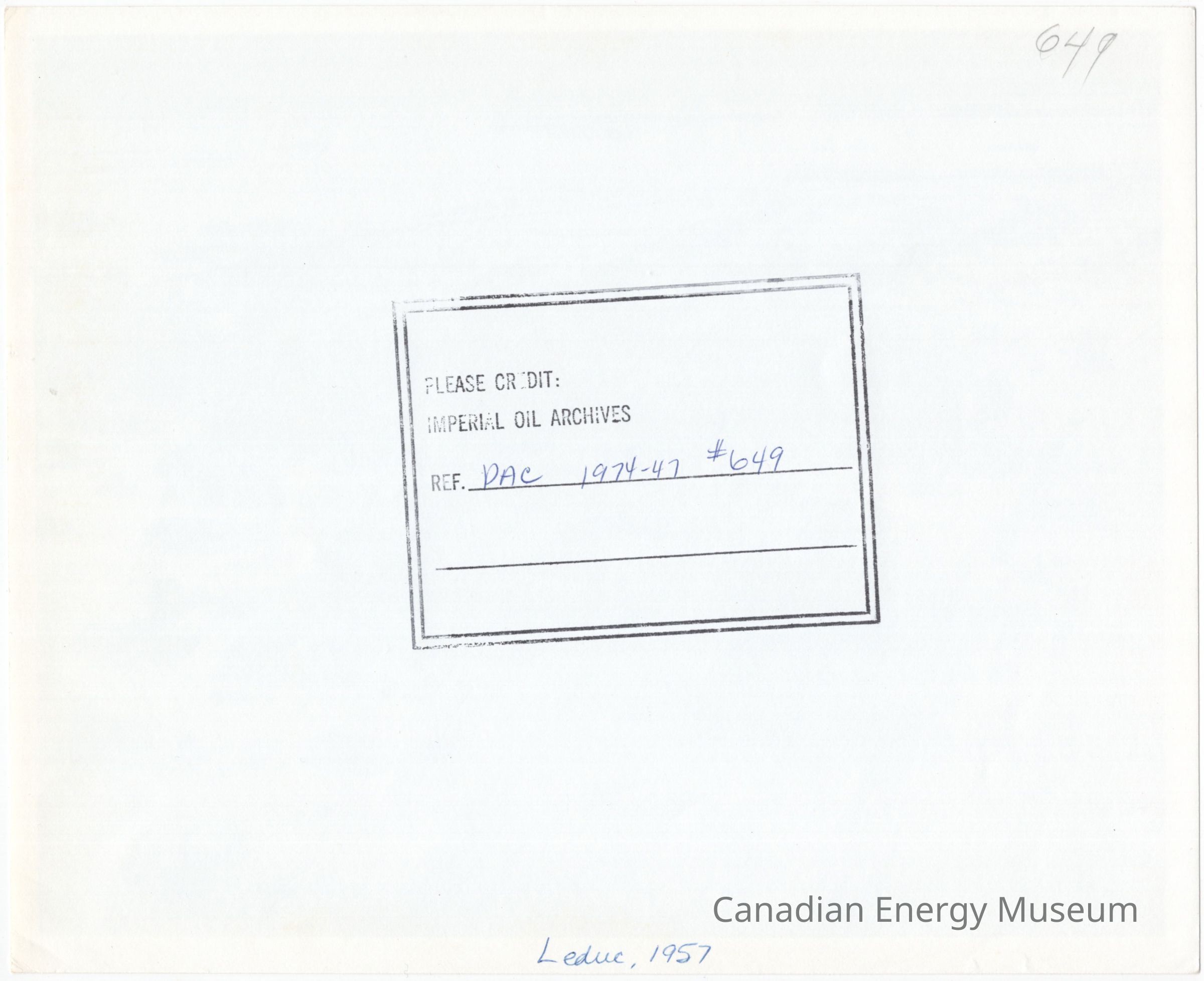 On the reverse of the print is a stamp from "IMPERIAL OIL ARCHIVES" with the handwritten blue ballpoint text "PAC 1974-47 #649". Additionally, "LEDUC,1957" is written in blue ballpoint in the bottom-centre.Collection