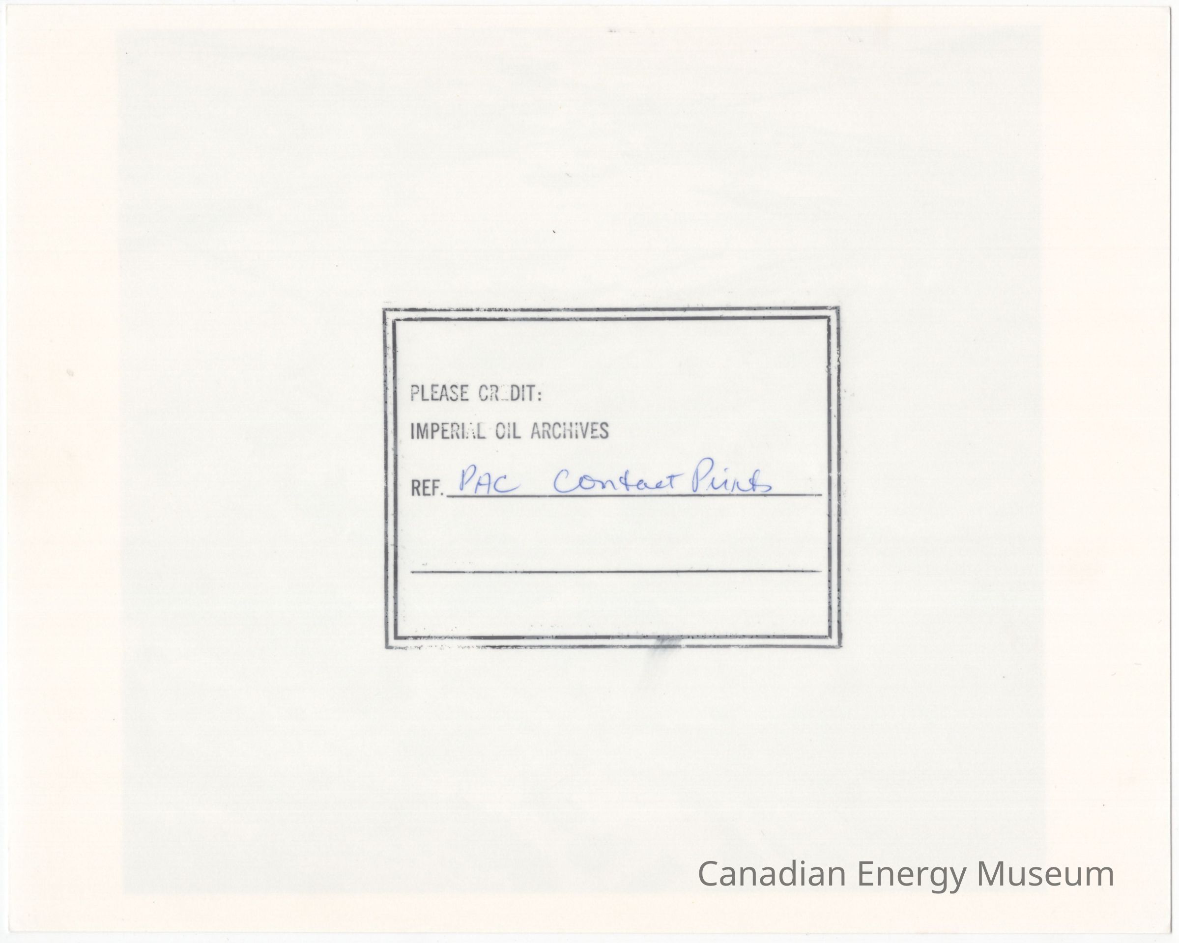 On the reverse of the print is a stamp from "IMPERIAL OIL ARCHIVES" with the handwritten blue ballpoint text "PAC CONTACT PRINTS".Collection
