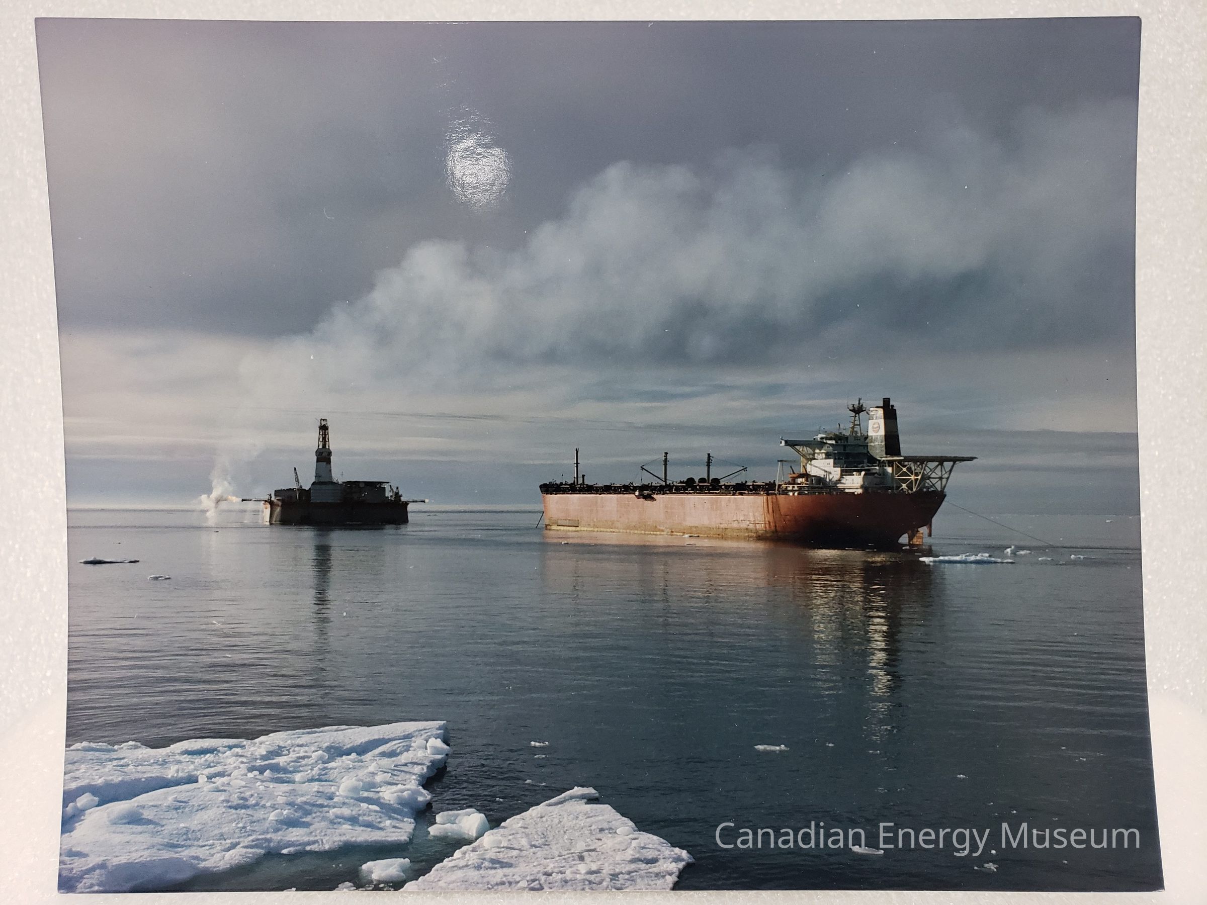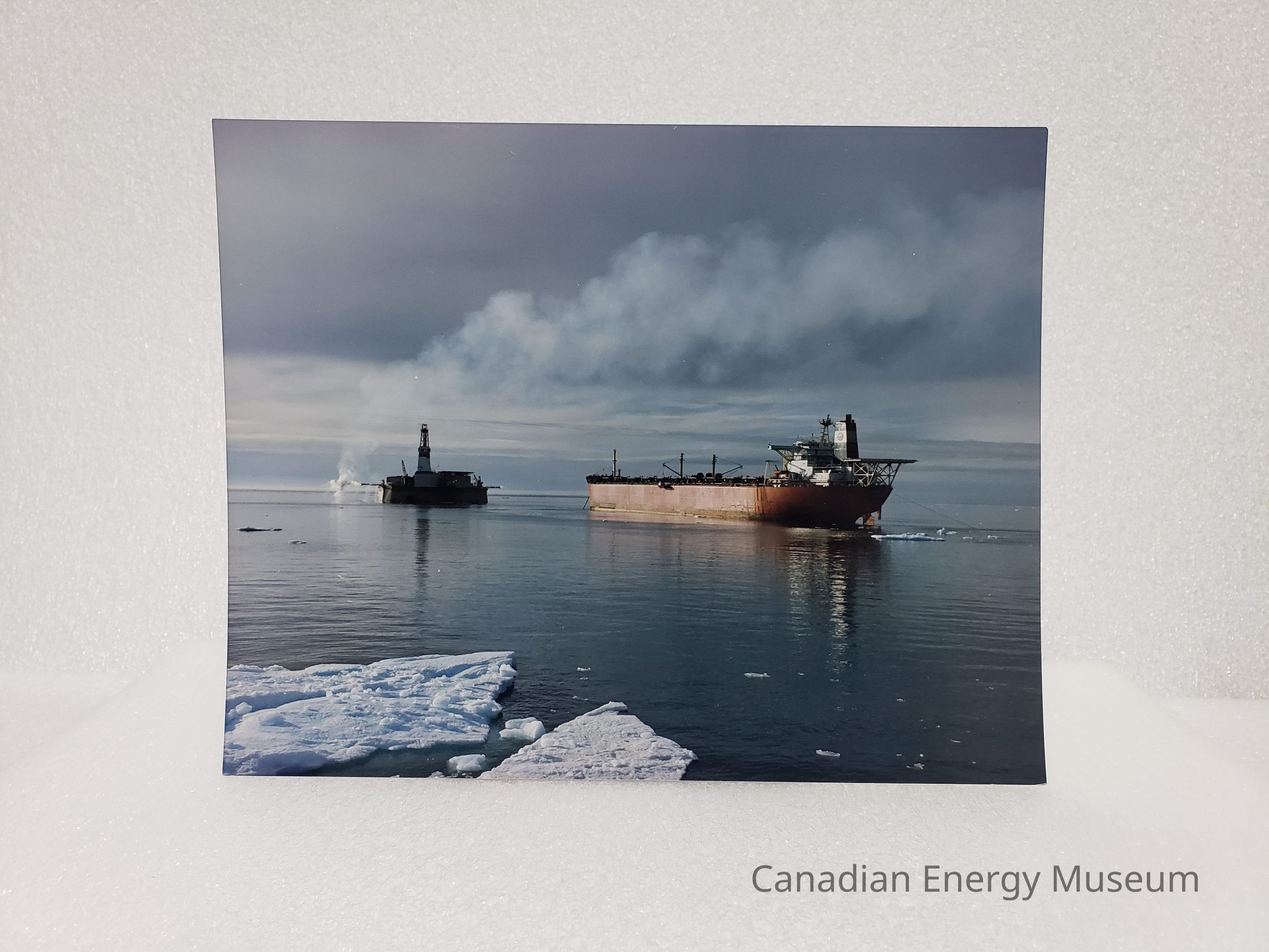 A large colour photographic print (glossy, landscape) of a small offshore rig and tanker ship, in water with visible floating ice.