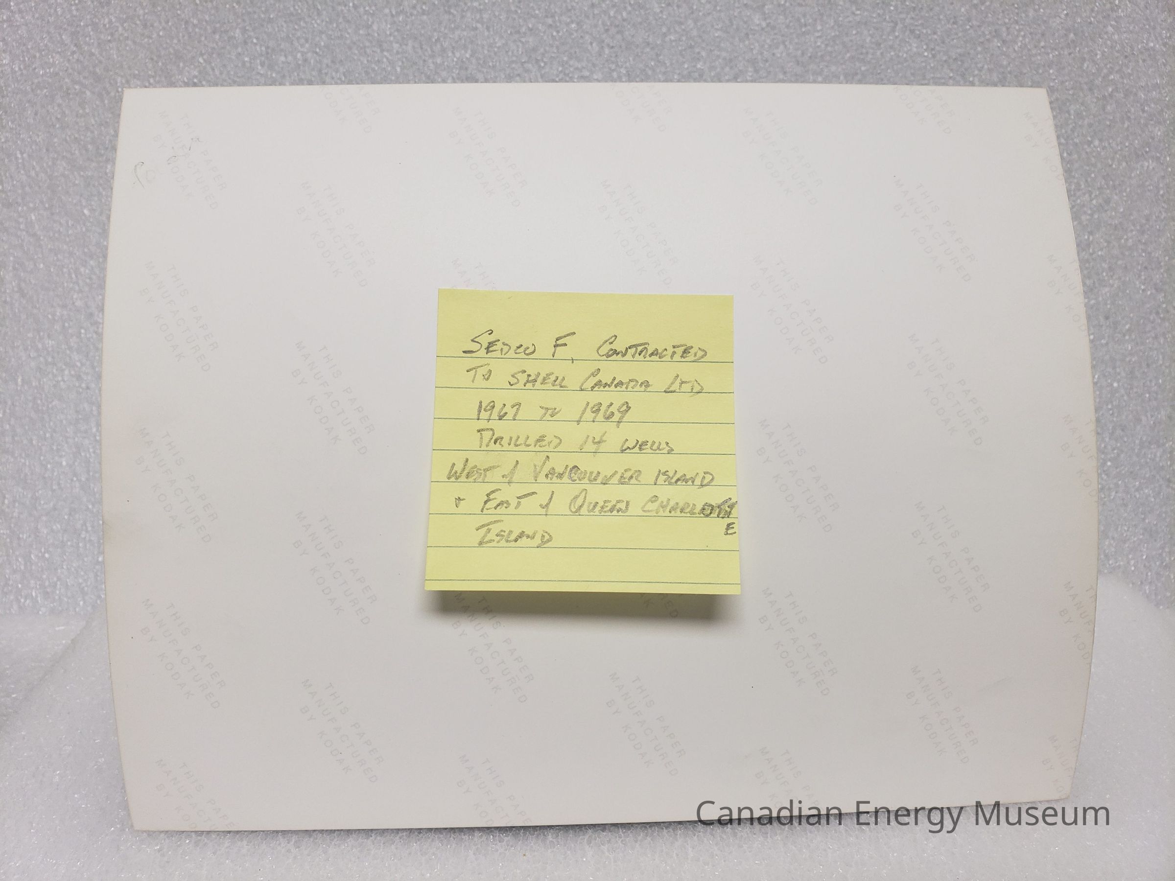 Adhered to the front of the print (now moved to the back) is a yellow post-it reading "SEDCO F, CONTRACTED TO SHELL CANADA LTD 1967 TO 1969 DRILLING 14 WELLS WEST OF VANCOUVER ISLAND & EAST OF QUEEN CHARLOTTE ISLAND". It is unclear if this post-it is related to the photograph or became attached by accident (less than ideal storage prior to accessioning). I suspect that may not be related, as the dates (1967 to 1969) don't appear to match the age of the photograph (appears to be 1980s-1990s at the earliest).Collection