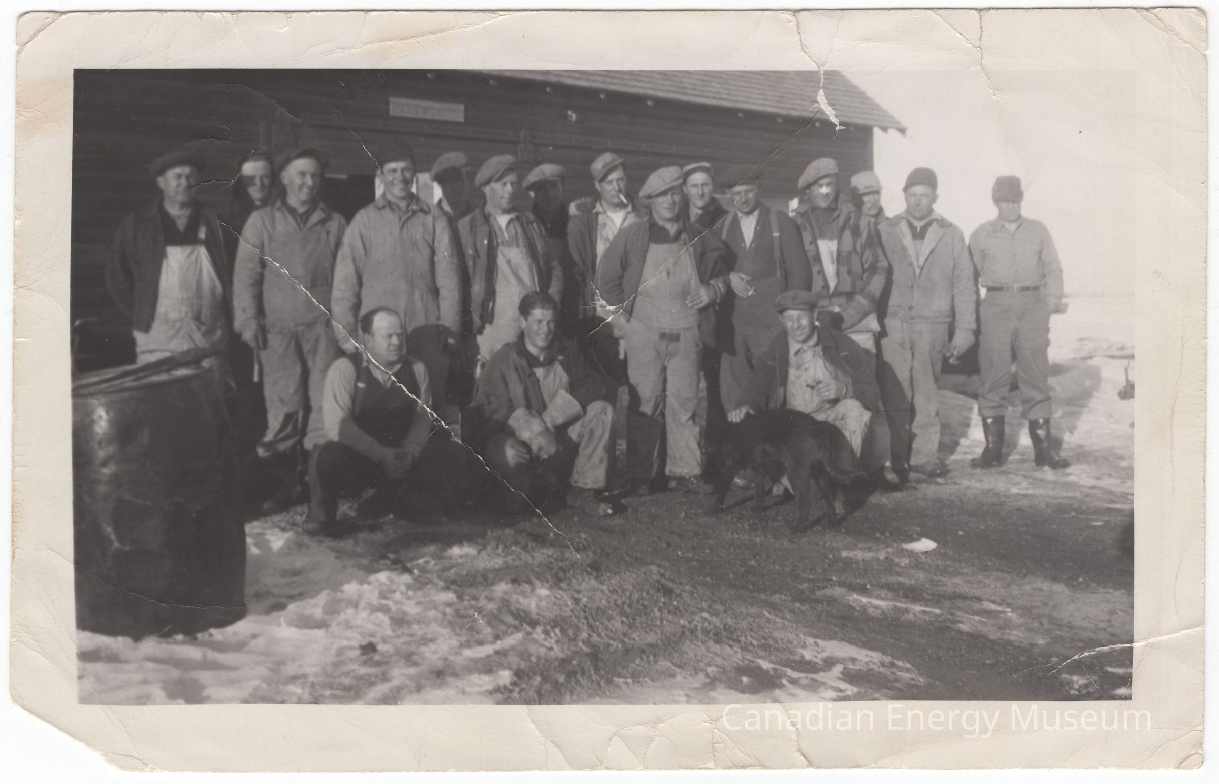 A small black and white photographic print featuring EIGHTEEN men in work cloths, most also wearing cloth flat caps, and accompanied by a black dog. Group are standing in front of a wood-sided single-storey building, with a black oil can to the left of the frame, and snow/ice on the ground.