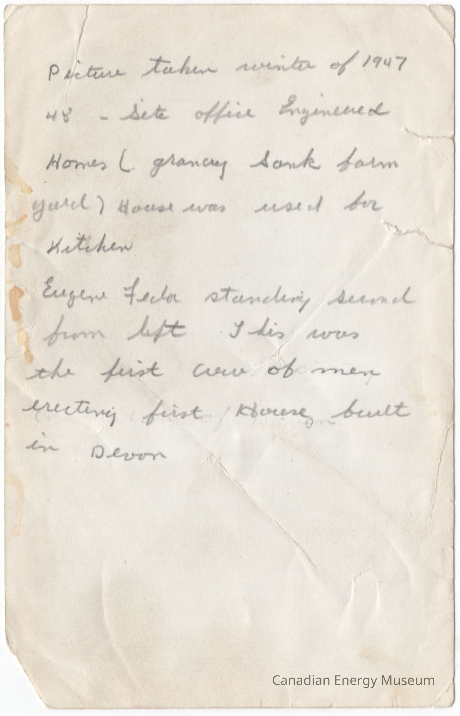 On the reverse is written in pencil "Picture taken winter of 1947; 48 - Site office Engineered Homes ([glancy?] [tank?] farm yard) House was used for kitchen; Eugene Fector standing second from left. This was the first crew of men erecting first house built in Devon".Collection