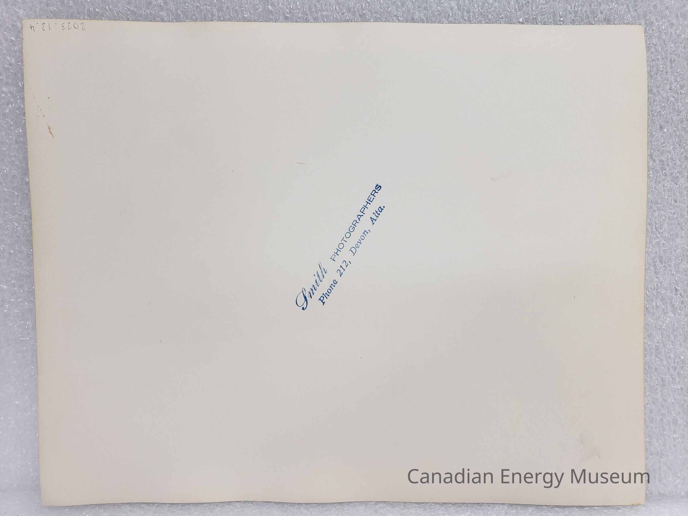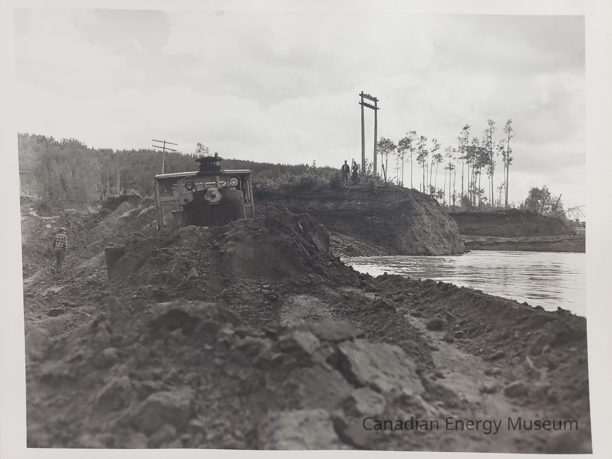 A large, black and white photographic print of a bulldozer moving dirt on the bank/edge of a body of water. In the midground is a bulldozer facing the photographer with a man in a checkered shirt and hard hat facing away. In the background, on a raised section of earth are two figures standing beside a frame supported by wires, with sparse trees further back to the right. To the right midground is a body of water (likely Saskatchewan River based on other photos in the collection). On the reverse is a stamp for Smith Photographers ("Phone 212, Devon, Alta.").Collection