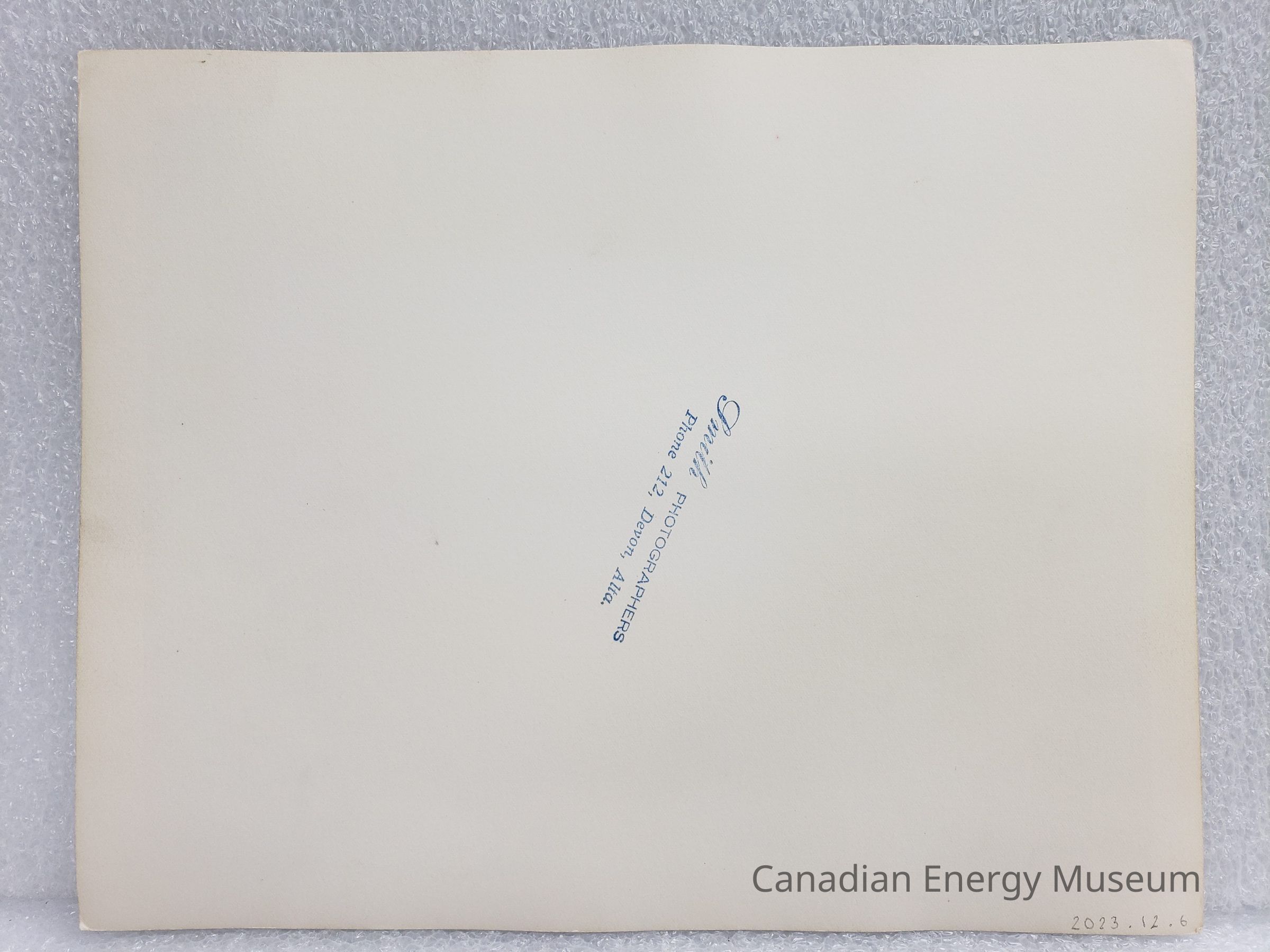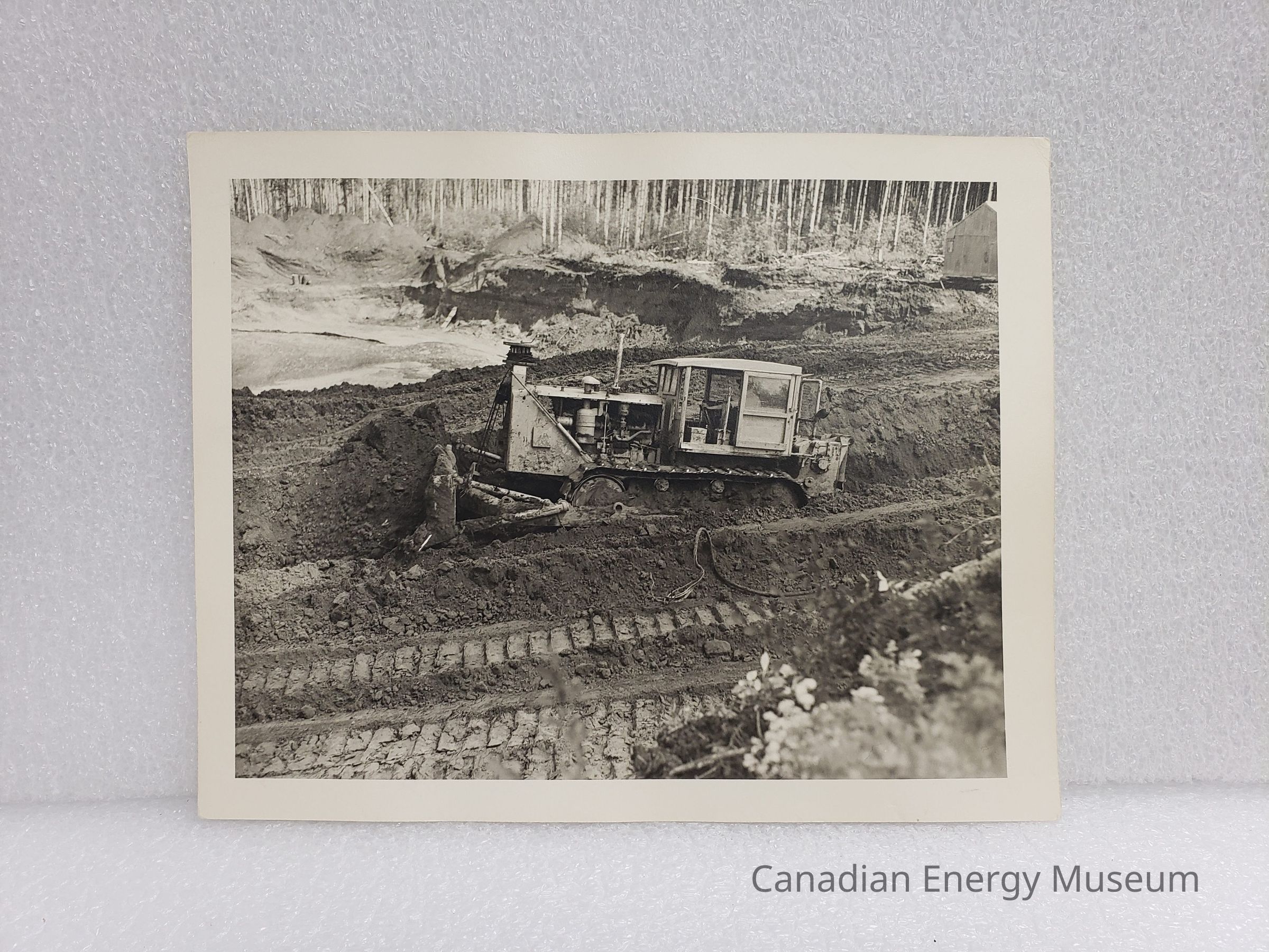 A large, black and white photographic print of the side-view of a bulldozer moving dirt. The bulldozer takes up the majority of the midground, with the trees and a sunken area of earth in the background. On the reverse is a stamp for Smith Photographers ("Phone 212, Devon, Alta.").Collection