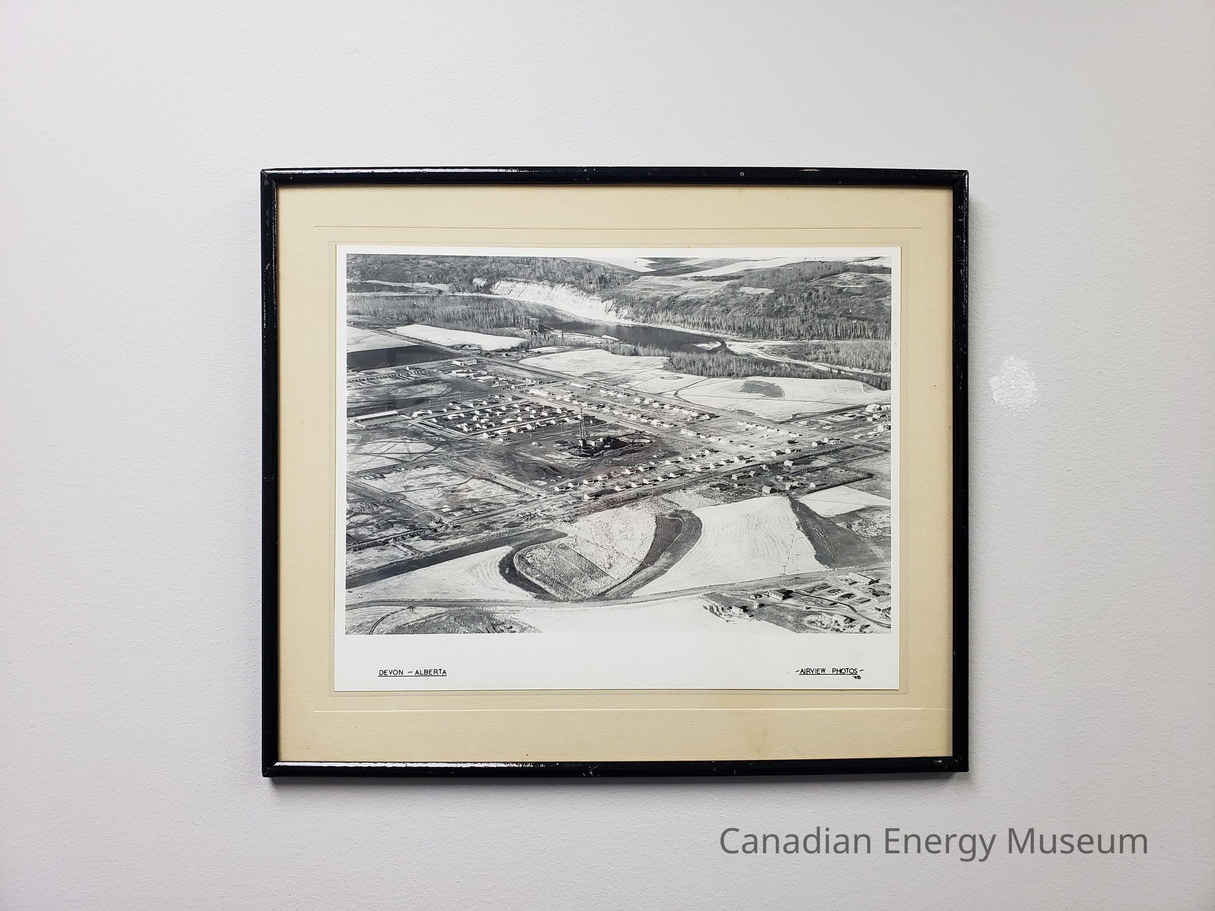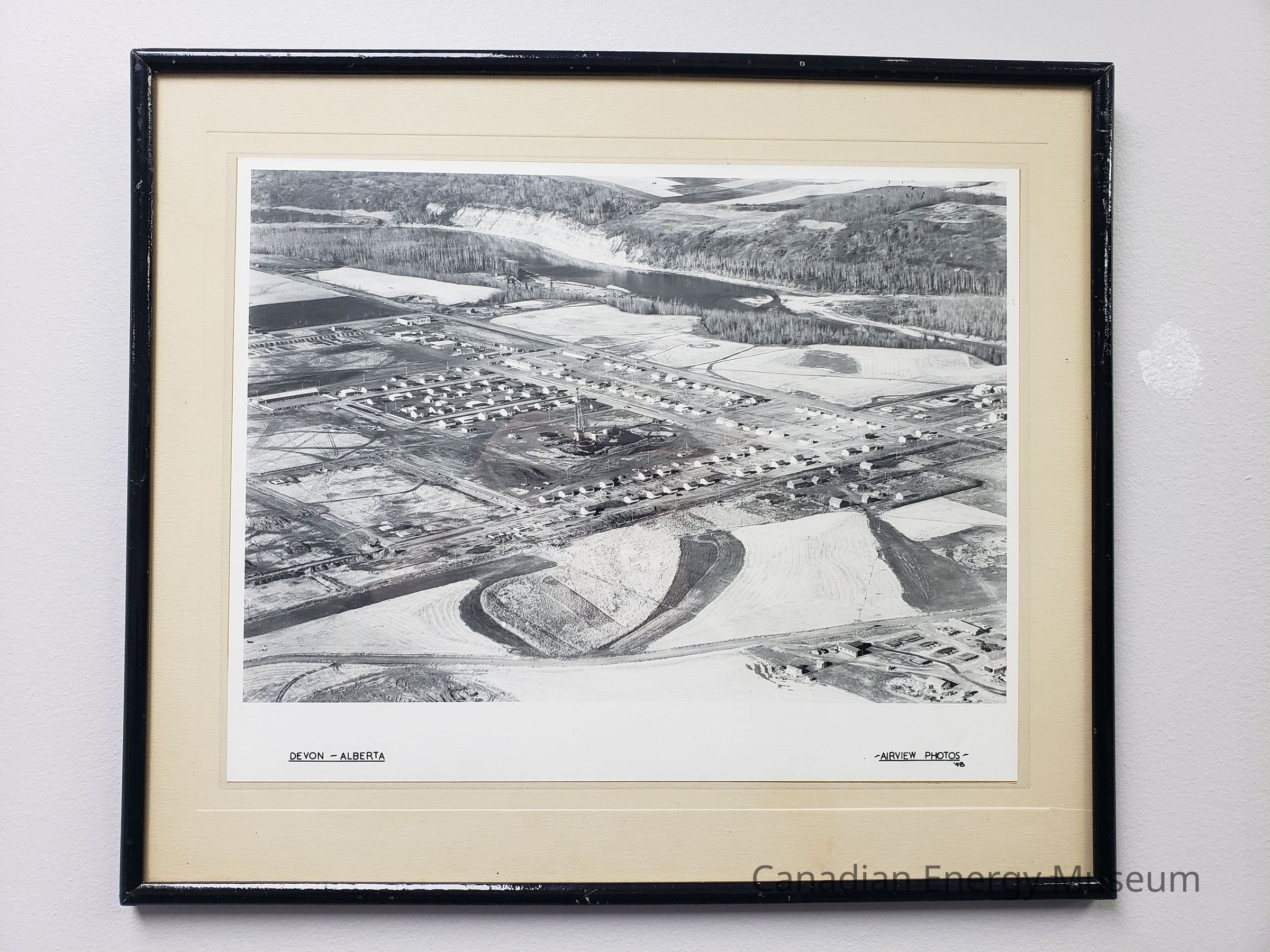 A framed, black and white aerial photograph of the Town of Devon, taken in 1958.Collection