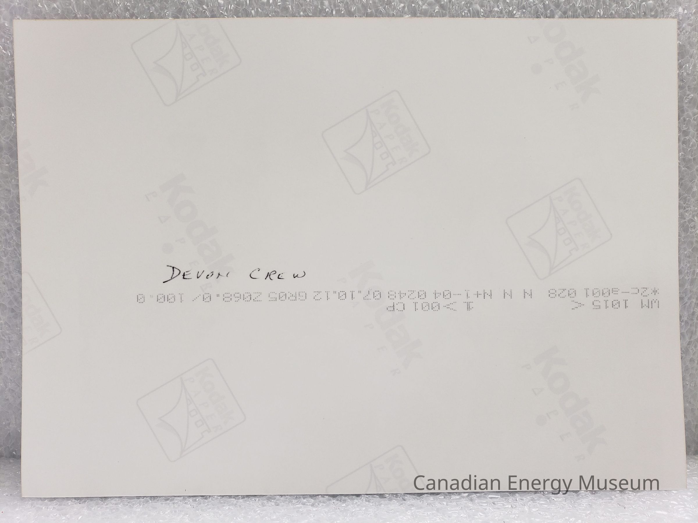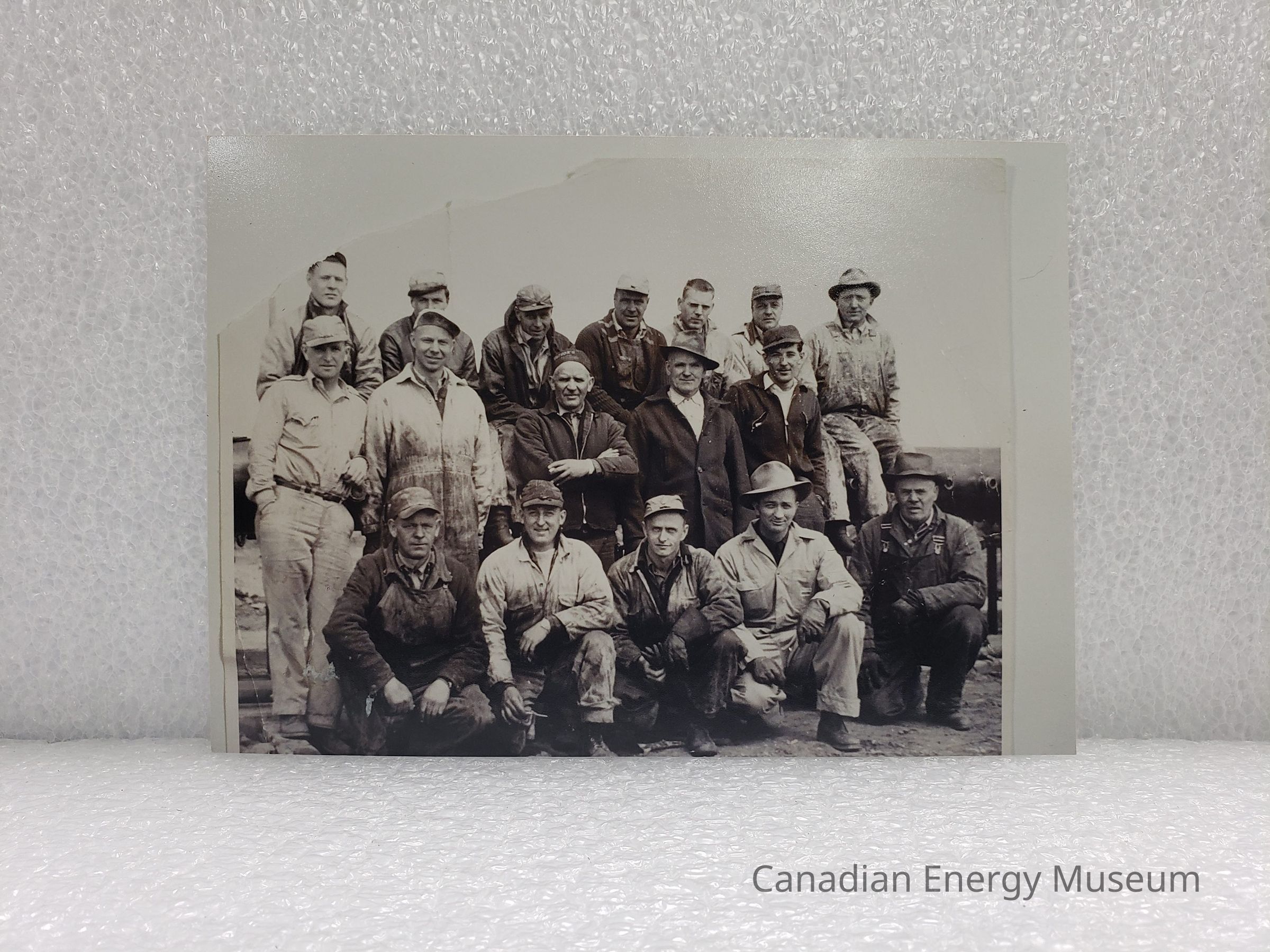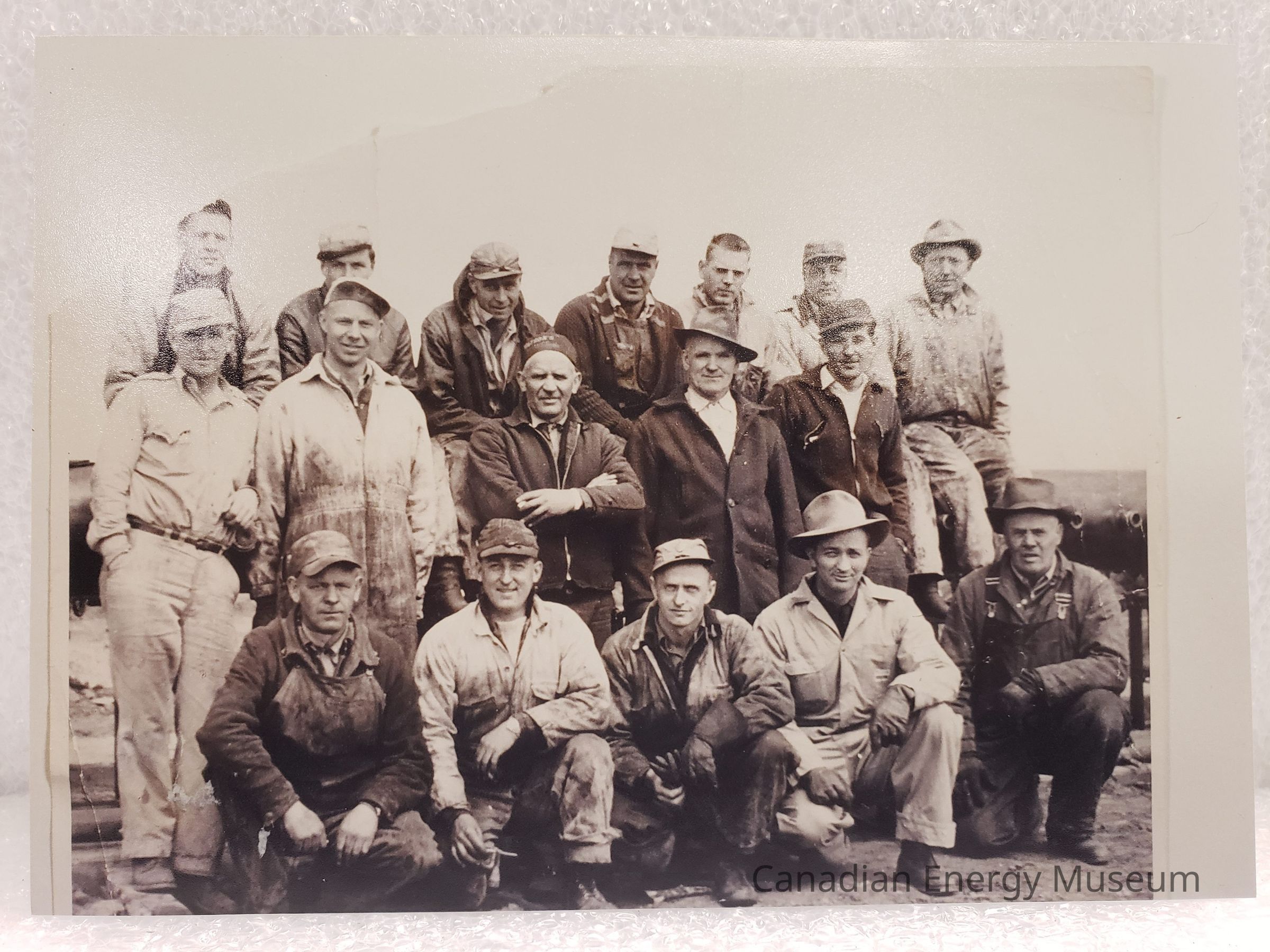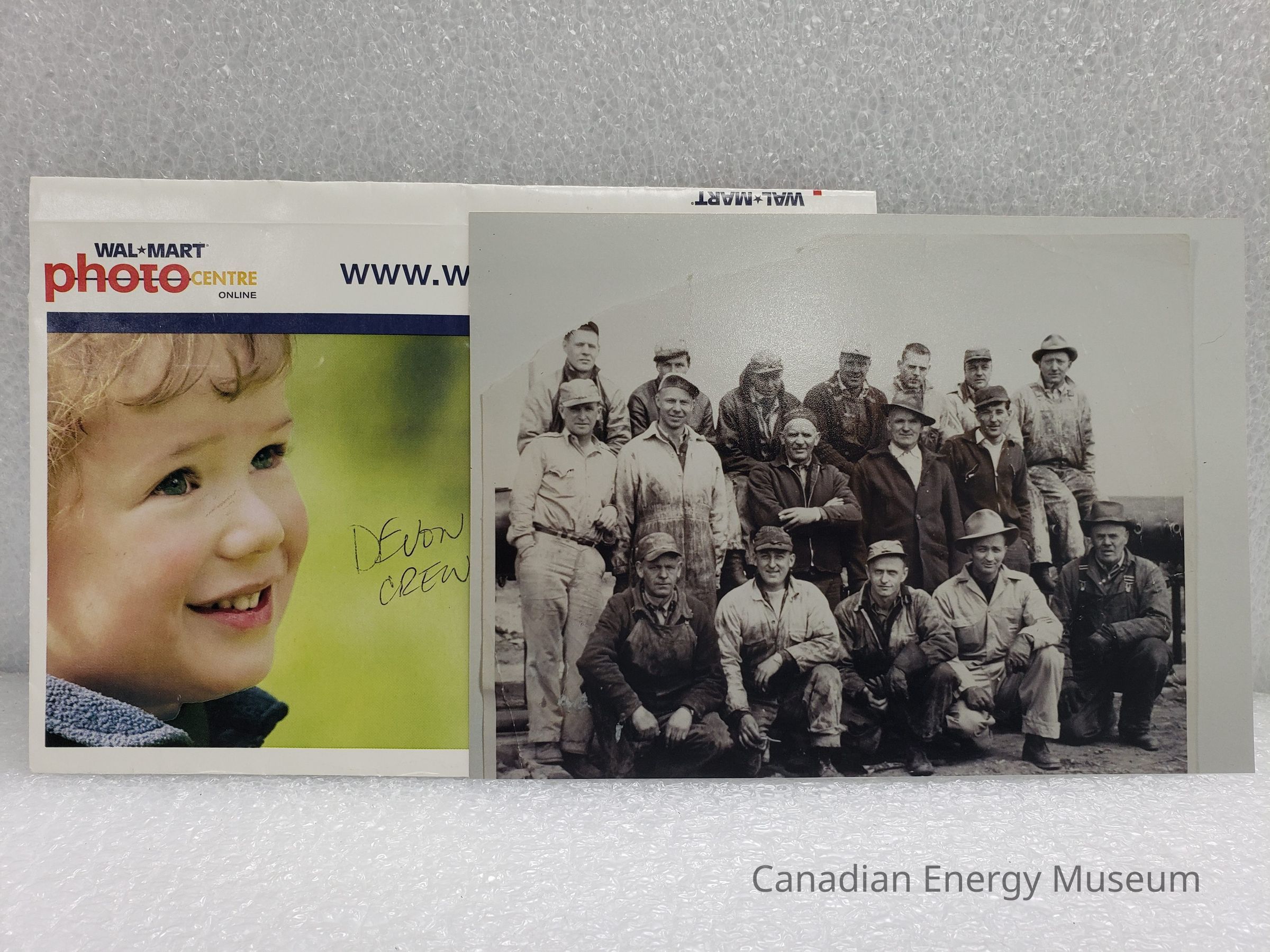 A modern reprint (from a scan) of a photograph labelled "Devon Crew", likely dated to around late-1940s to 1950s. Featured SEVENTEEN me wearing work clothes and hats, arranged in three standing and crouched rows. Also accompanied by a Walmart brand photo envelope.Collection