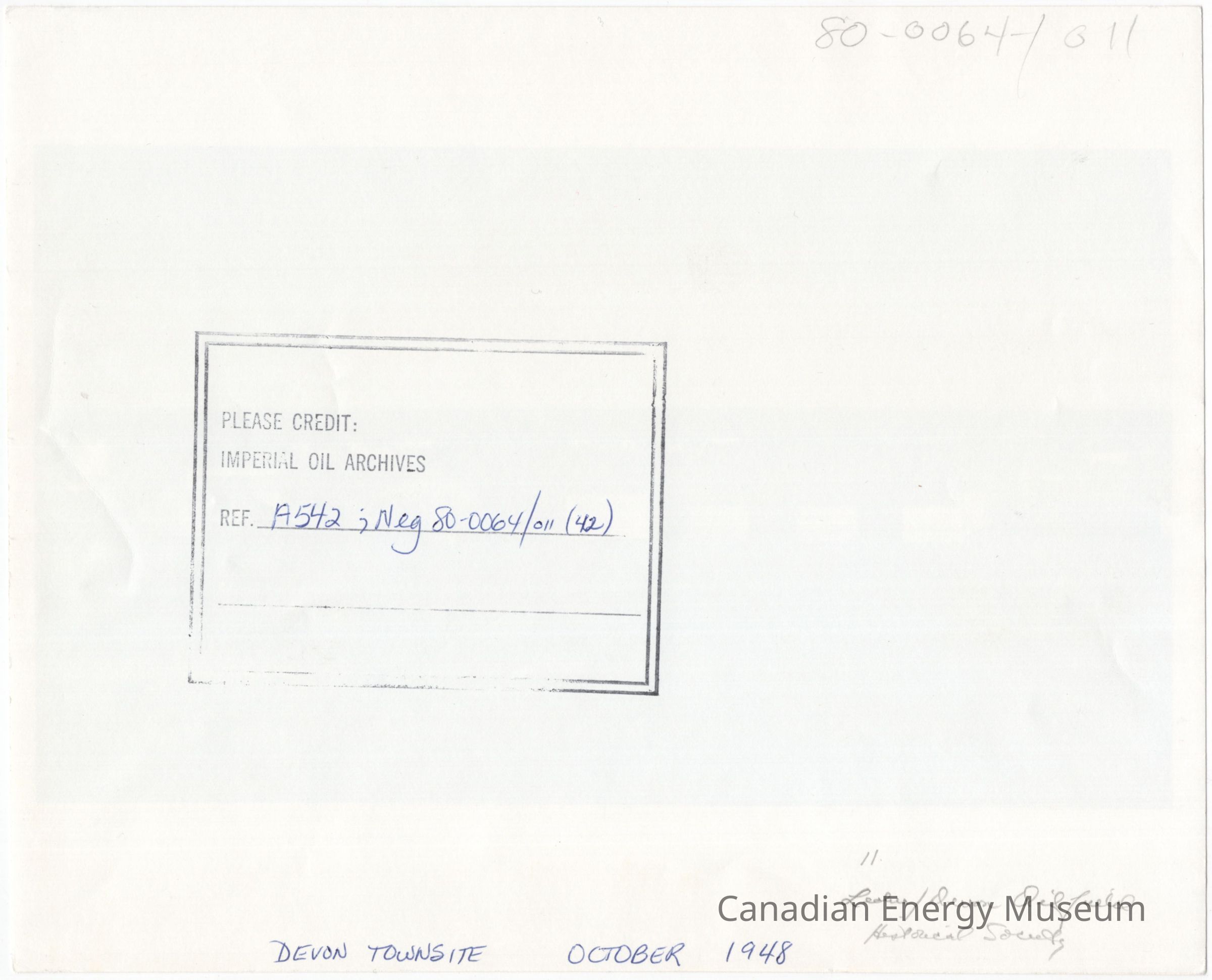 On the reverse of the print is a stamp from "IMPERIAL OIL ARCHIVES" with the handwritten blue ballpoint text "A542; Neg 80-0064/011 (42)". Additionally, "80-0064/011" is written in pencil in the top-right corner; "11; Leduc/Devon Oilfield Historical Society" in pencil in bottom-right corner; and "DEVON TOWNSITE; OCTOBER 1948" in blue ballpoint on the bottom-centre.Collection