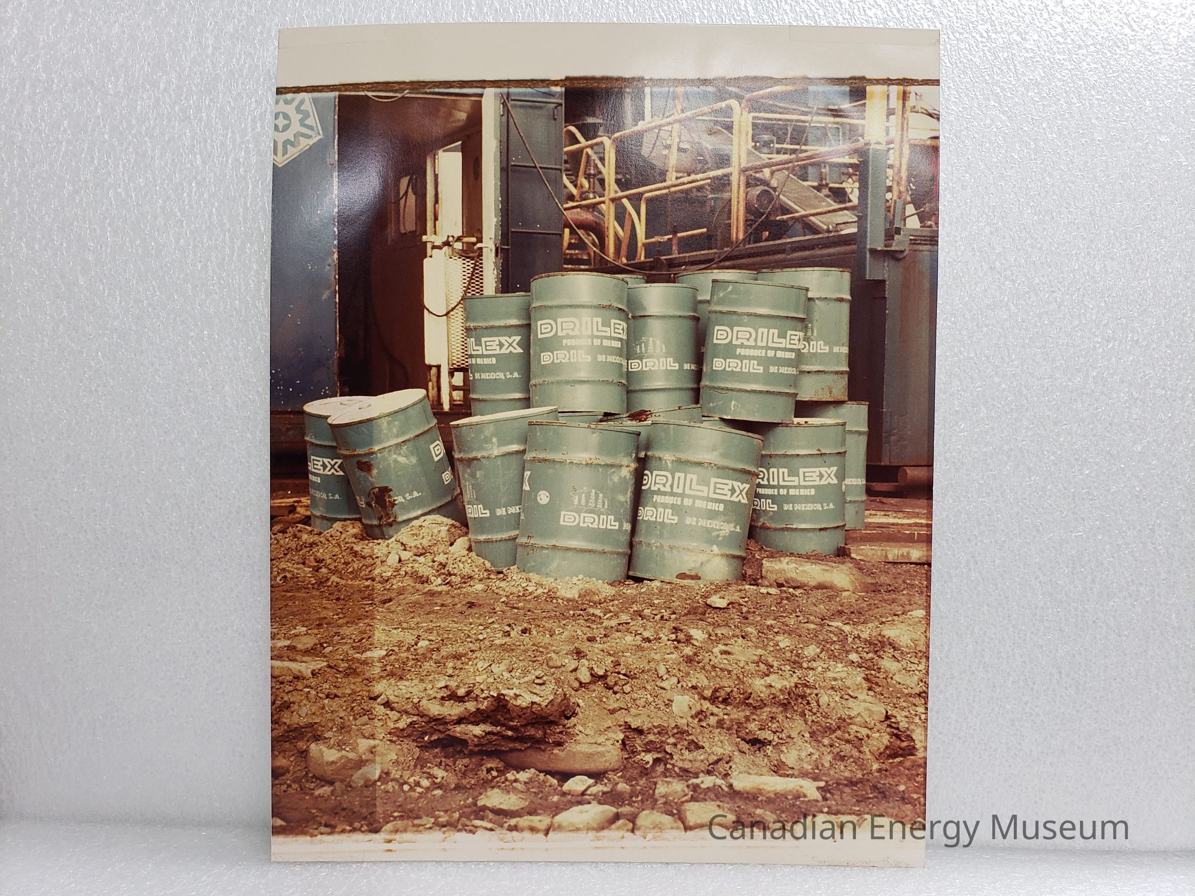 An oversized photo print in colour (brown and blue hues, matte), featuring a pile of roughly 18 Drilex branded metal oil barrels, positioned in front of a metal doghouse and the base of an oil rig, and on loose dirt.