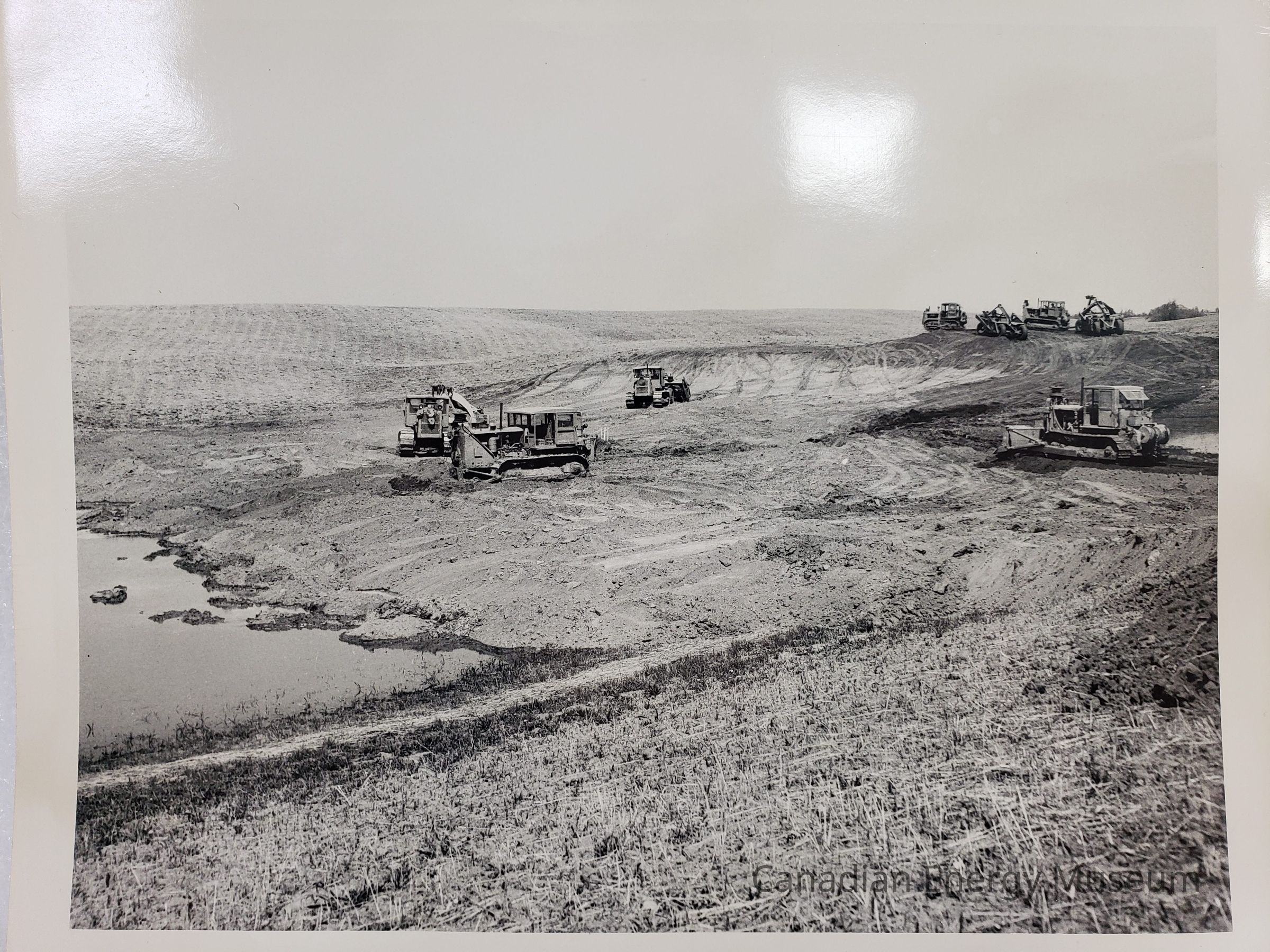 A large, black and white photographic print of a field with FOUR bulldozers in the mid-point, and FOUR bulldozers in the background. In the left-foreground is a small body of water. On reverse is handwritten in black ink "1806; 5; May 5"; a sticker branded to [Ransom/Ransoy/Ransory?]; a green stamp reading "12514-118th Avenue; EDMONTON Phone 83770"; and handwritten pencil text reading "PM S[??]; On 10.35".