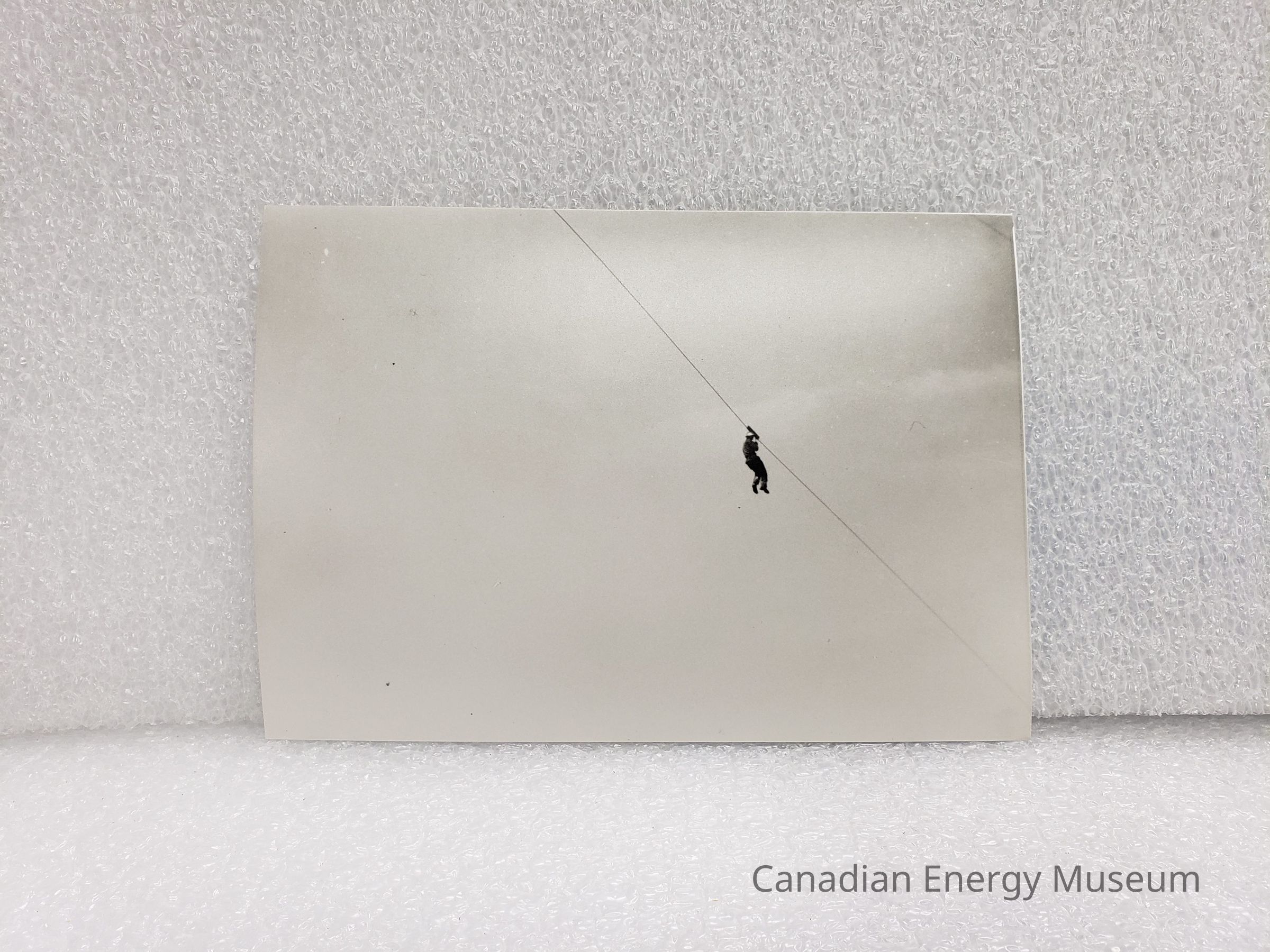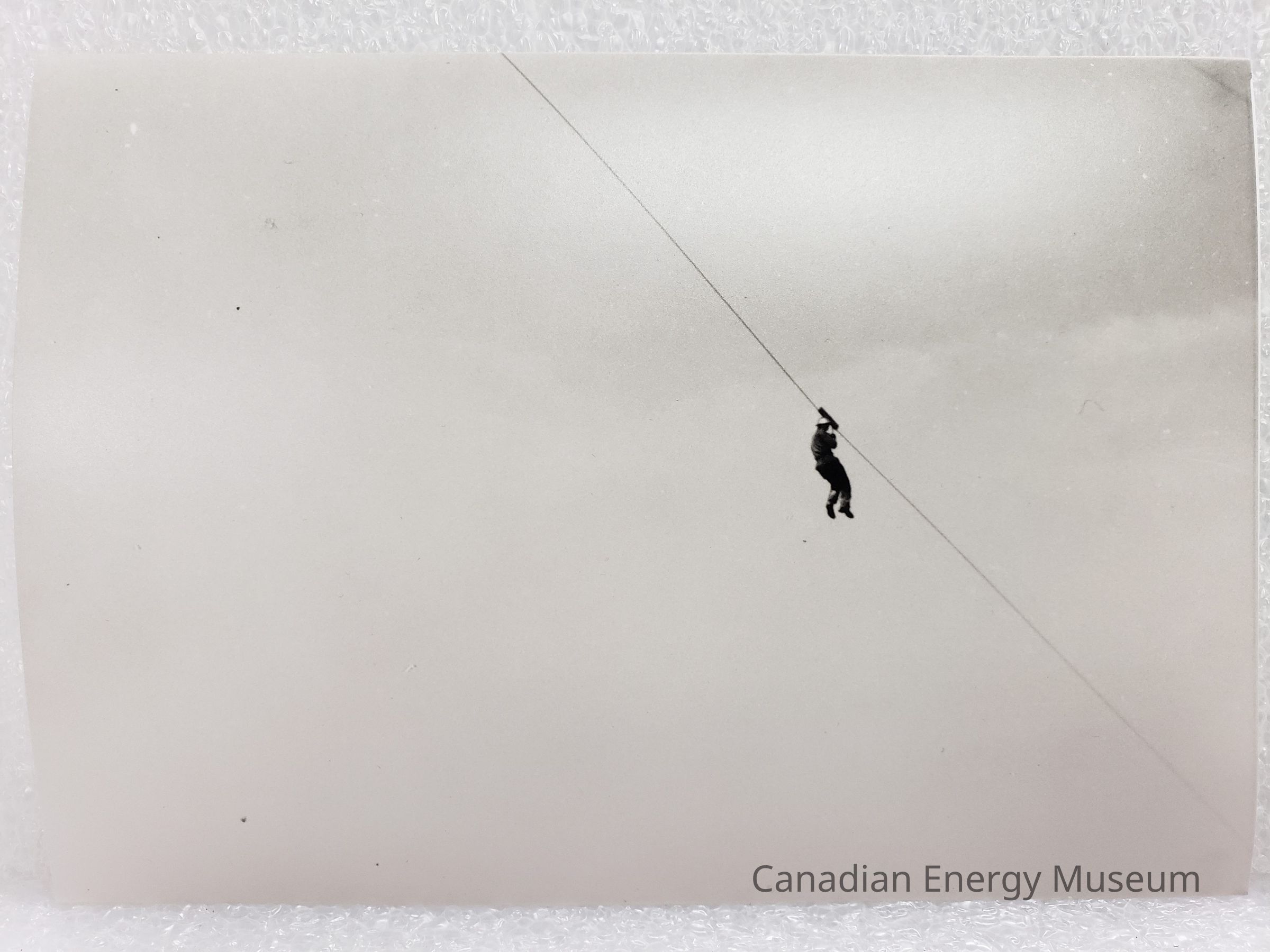 A black and white photograph featuring a solo figure on a zipline. The line runs from the top-centre to bottom-right corner of the image, with the figure to the right-of-centre. Figure is wearing dark clothes and a silver hard hat.Collection