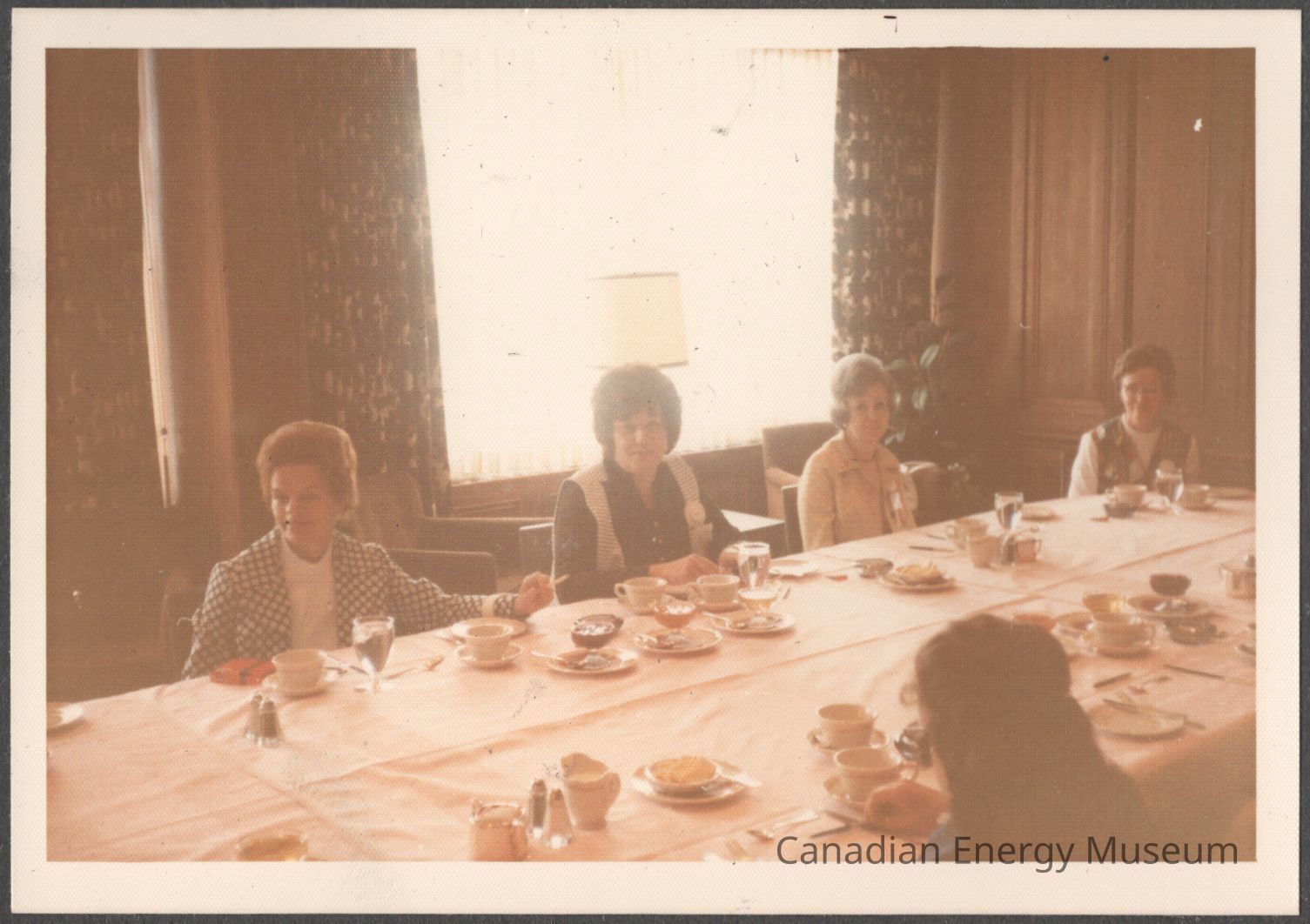 Description: Four of the ladies are facing the camera, with the fifth in the foreground facing away. The table has a white tablecloth, the walls are wood panelled (dark-wood raised/overlay panel wainscoting style), and behind the four ladies is a window with open drapes (dark patterned), closed sheer/lace curtains, and a table lamp centred in front of the window.