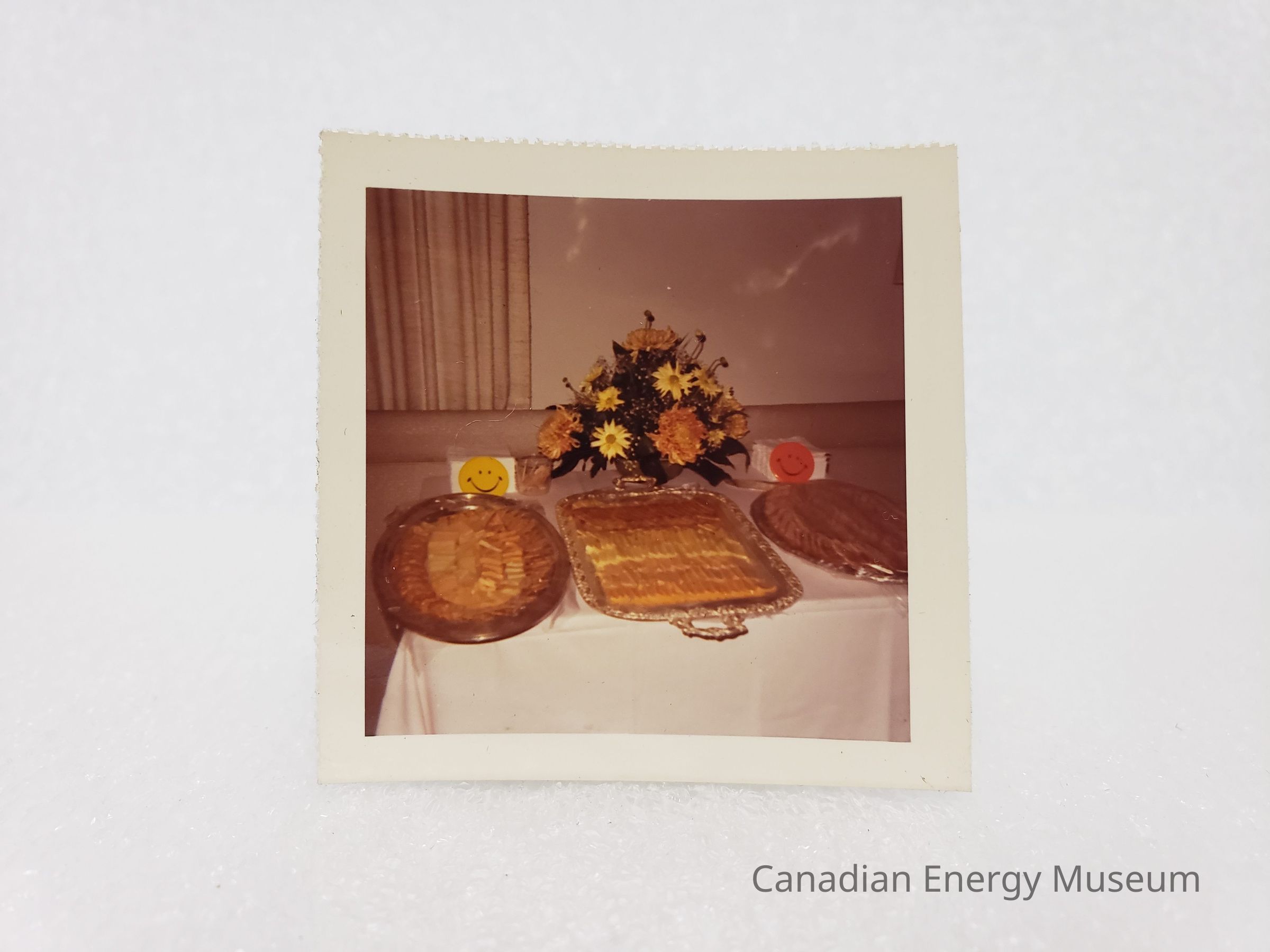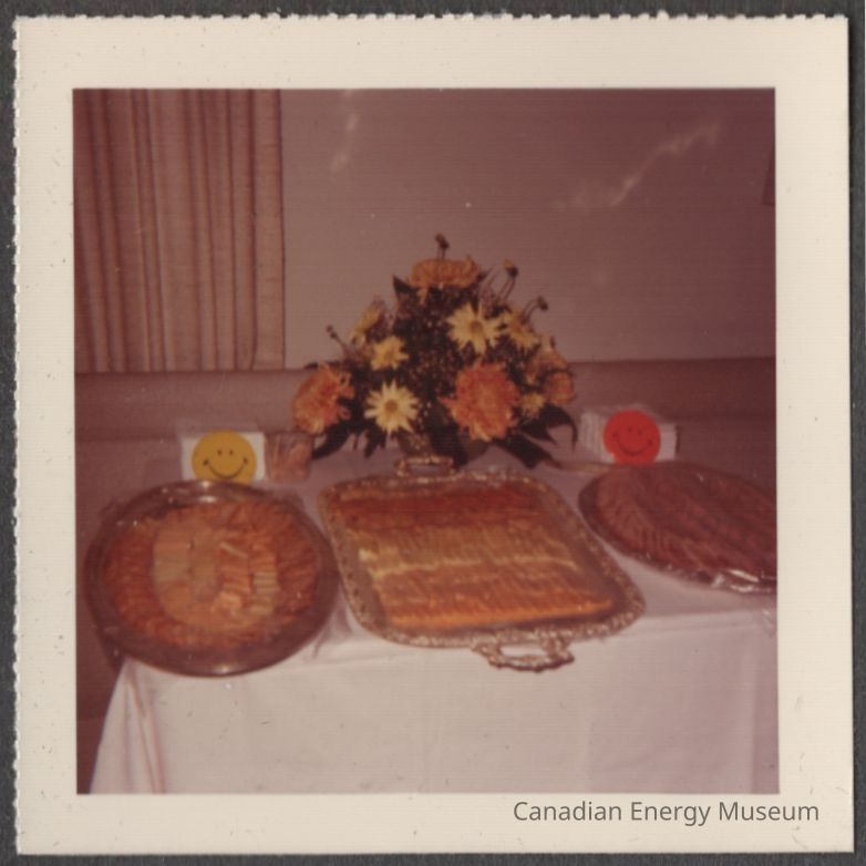 [Photo] Food Platters and Bouquet on Table, Association of Desk and Derrick Clubs, Small, Square , White Border, c.1972Entry/Object ID