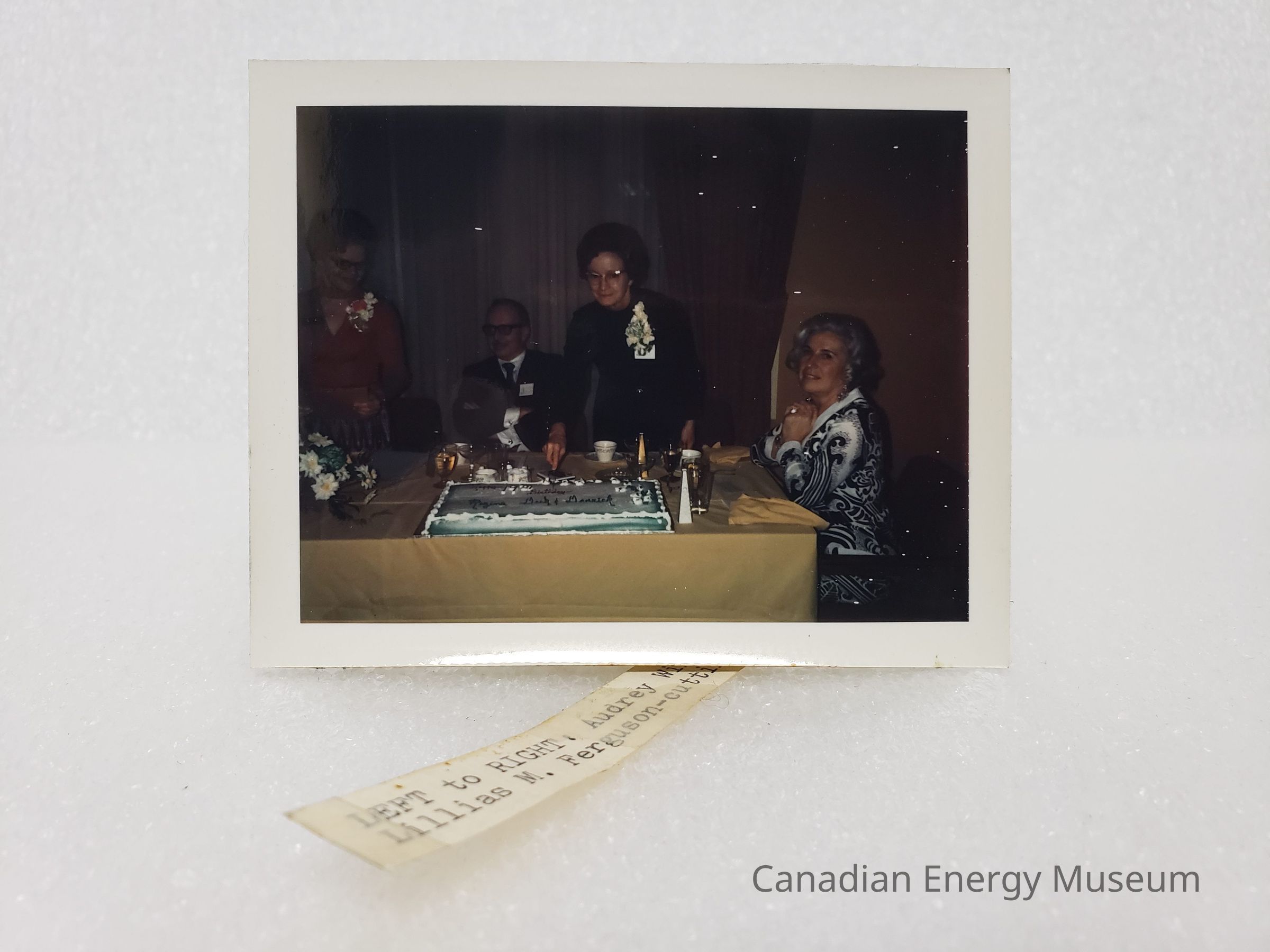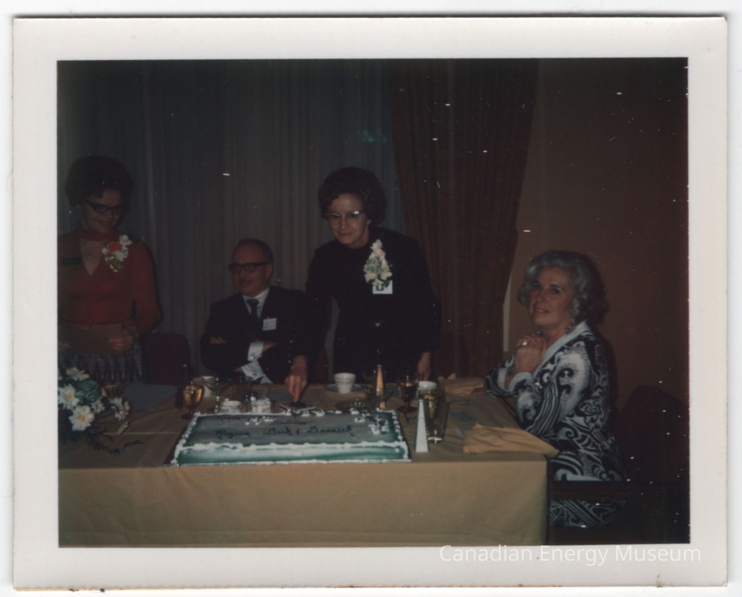 Description: An instant-print photograph of FOUR people standing and seated at a table, on which a sheet cake is being cut. From left-to-right: Audrey Wingert (Regina ADDC President) standing, dressed in a red long-sleeved, v-neck top with a floral corsage, and a grey patterned skirt; Lloyd O. Robinson (event speaker) seated, dressed in a dark suit and tie, with a white/silver dress shirt and name tag; Lillias M. Ferguson (ADDC Region VII Director) standing and cutting the cake, dressed in a black long-sleeved dress with floral corsage and name tag (2004.2.179); and Doreen Dailey (1968 Regional Director) seated and looking directly at the camera, dressed in a black and white swirl-patterned long-sleeved dress. The table has a yellow/gold tablecloth, and is adorned with a bouquet of flowers (left-of-frame), assorted glassware, tea/coffee cups and saucers, matching napkins, and two tall pyramid decor. At the centre or frame, on the table is the sheet cake, which is white and turquoise, with piped edges and blue/turquoise text on top. Behind the people and table is a tan/yellow wall, with a large window, white sheer curtains (closed), and brown/red drapes (open).