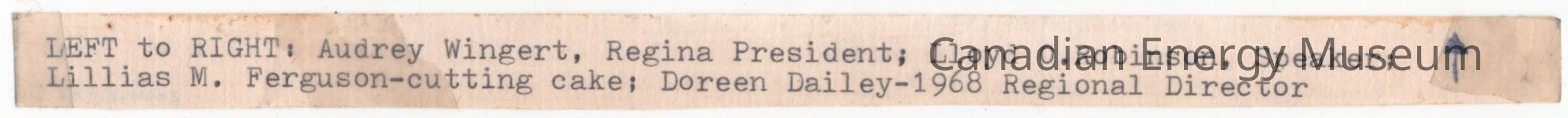 Accompanying the photograph in the scrapbook was a long, narrow strip of paper, on which is typewritten "LEFT to RIGHT: Audrey Wingert, Regina President; Lloyd O. Robinson, Speaker; Lillias M. Ferguson-cutting cake; Doreen Dailey-1968 Regional Director", with a hand drawn (in blue ballpoint) arrow pointing up, to the right of the text.