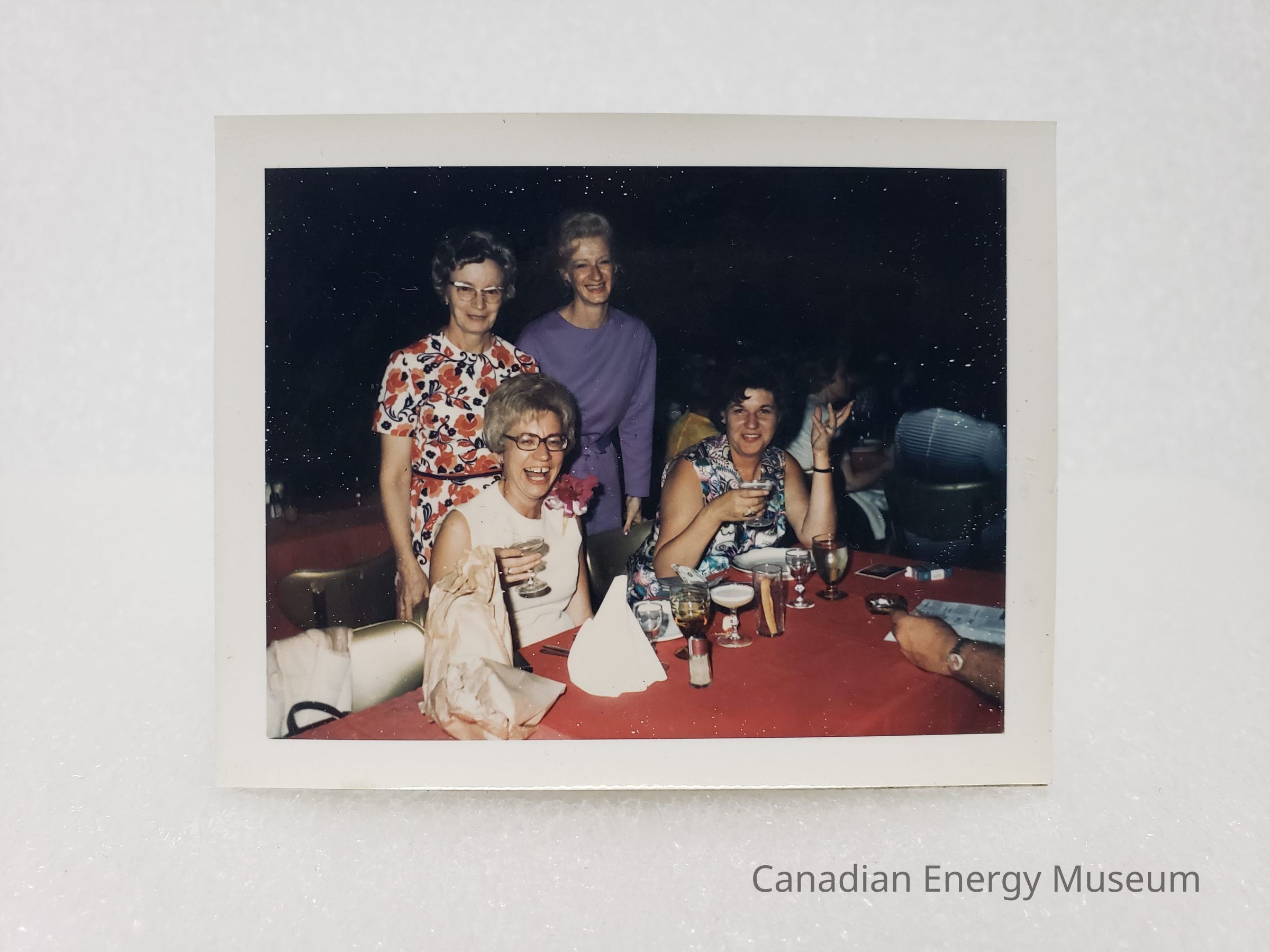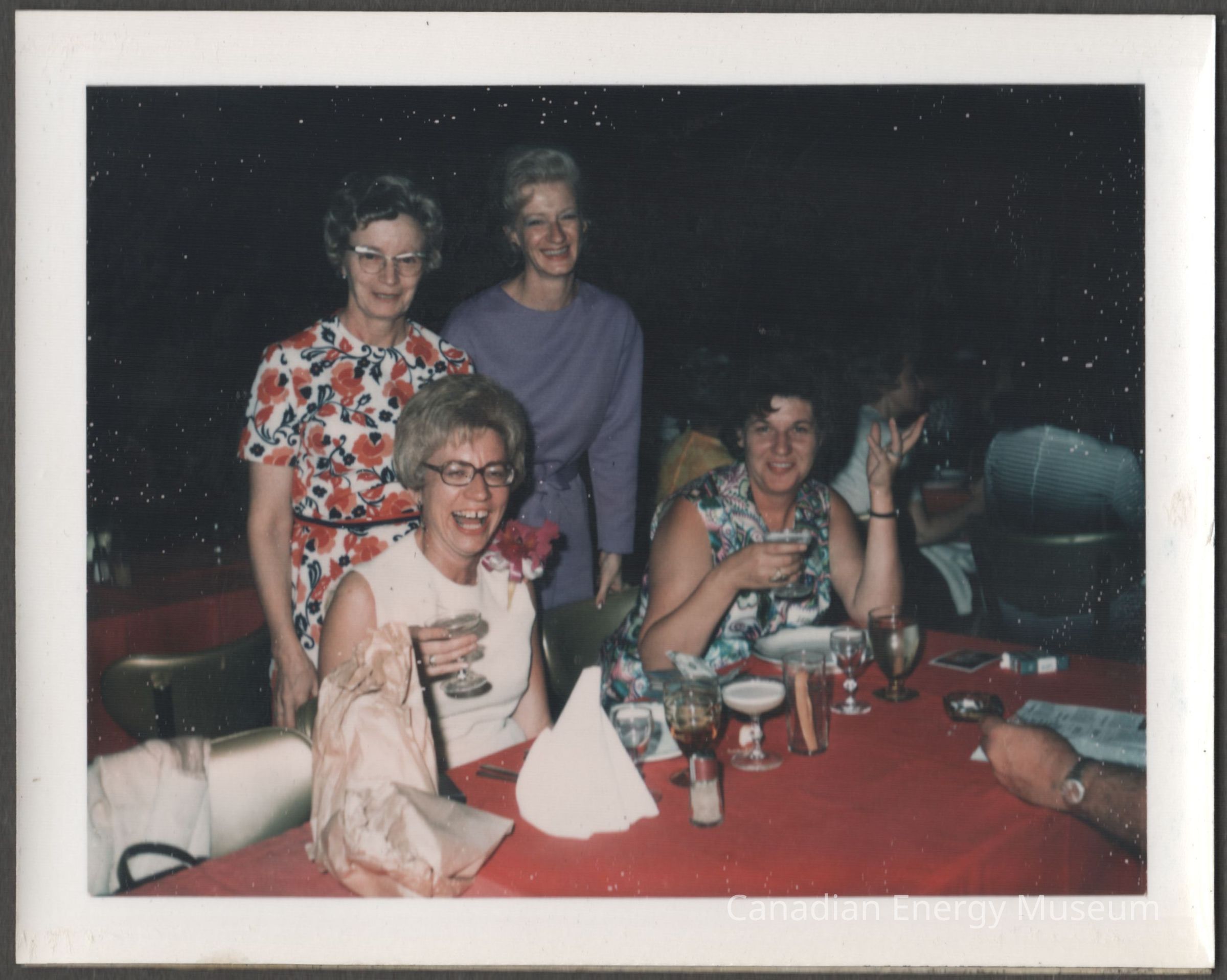 Description: The left seated lady (nearest) is dressed in a white sleeveless dress and glasses, and is holding a drinking glass. The right seated lady (furthest) is dressed in a black and white floral patterned sleeveless dress, holding a glass with her right hand and the left raised in the air. The left (farthest) standing lady is wearing a red and black on white floral short-sleeved dress and horn-rimmed glasses. The right (furthest) standing lady is dressed in a deep dusty blue long-sleeved dress. The table (in front of the group) had a red tablecloth and is covered in plates, drinking glasses, napkins, an ashtray, and a box of cigarettes. In the bottom right corner of the image is a male amr holding a newspaper/print-out. Taken during the 1971 Association of Desk and Derrick Clubs of North America's 20th Annual Convention in San Diego.