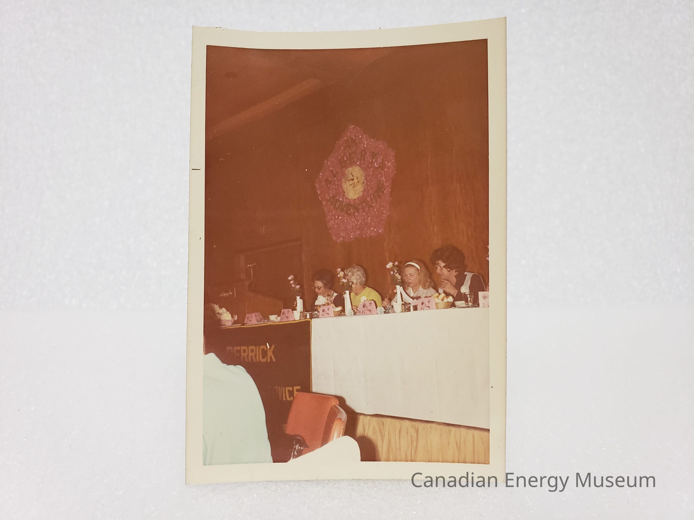 [Photo] Four Ladies Seated at Panel Table with Pengonal Wreath on Wall, Region VII Meeting Calgary, Association of Desk and Derrick Clubs, Portrait, White Border, c.1972Entry/Object ID
