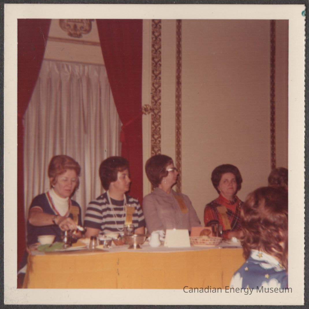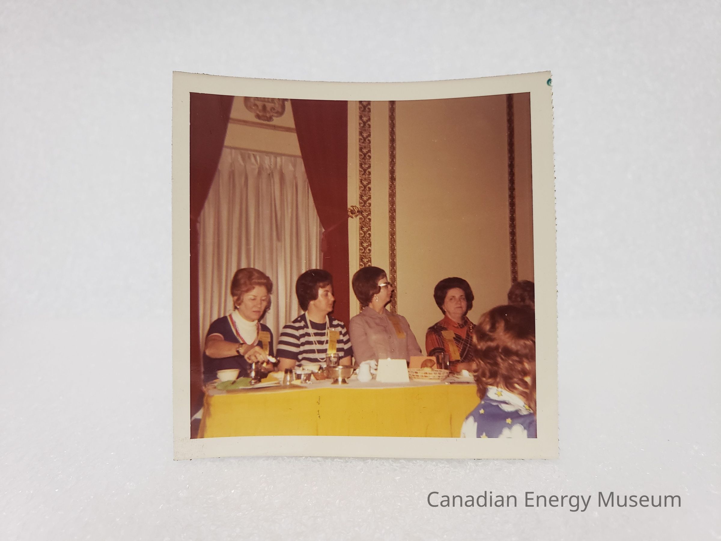 [Photo] Four Ladies Seated at Yellow Table, Association of Desk and Derrick Clubs, Square, White Border, c.1972Entry/Object ID