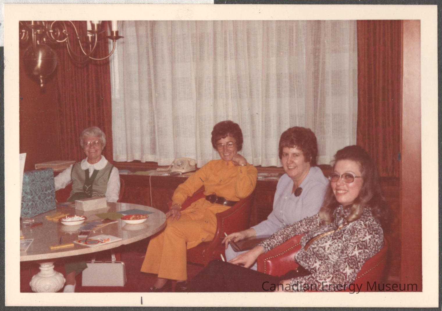 Description: In order from left to right: a lady in a striped olive-green and white vest with a white long-sleeve blouse, olive-green pants, and a white handbag at her feet; a lady in a mustard-yellow jumpsuit with a brown belt; a lady in a powder-blue button-up cardigan with a large brooch and holding a cigarette; and a lady in a brown/maroon and white patterned blouse with a gold and black ribbon and holding a cigarette. The ladies are seated in maroon armchairs, and in front of the ladies and to the left of the image is a circular table with snacks, papers/documents, and two wrapped gifts. Among the documents on the table are two copies of a Calgary Tower souvenir postcard booklet, one of which we have in our collection as an item from this scrapbook (2004.2.276). Behind the ladies is a low, dark wood shelf below a large window covered in sheer curtains, and open maroon print drapes. On the shelf is a cream rotary dial telephone in the centre and a large album to the left. To the top-left of the image is a chandelier light fixture.