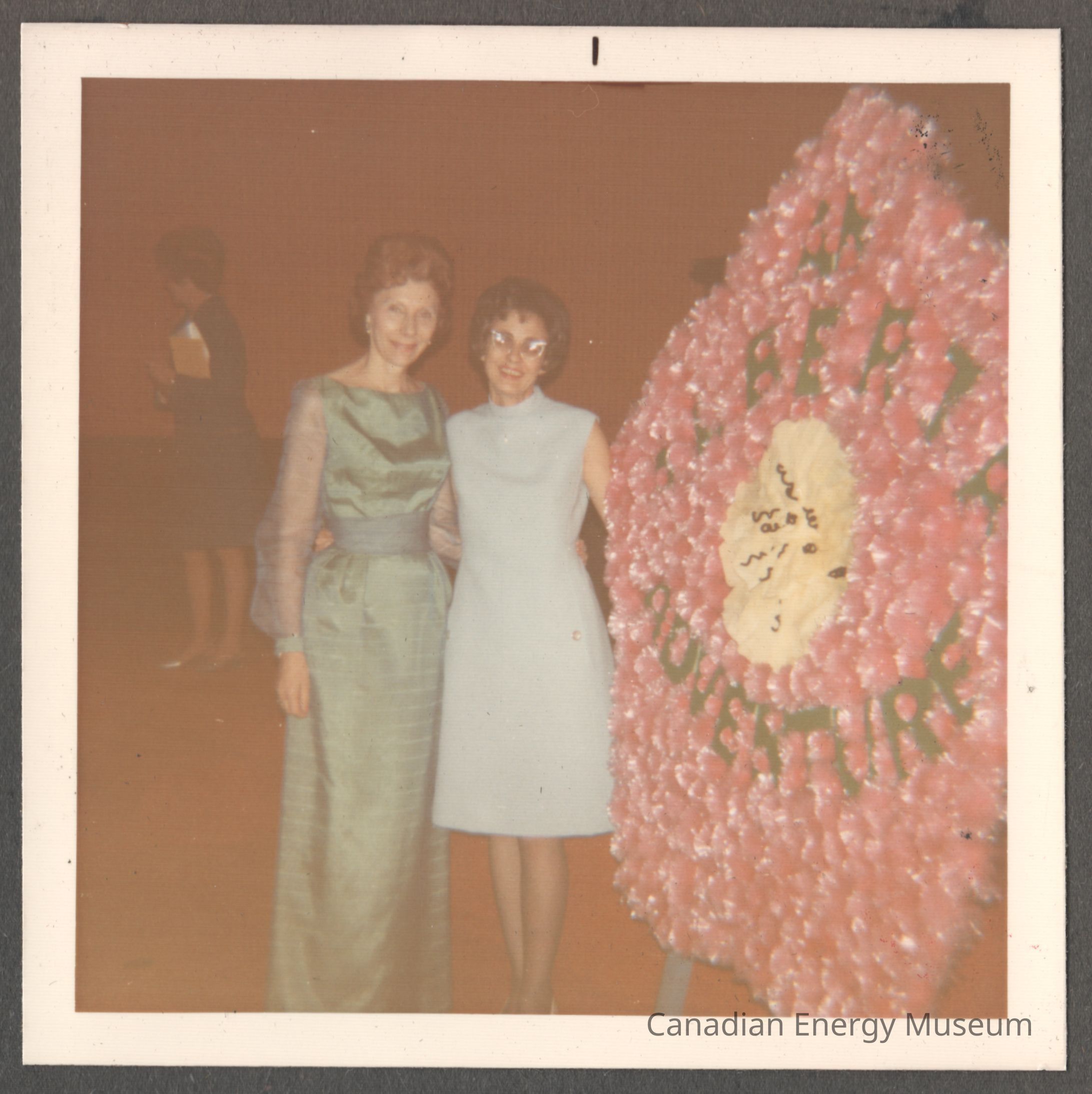 [Photo] Frances Hidell and Lillias Ferguson Beside Flower Wreath, w/ Label, Square, White Border, c.1972Entry/Object ID