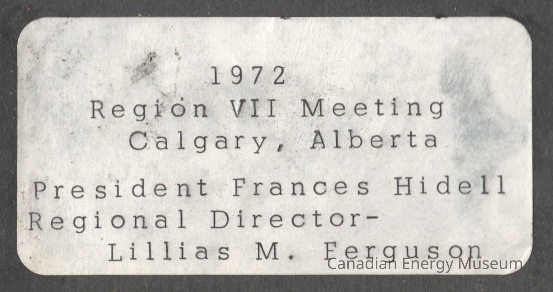 Accompanying the photograph (via proximity on the scrapbook page and context) is a white adhesive label with the typewritten text "1972; Region VII Meeting; Calgary, Alberta; President Frances Hidell; Regional Director - Lillias M. Ferguson".