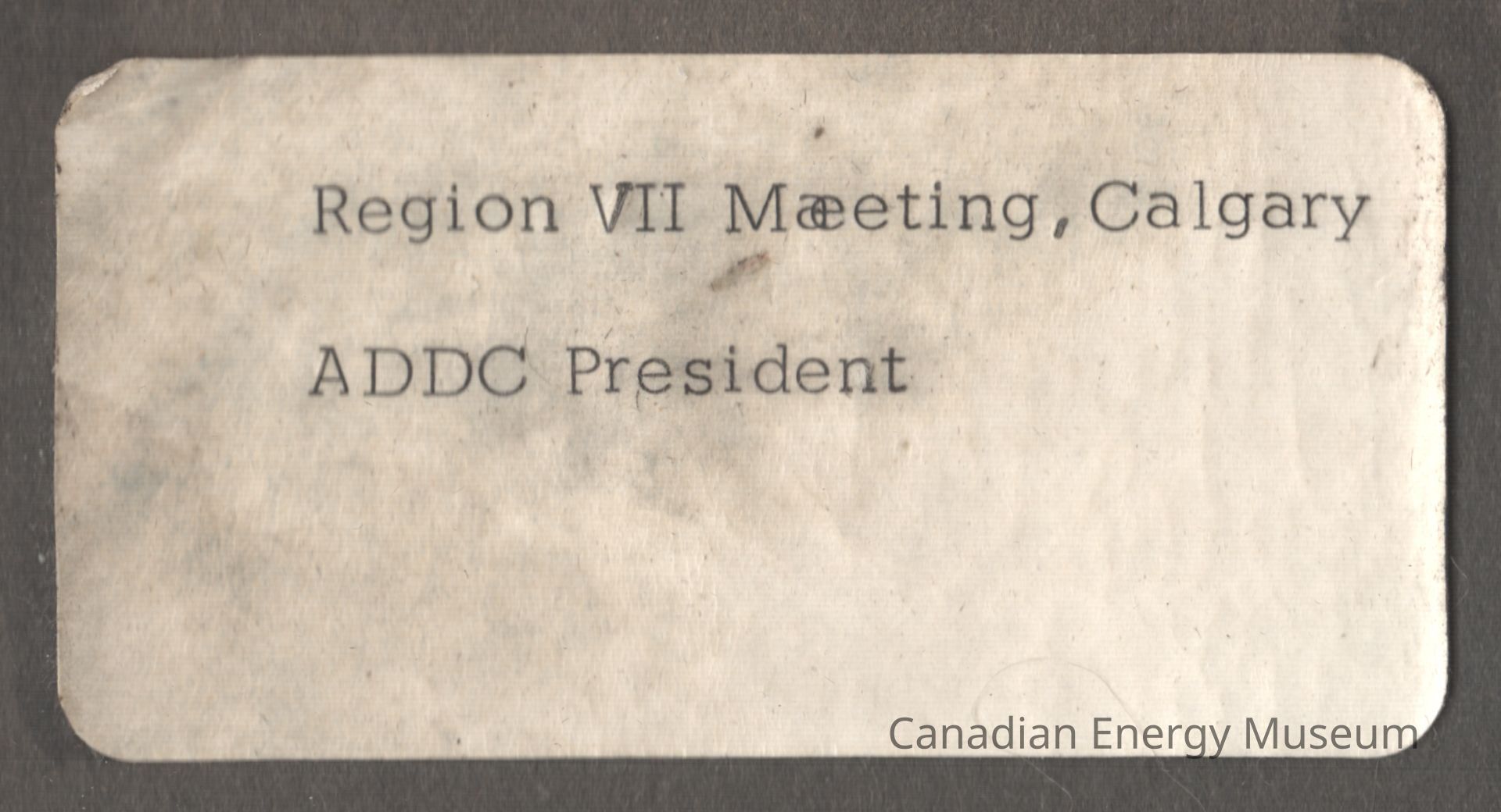 Accompanying the photograph (via proximity on the scrapbook page and context) is a white adhesive label with the typewritten text "Region VII Meeting, Calgary; ADDC President".