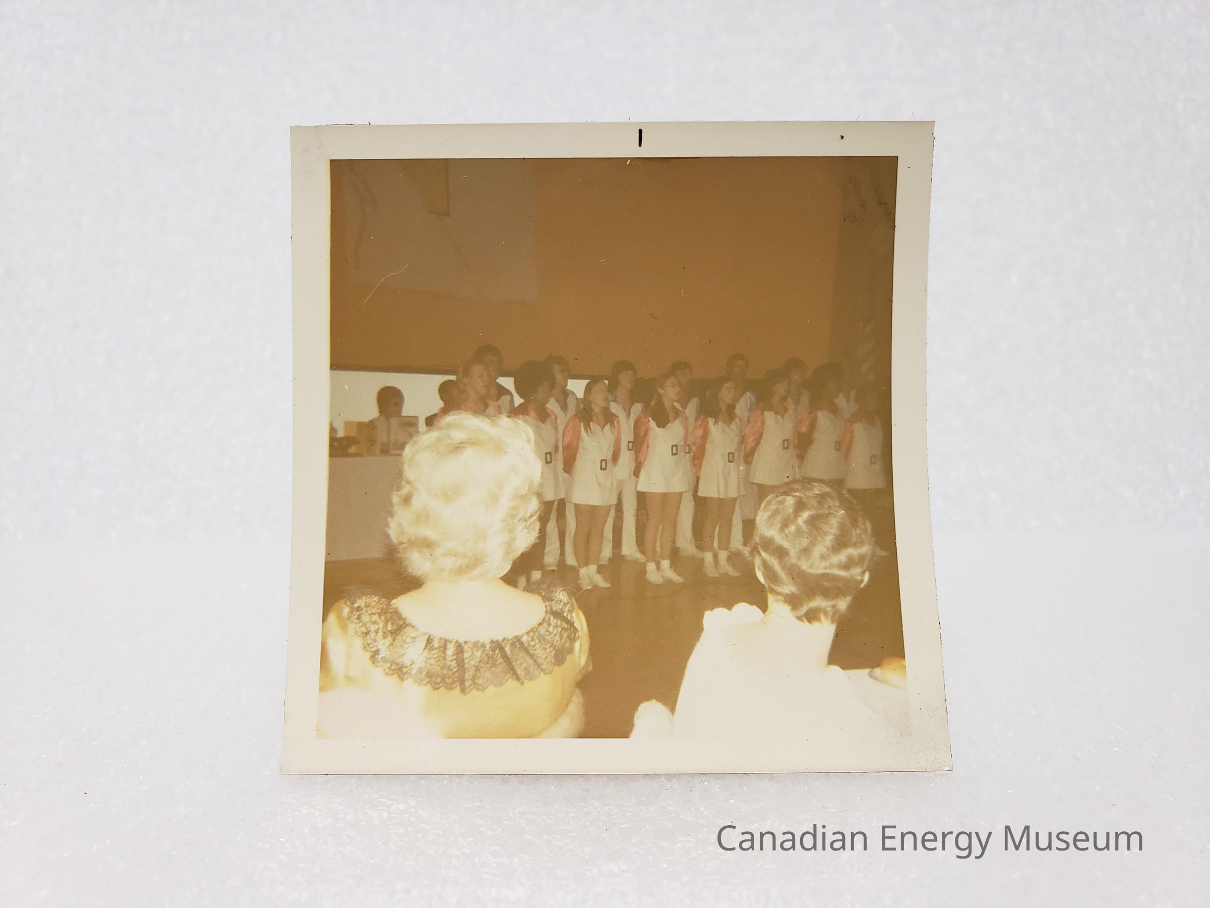A medium-sized square photographic print, with a white border. The image is of a line of roughly fifteen men and women in matching outfits, performing to a seated audience.