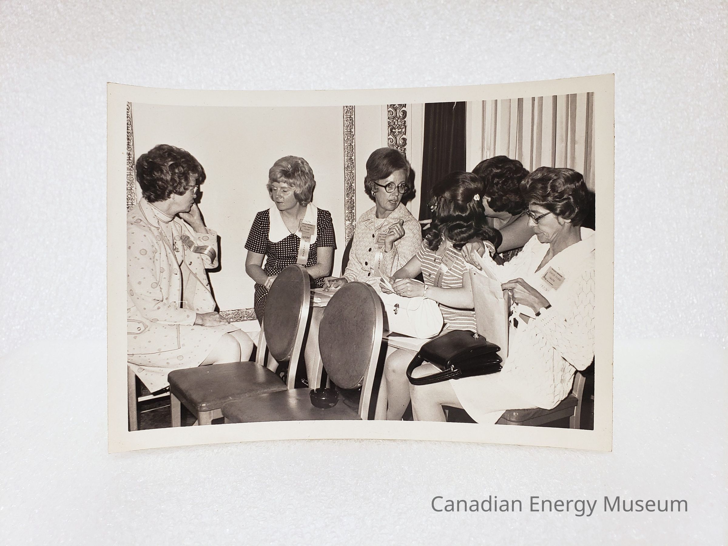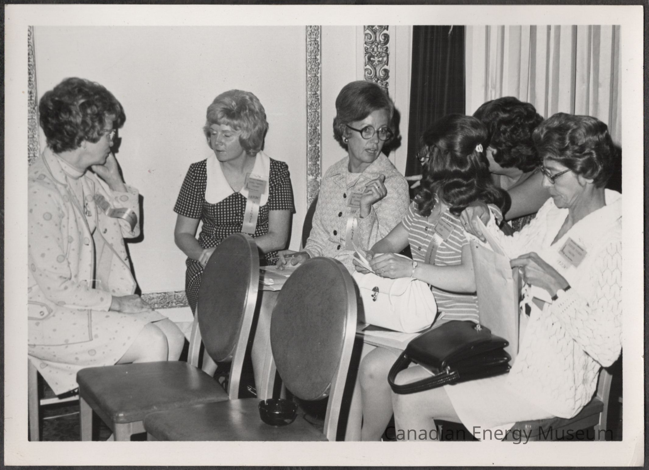 Description: Shows six women seated in conference chairs, facing each other mid-conversation(s). From left-to-right: Lillias Ferguson (ADDC Region VII Director, Edmonton) facing right-of-frame, speaking to the last to the right of her, dressed in a matching light-coloured circle-design patterned dress and jacket combination, and a name badge with "ADDC OFFICER" ribbon; an unidentified lady (she appears to be a Delegate from Calgary) facing left-of-frame towards Ferguson, dressed in a black with white square-patterned and white collar dress, and a name tag with "ADDC DELEGATE" ribbon; an unidentified lady facing to the right-of-frame towards her neighbour, dressed in a light patterned matching blazer and dress with black buttons, with a name tag with "ADDC DELEGATE" ribbon and two document filed on her lap with a pen in hand; an unknown lady facing away from the camera to the left-of-frame, dressed in a white and light-coloured horizontal striped short-sleeved top/dress and a name tag with "ADDC DELEGATE" ribbon, and holding a white handbag resting on a file folder on her lap; and unidentified lady facing left-of-frame, mostly out of view behind the previous lady; and an unidentified lady (possibly from Chicago), facing left-of-frame, dressed in a white knit sweater and name tag with "ADDC DELEGATE" ribbon, and she is looking down at documents in a manila envelope while a black handbag rests on her lap. Two empty seats are visible in front of the group, to the right-of-frame is a window with drawn white curtains and open heavy dark drapes, and on the wall to the left are decorative painted plaster bands.