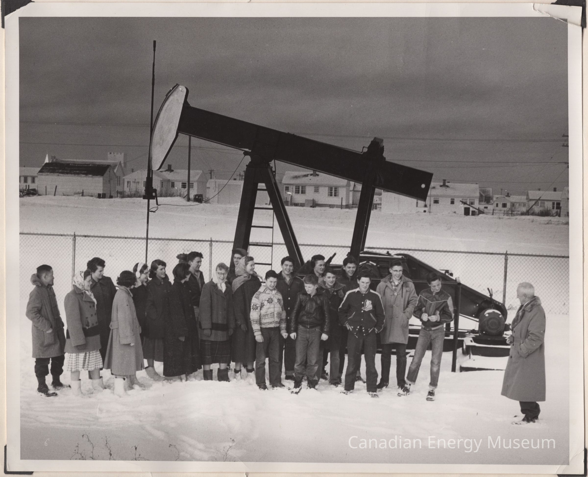 Photograph Description: A group of 20 youth (8 girls, 12 boys), and one adult man to the right. Group is standing in front of a pumpjack, behind which is a chain-link fence. In the background are a line of small houses (back view). Photo is taken in winter, there is snow on the ground and the people are dressed in winter footwear and jackers, some are wearing gloves and headwear.