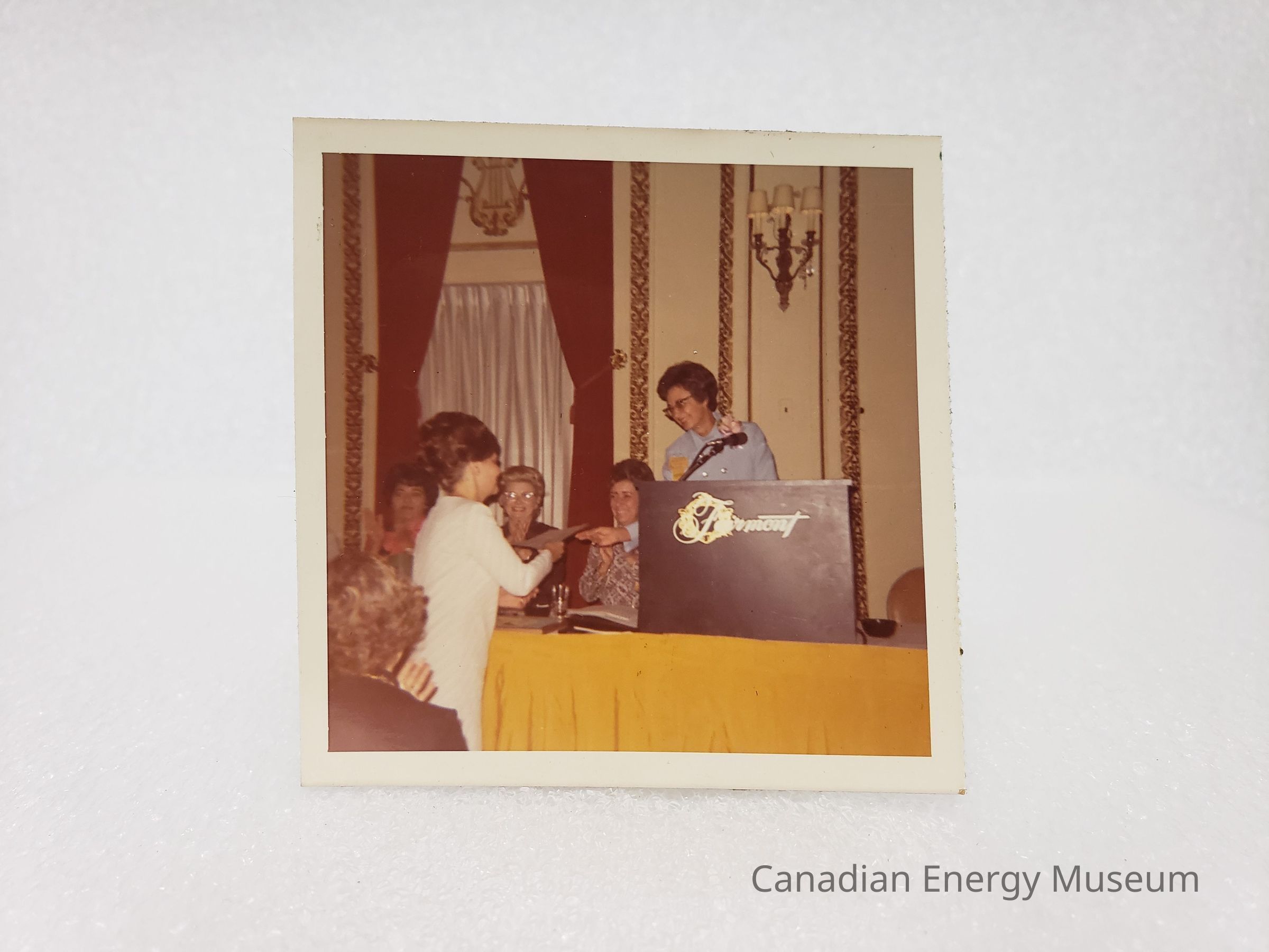 Description: A lady in a white long-sleeved dress receiving a paper certificate/award from a lady dressed in a light-blue jacket and pink corsage, standing behind a podium (reading Fairmont). Between then is a table with a yellow skirt, and behind the table 9tot he left of the podium) are three ladies seated and clapping. The back of a lady in. a black top is visible in the bottom-left corner of the image. Behind is a wall with gold-coloured plaster decorative bands, and a window with closed white curtains and red drapes, as well as a wall sconce.