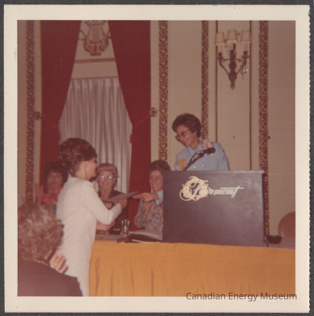 [Photo] Lady in White Receiving Award from Lady at Podium, Association of Desk and Derrick Clubs, Square, White Border, c.1972Entry/Object ID