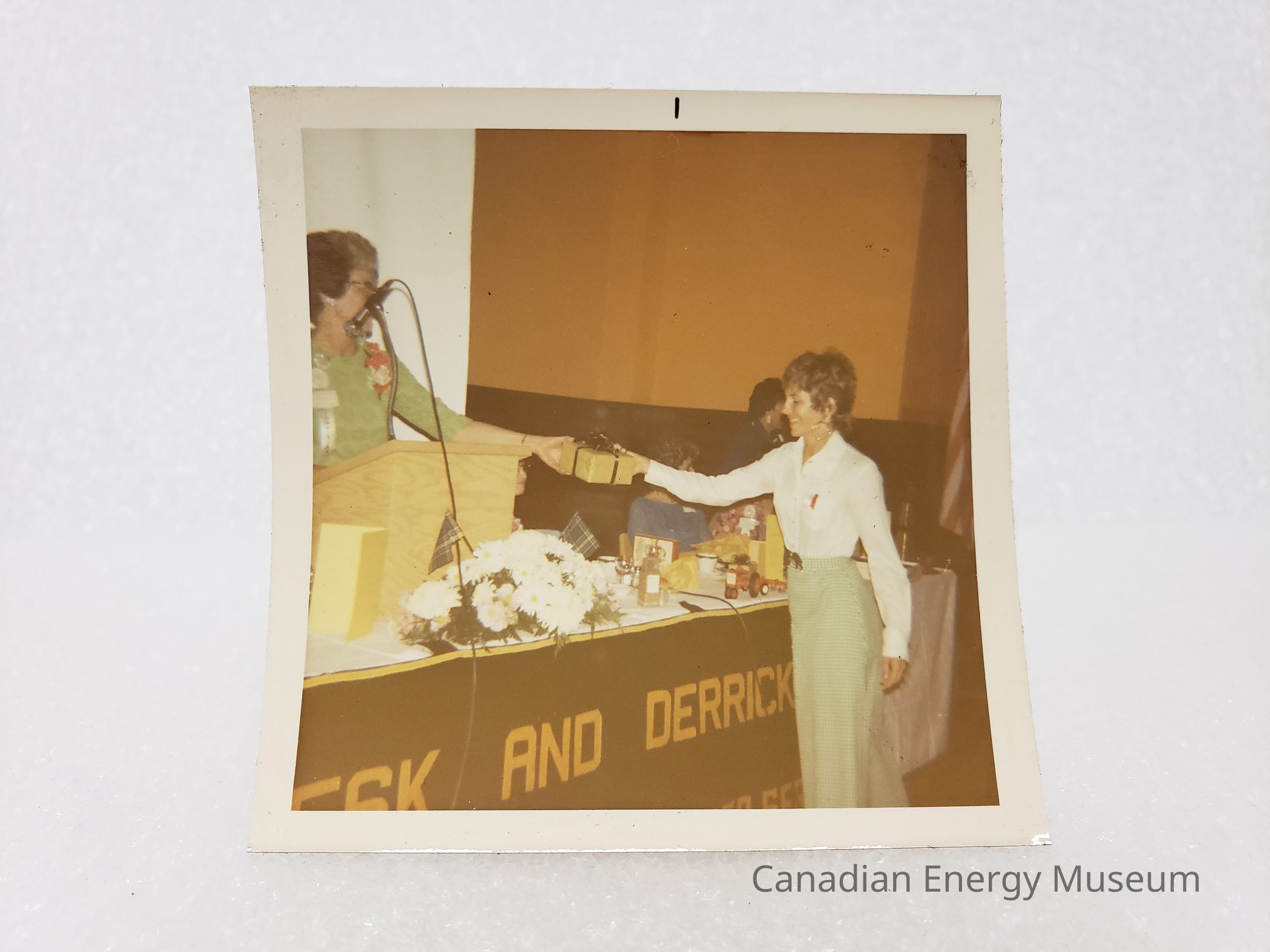 Description: Two ladies are standing, one standing at a wooden podium (partially hidden by a microphone), and the other on the opposite side of the panel table and podium. The first lady (in a green long-sleeves top, with a white ribbon and red corsage) is handing the second (white long-sleeves blouse and pale green long skirt) a wrapped gift box (mustard-yellow with black ribbon). Between the. on the table is a bouquet of white flowers, and assorted other items including a red toy tractor. On the front of the panel table is a black and yellow banner reading "DESK & DERRICK". Three other women are visible seated and standing behind the panel table. To the right-of-frame is the edge of an American flag.